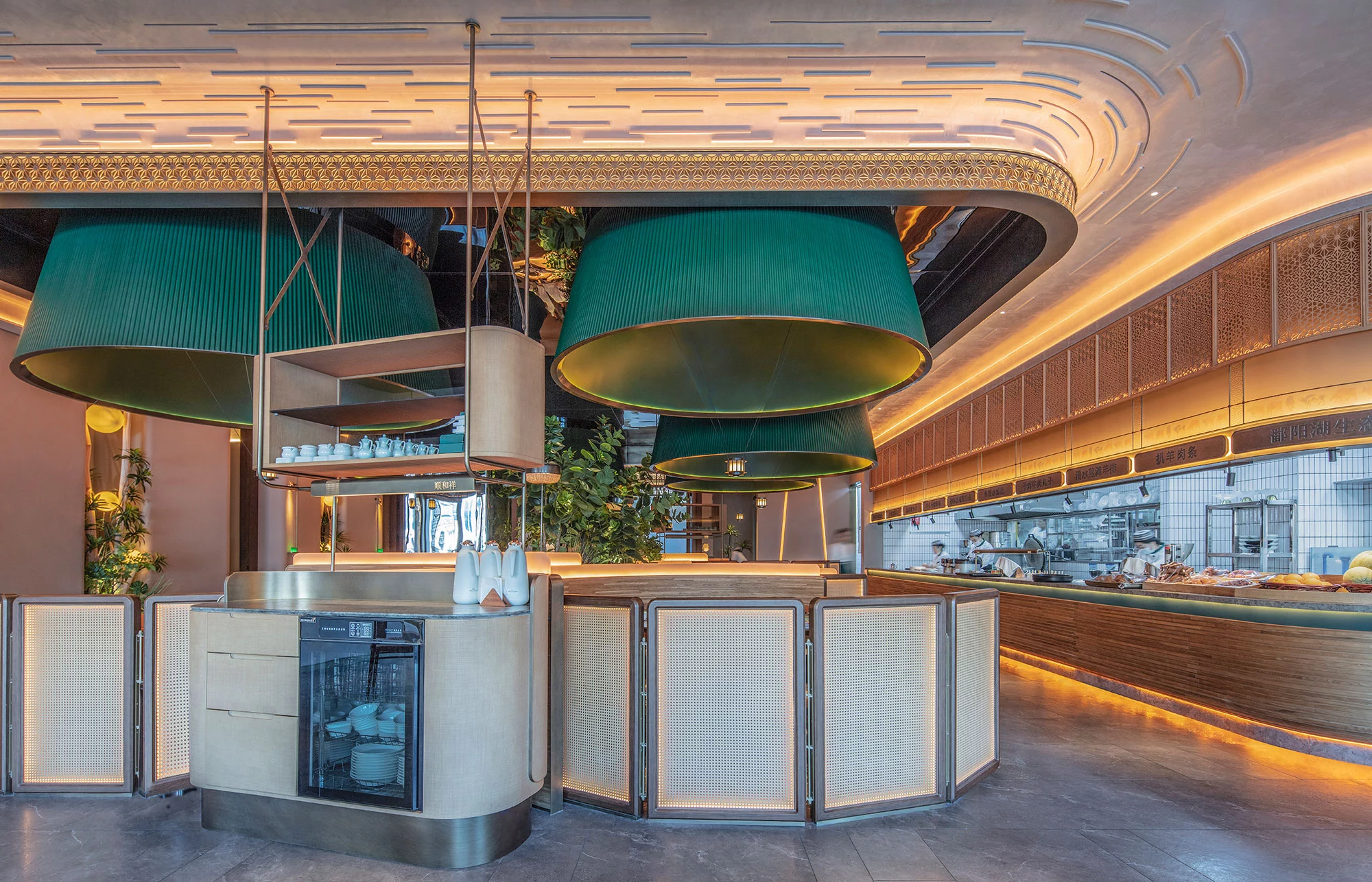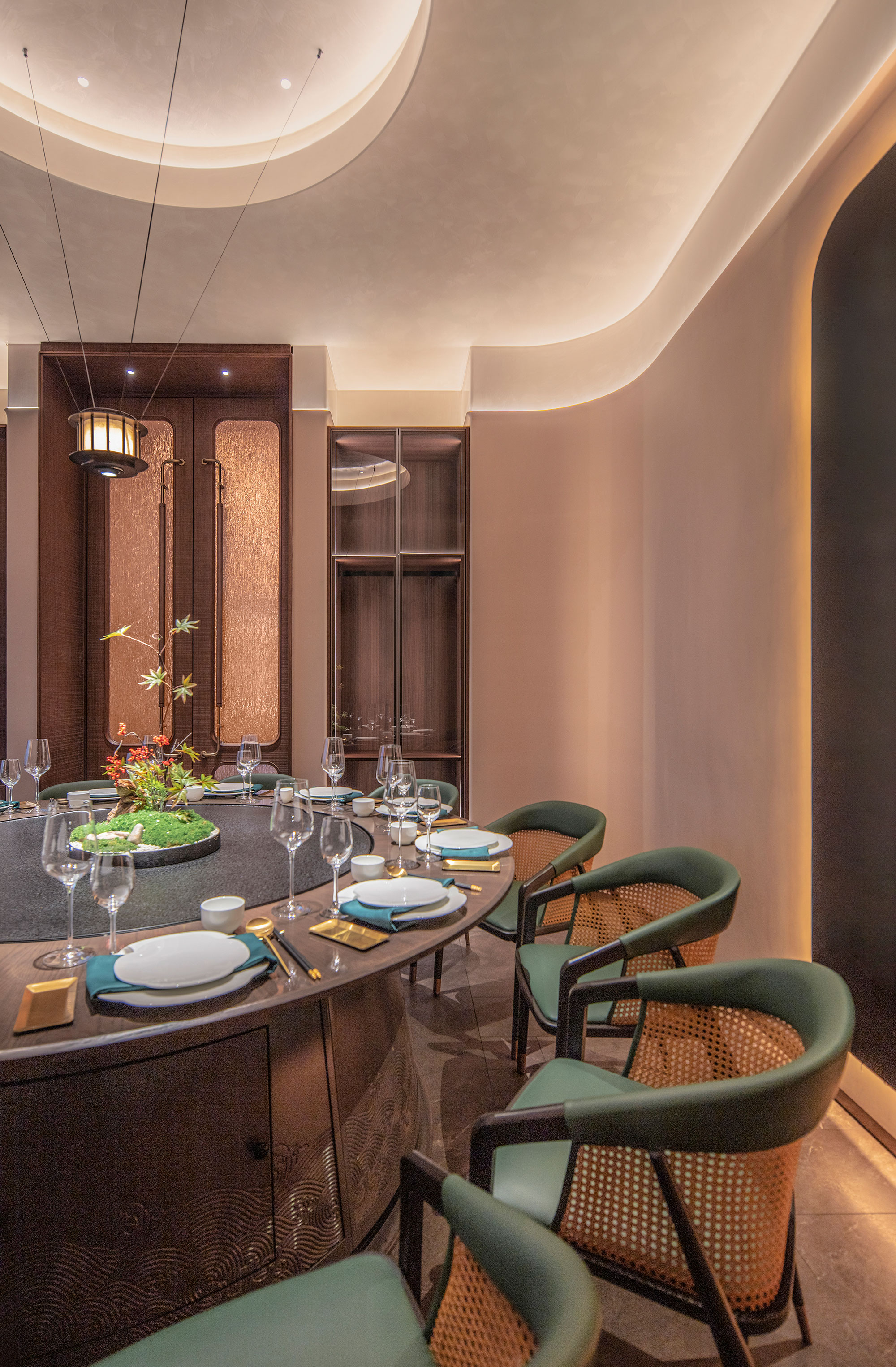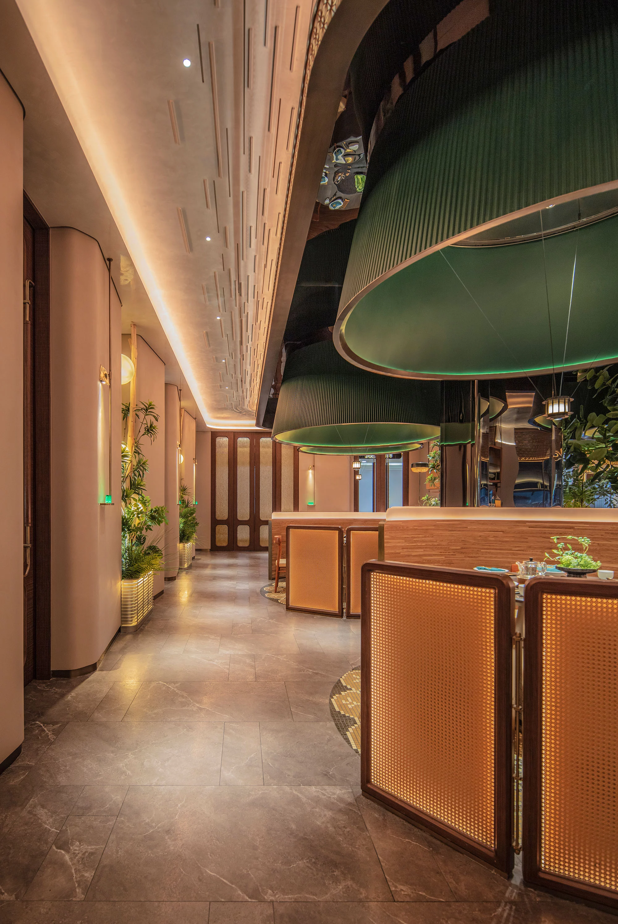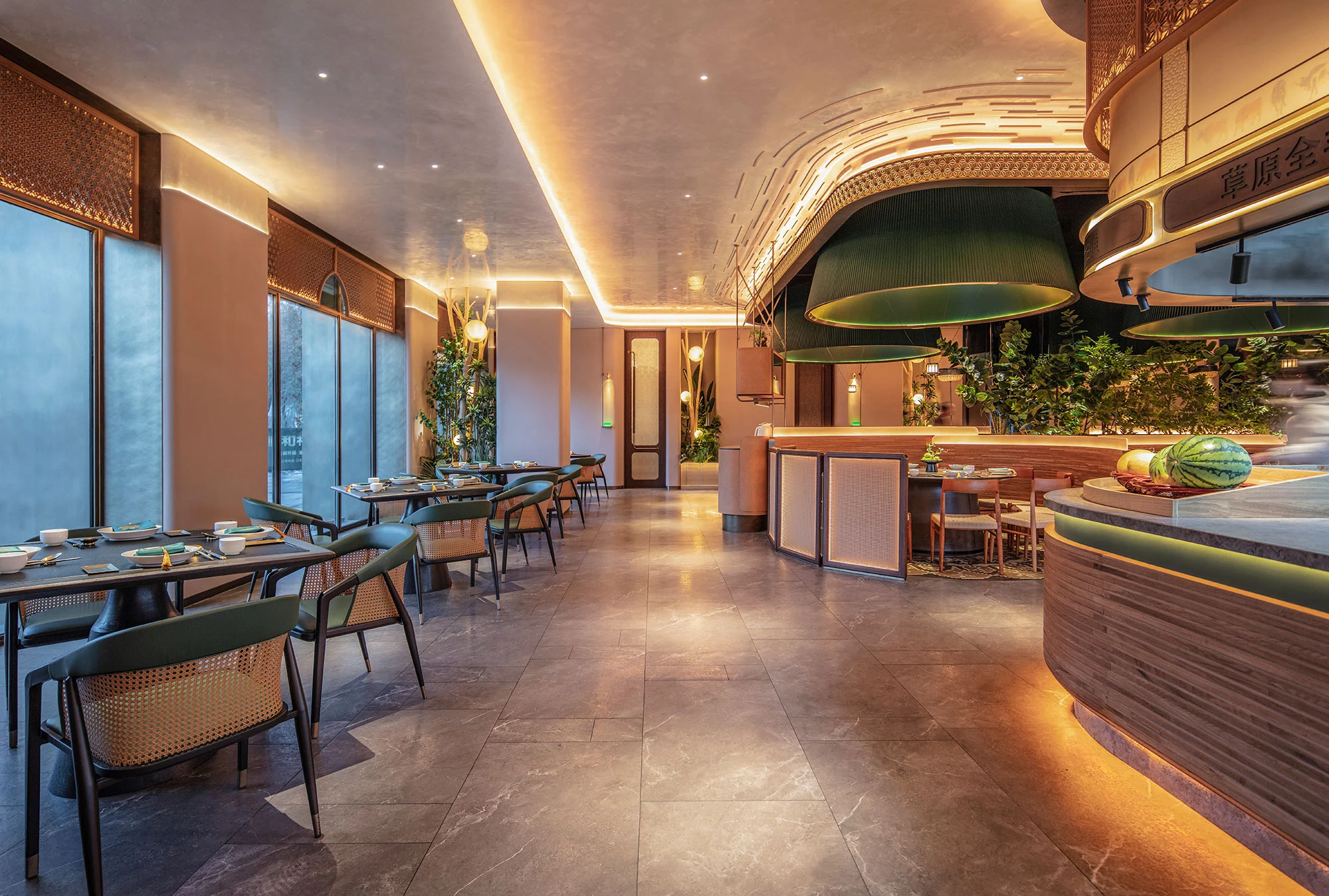 餐厅的座位布置为顾客提供宽敞舒适的用餐区域,同时也考虑到隐私和安静的需求。设计了一些私人包间或分隔区域,以满足不同客人的需求。既有靠近花园的半包围卡包,也有室内的包间。半包围卡包让顾客可以尽情地欣赏花园的美景,感受大自然的气息;而室内的包间则提供了更为私密的空间,适合亲朋好友聚会或者商务洽谈。