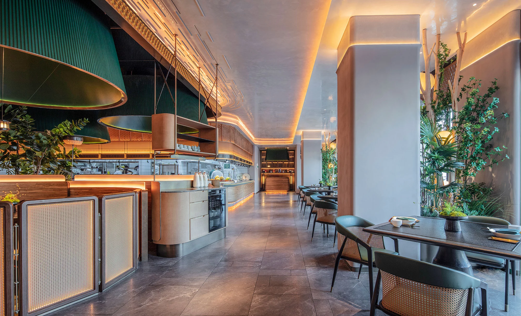 一进入餐厅,首先映入眼帘的是一片绿意盎然的花园,各种绿植和树木簇拥在一起,形成了一个美丽的景观。阳光透过树叶洒在地面上,形成斑驳的光影, 给人一种宁静的感觉。