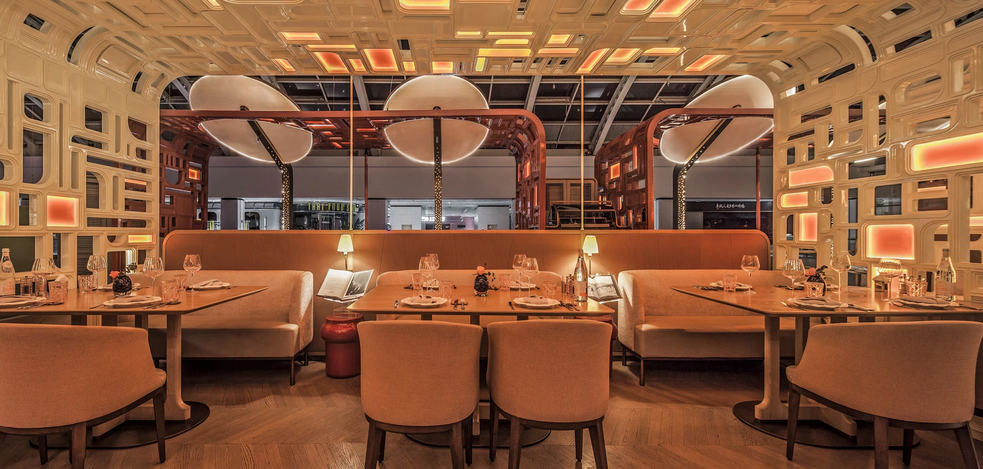 王子扒房坐落在百年老街中央大街上,是时尚与历史并存的核心商业街,在空间上我们体现出了热烈与现代的视觉氛围,此空间是开放式为主的结构形式,有大量的天光洒落在空间里,在餐区运用了盒子的建构形式去增加用餐的氛围感受和空间的层次关系,内部空间的层次推进与不相同的功能属性需求紧密相连,不同色彩的建筑构造是多元化的元素表现,奶油色与玫红色相衬,那就是牛排在空间的延展。