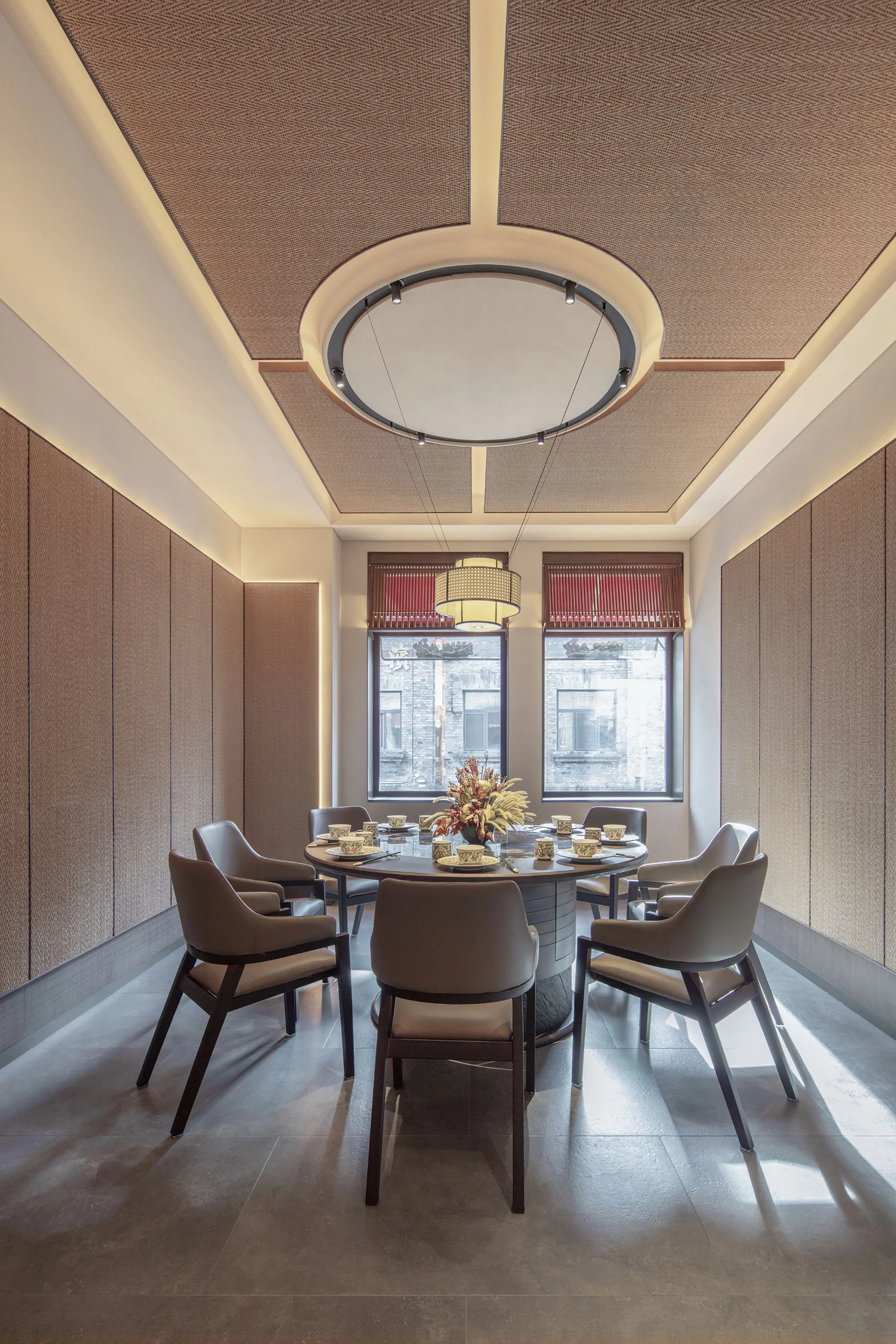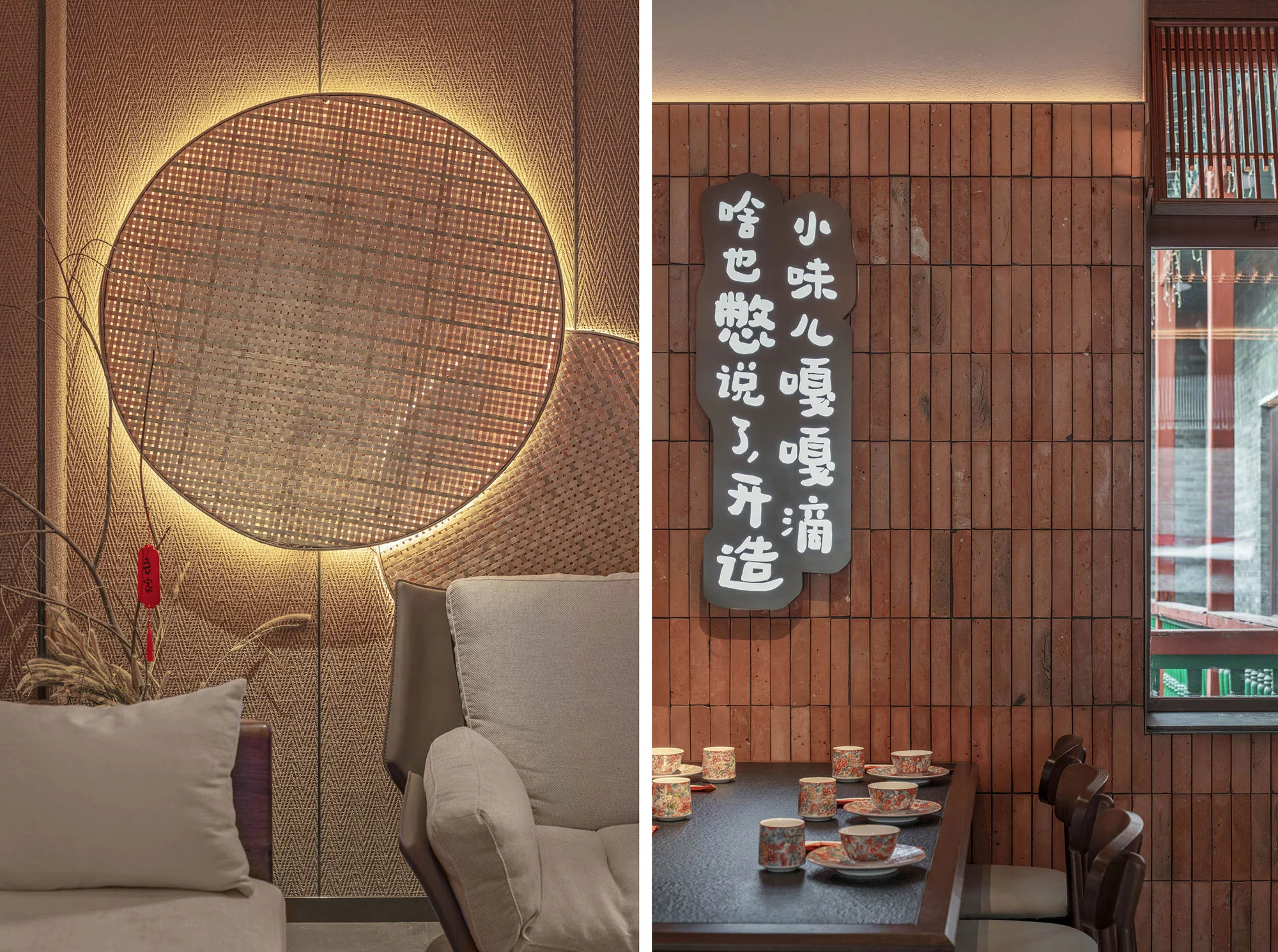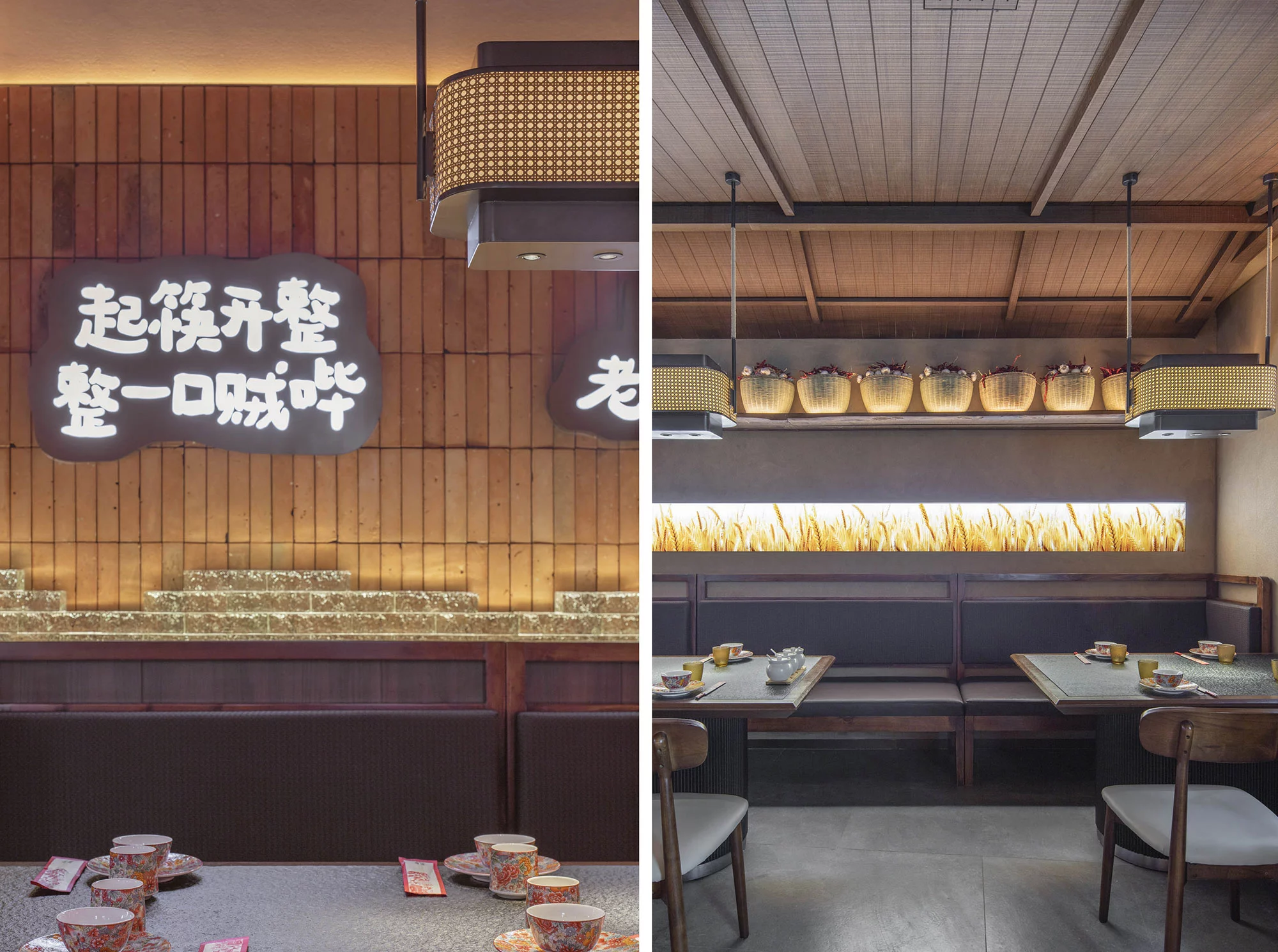 “春生、夏长、秋收、冬藏”,四时和顺,五谷丰收。二楼厢名以八节命名,呼应一楼五谷丰登小景,自出一派质朴。包厢中配以自然元素的艺术品,虽不是自然景象,却构成了自然表达,用现代手法追忆乡村的美好时光,跨越城市与乡村,让整个就餐空间既温馨雅致,又流淌着乡野雅韵。