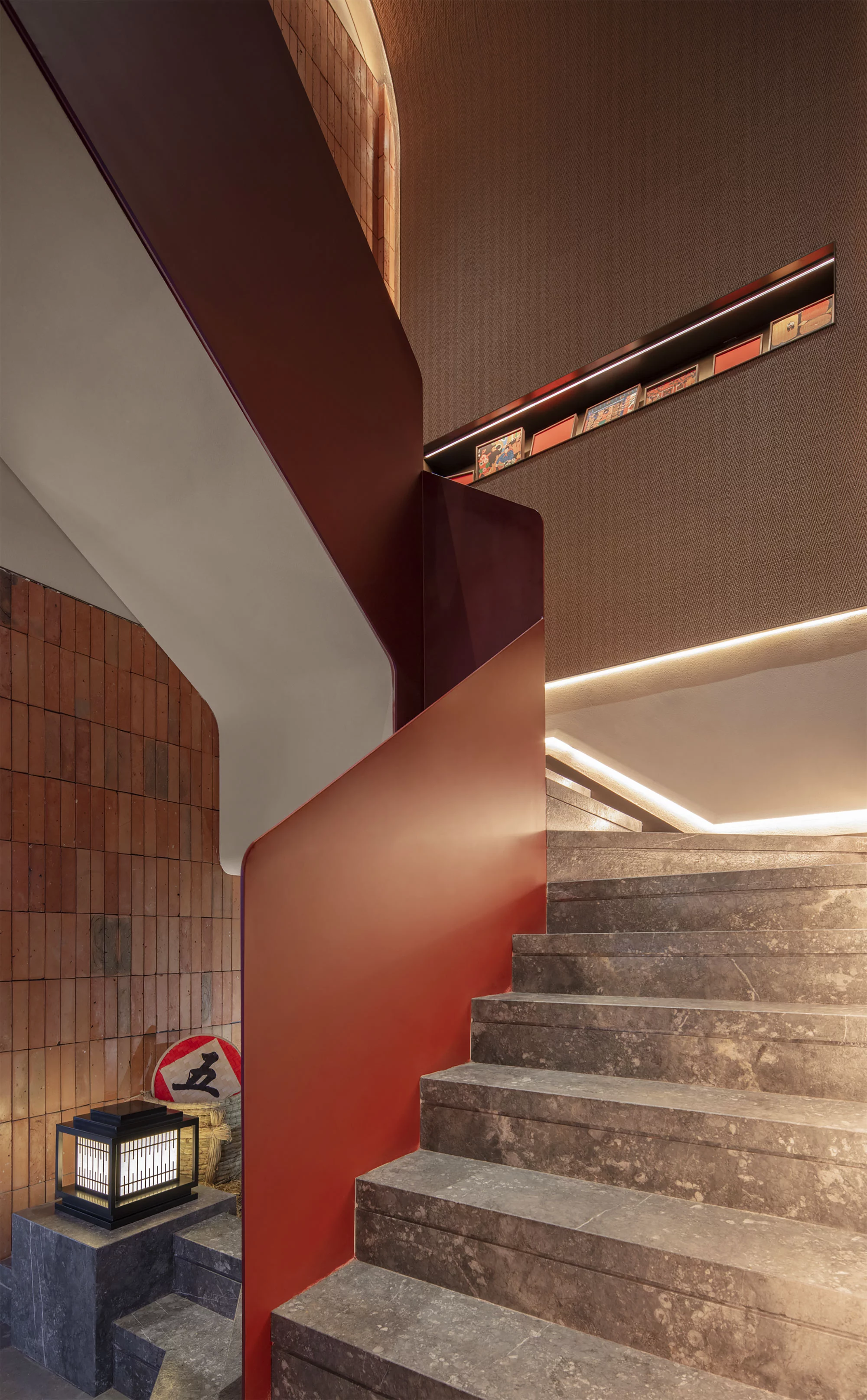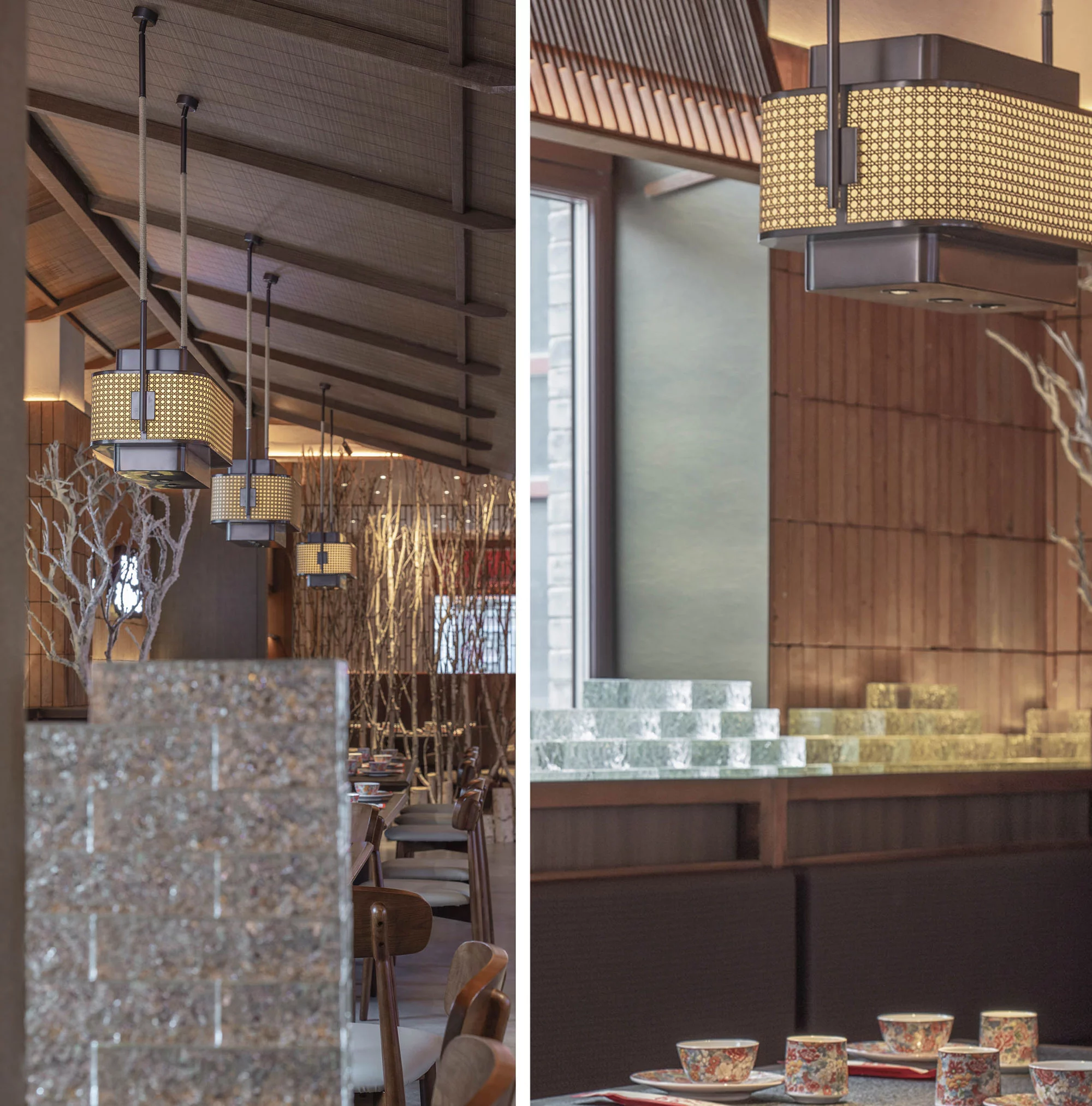 千里冰封、万里雪飘是独属于北方的浪漫,枕月眠风、袅袅炊烟则是社会主义新农村绘就关于“诗和远方”的生态画廊。空间整体采用大面积红砖的铺陈搭配冰砖的点缀,在展现北方新农村风貌的同时,呈现出冰雪元素。木质及麻质的温润特质又中和了红砖与冰砖带来的凌厉感,营造出了质感且温暖的餐饮环境。