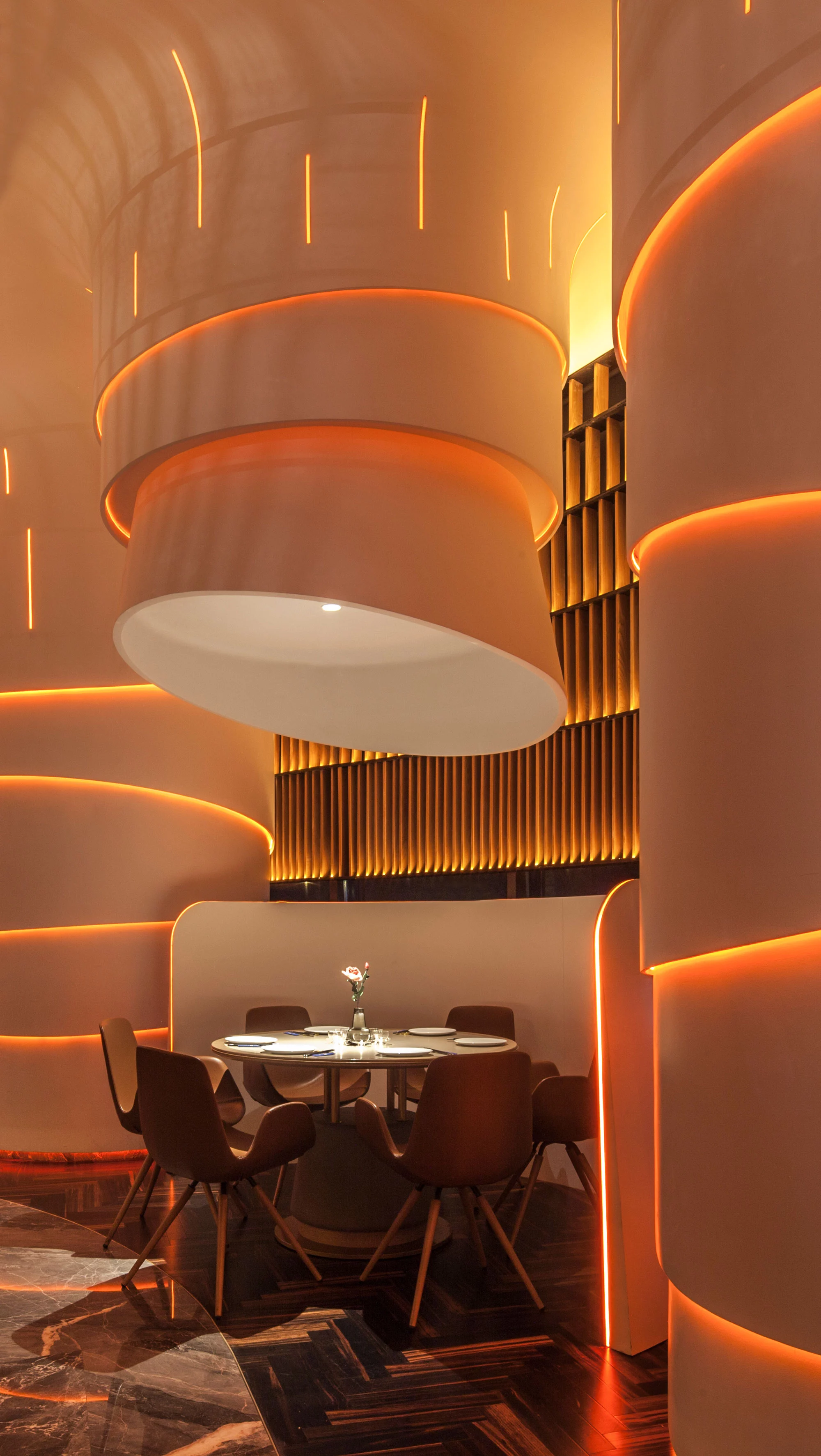 红色能恰到好处的出现在该出现的位置,整个空间便活了,而在每一个空间都能表达想要传达的信息,或热烈,或妩媚,或浓烈。尤其是在天花顶部的表现,起到了点睛之笔作用,不仅可以作为视觉焦点,还可以传达光与食物的重叠,空间缭绕的众味喧哗;调动食客身上的每个细胞,回归食物和色彩的本质,吃个爽快,既能让食客专注享用美食,又能在食客抬眼的瞬间感受艺术的魅力。