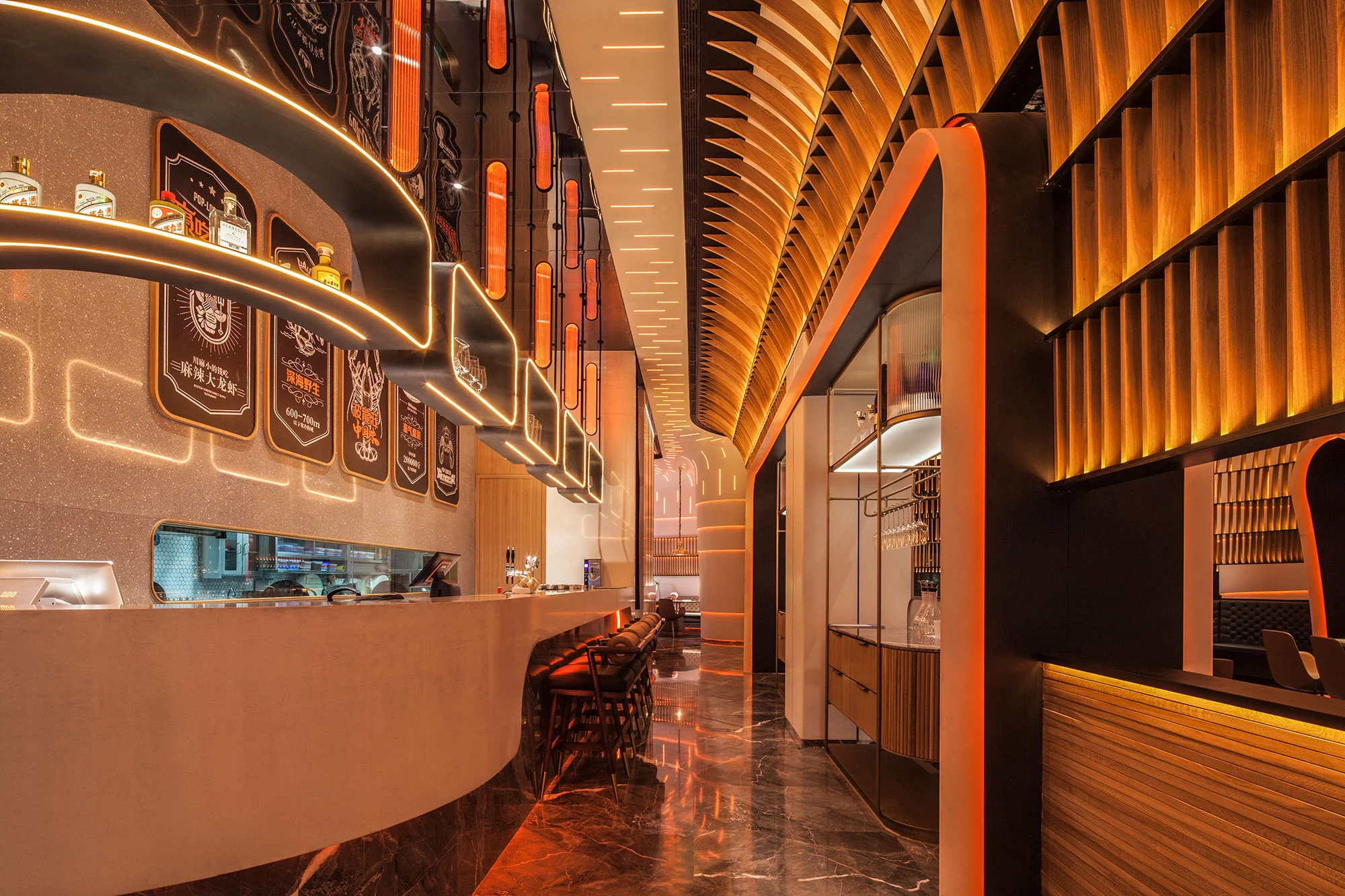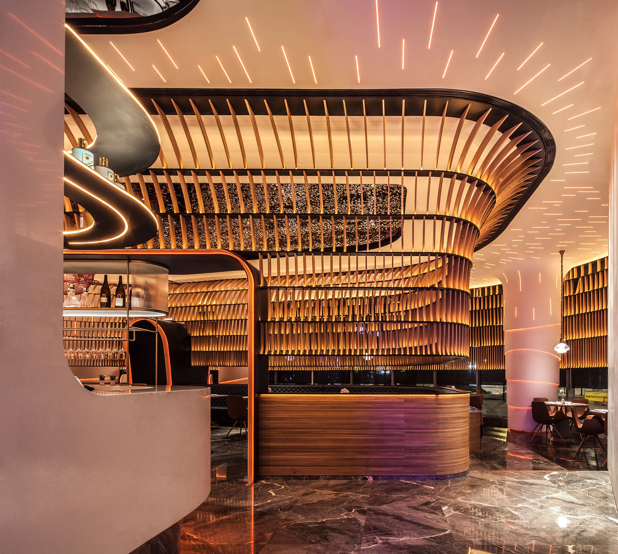 围绕龙虾元素,在棚上镶嵌装饰设计,突出餐厅主题特色。整体墙面造型以龙虾背为参照,层层叠加。龙虾背的曲线形状和墙面造型相吻合,空间层次变得丰富。随着行走的位移和变化,弧线引导人们逐渐探索,因为不同的区域设置了不同的功能,丰富了空间的层次和流线。另一方面,这种抽象的形式建构了和谐美、宁静美、生命力美和刚性美,释放了人们在自己的生活剧中所经历的情感冲击,也将空间展现的淋漓尽致。