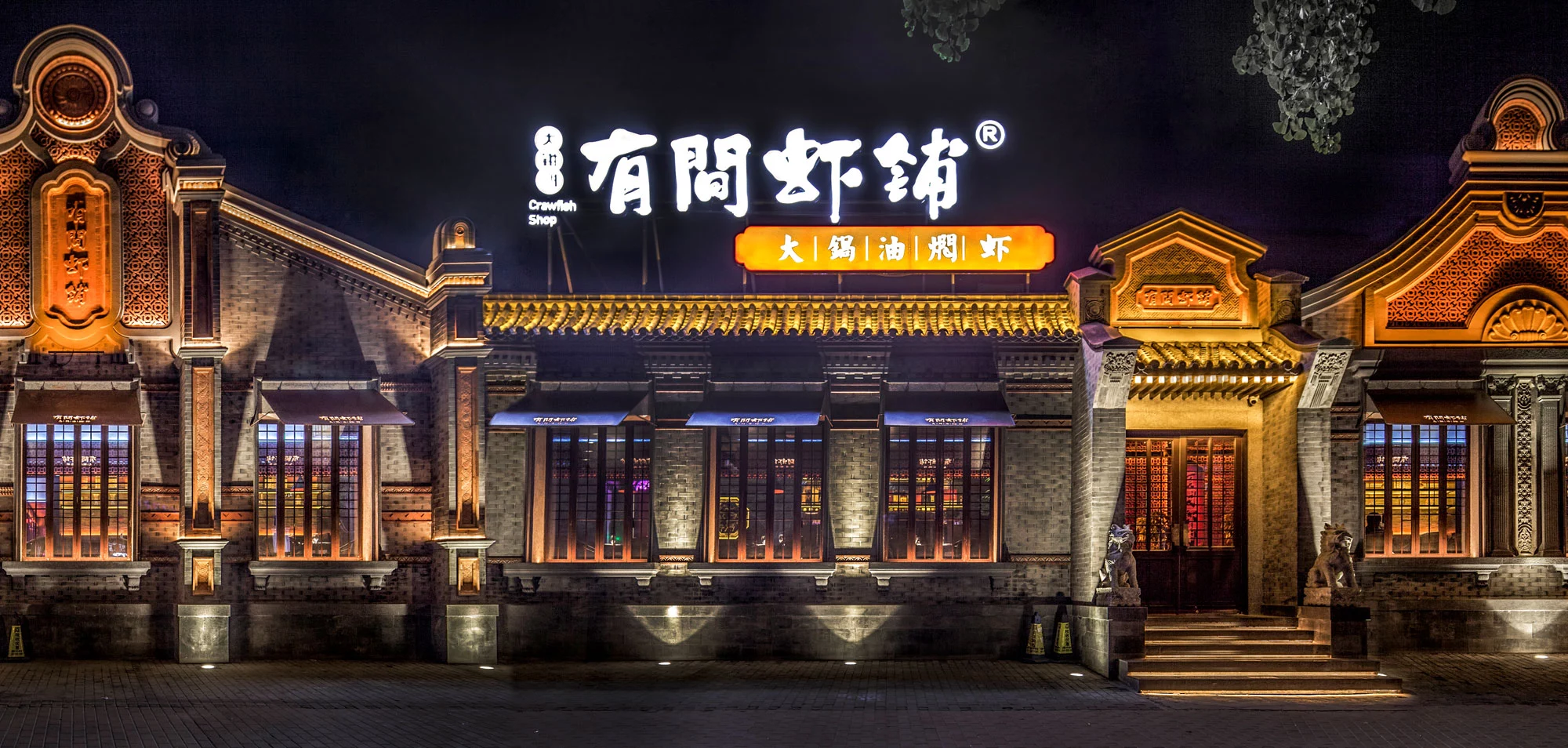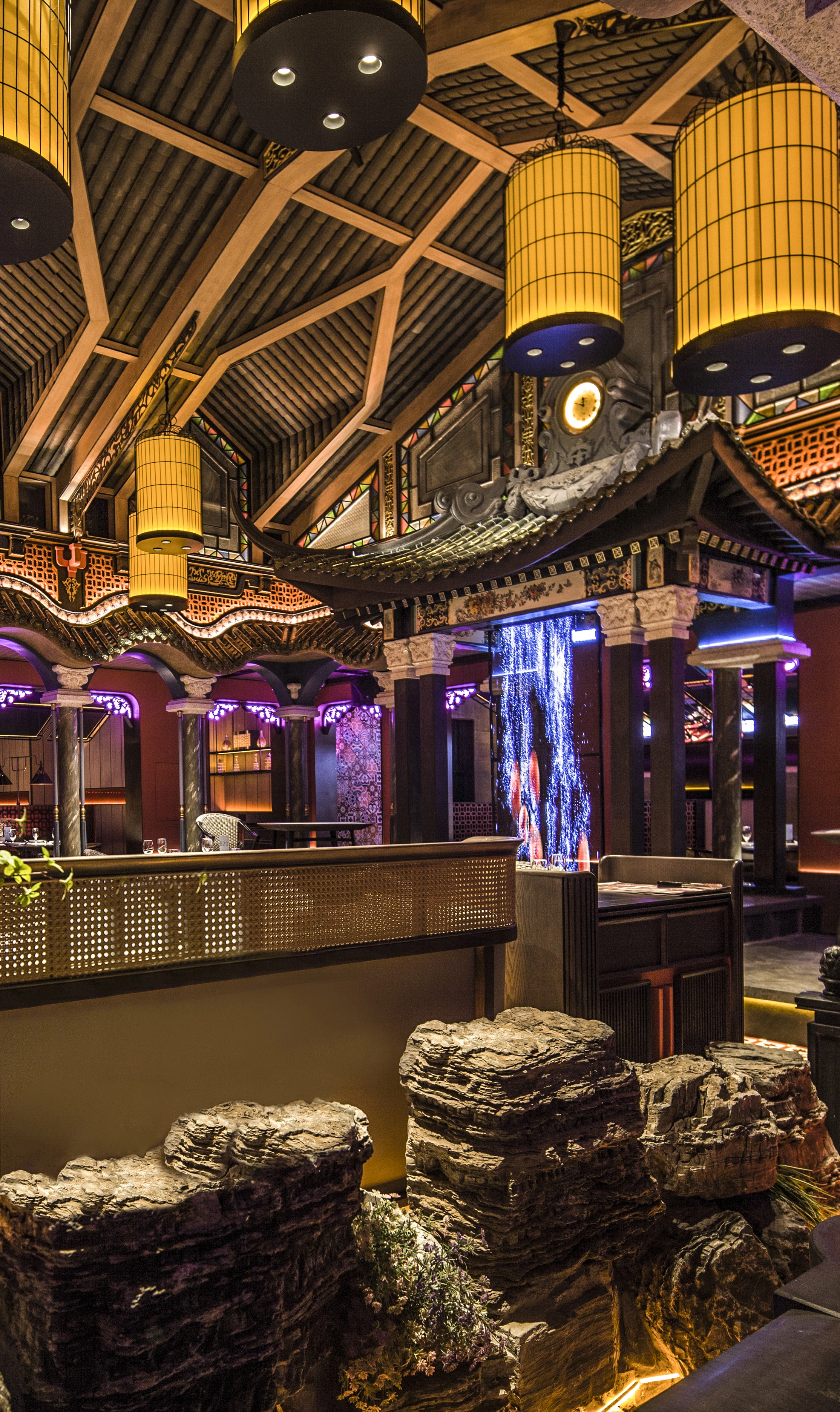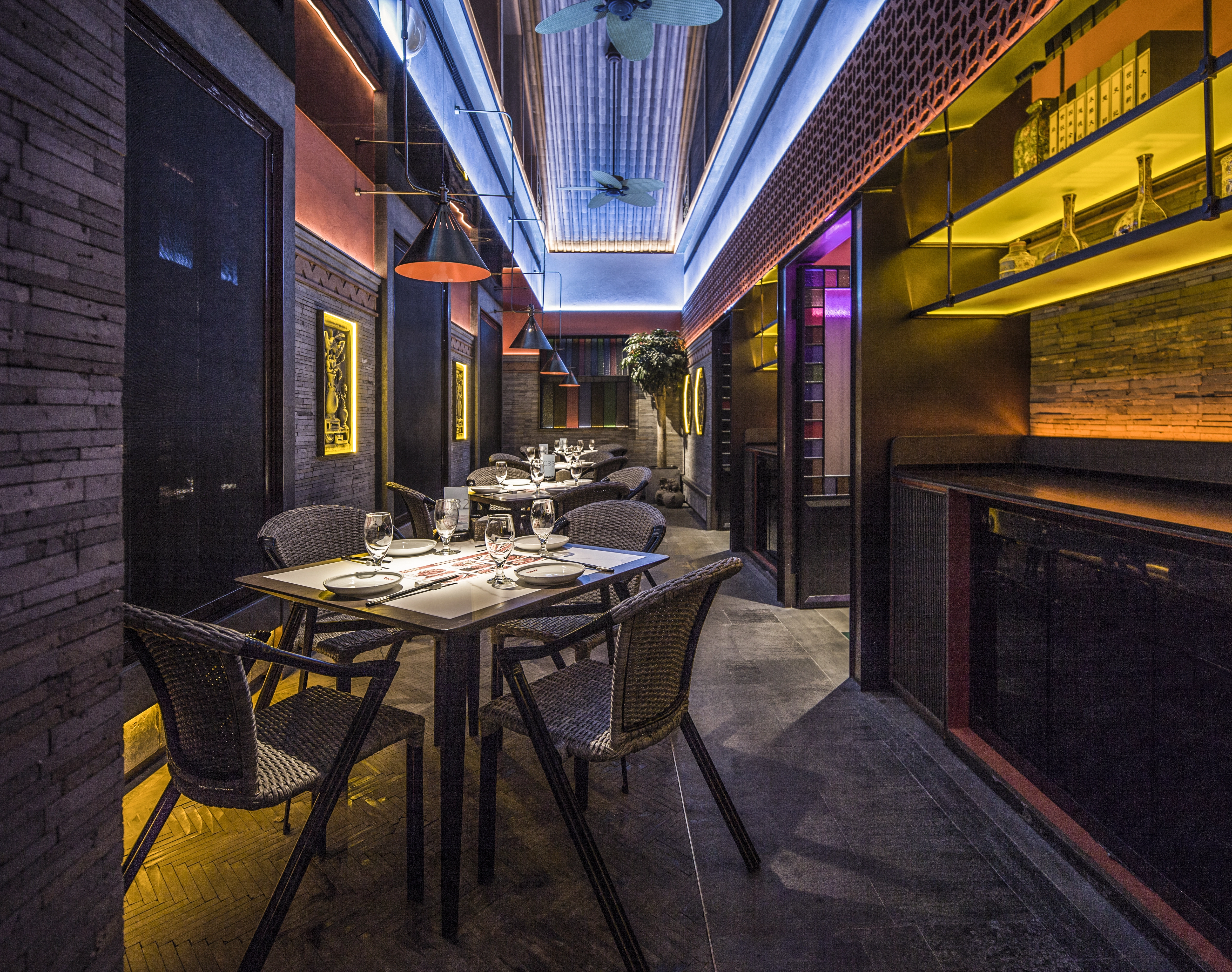 中央四合院为该设计最主要的区域,挑高的彩窗、西洋与东方主题相呼应,中式的材料及色彩与西式的比例相交融,环廊的周围有山水、石材、园林的中式手法,与民国的鸟笼、西式仿古电扇灯和时钟日月同辉。泻水、鸟鸣、勾画出往昔的时尚喧嚣,虾红色的墙面与砖花扣出了空间功能的主题——“有间虾铺”。当有微风拂过,中式的舞台上渗透了电子屏上放映的艺术画面,映衬着两侧的餐区,就像是南洋之滨的一个美丽的傍晚... ...