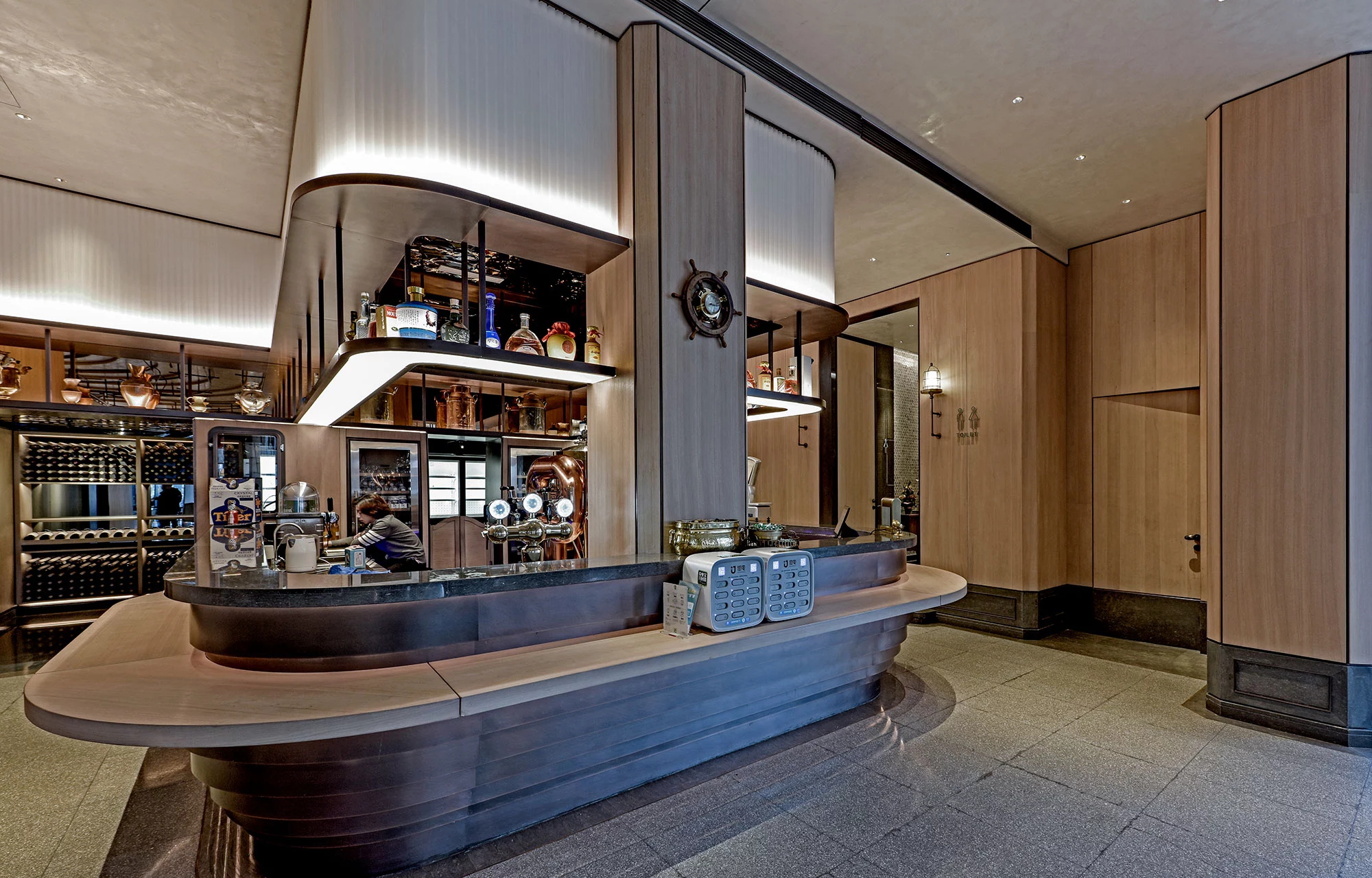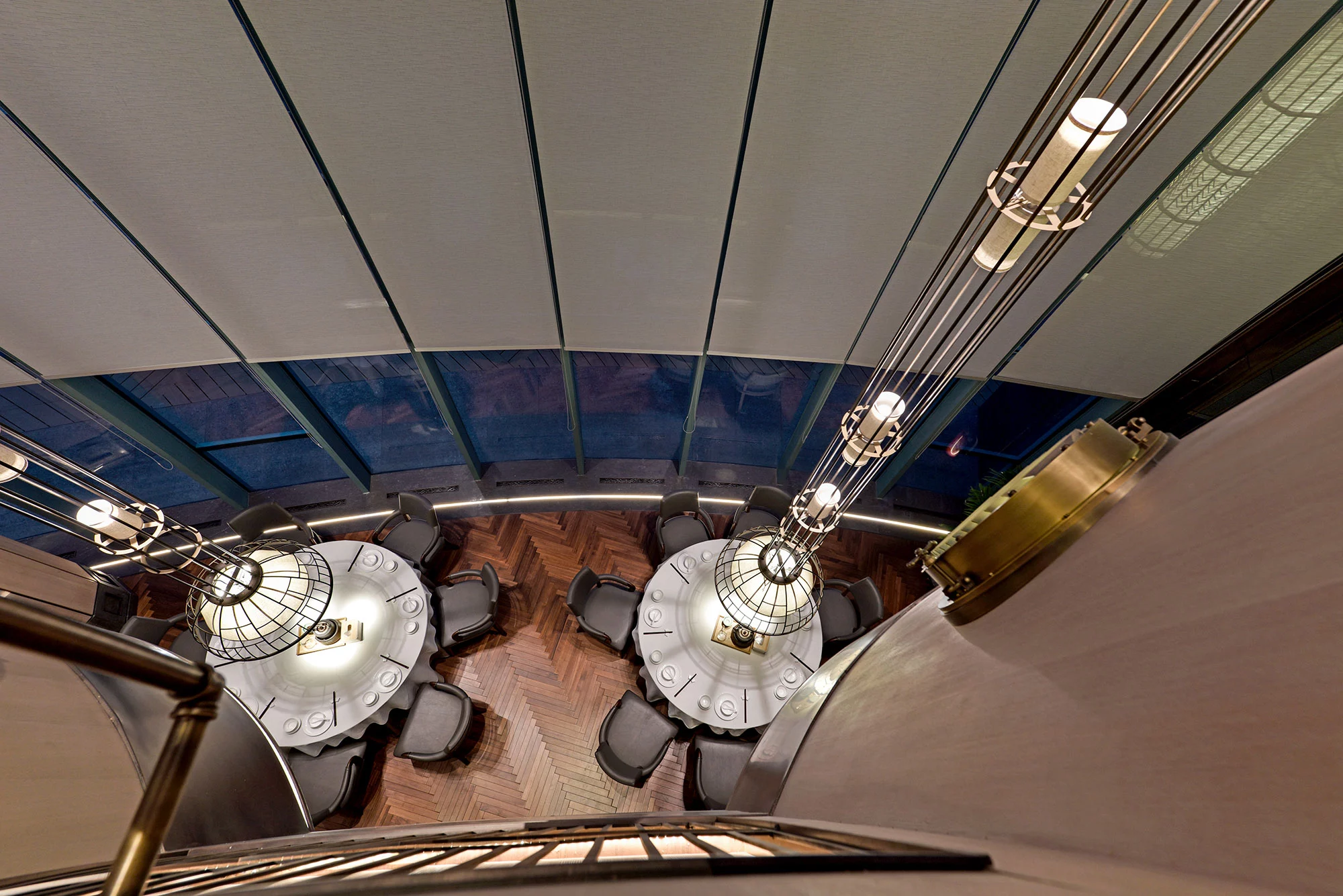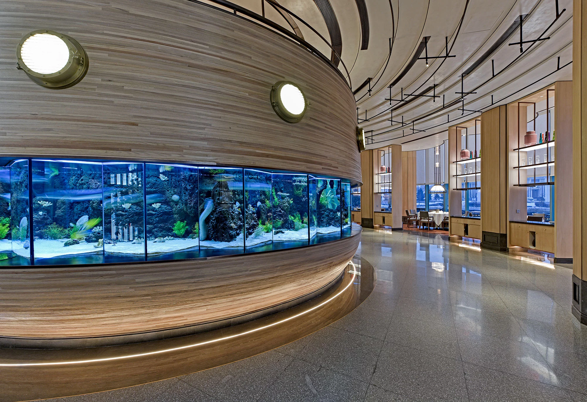 所以在餐厅动线设计、灯光设计、空间结构等方面都进行了考量。与此同时,我们设置了主餐区、吧台区、户外用餐区等多种餐位,满足不同就餐者的用餐需求。原木形成的船型结构与透明的玻璃船窗,呈现出海底的景观。波光粼粼的铜板雕刻着镂空的图案,使空间增添了几分碧波动感。精致的线条贯穿整个空间,简洁中不乏细节,清新明快的色调散发着海洋的气息,透过明亮的弧形落地玻璃窗,仿佛拉近了我们与海洋的距离。