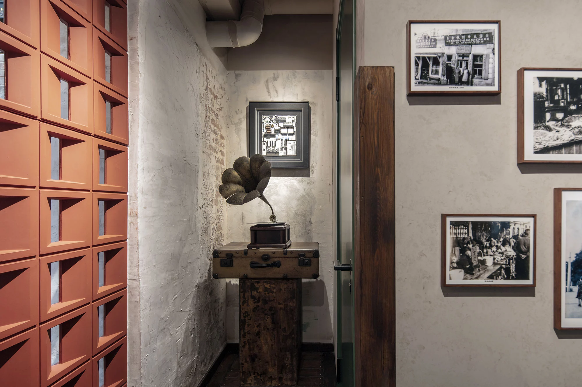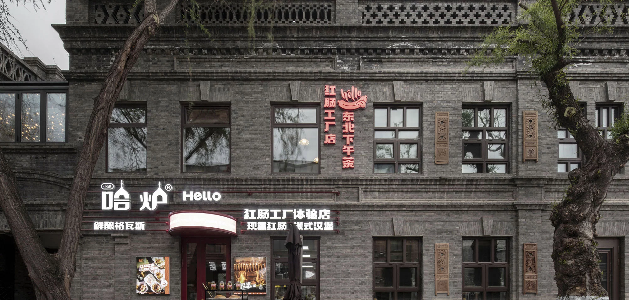 哈尔滨的味道是复杂的,它是本地孕育的锅包肉、铁锅炖的味道,也是随着中东铁路一路轰隆而来的红肠、格瓦斯的味道。哈炉红肠工厂体验店集哈尔滨味道于一身,从工厂主题汲取设计元素,青灰色沿袭中华巴洛克主街风格,自沿街外立面延伸到室内购物区及用餐区,作为基础色调串连起体验店各功能分区,采用朱红色作为室内外联通的钥匙及购物区与用餐区场景是转换的阶梯,传达出空间属性与秩序感。