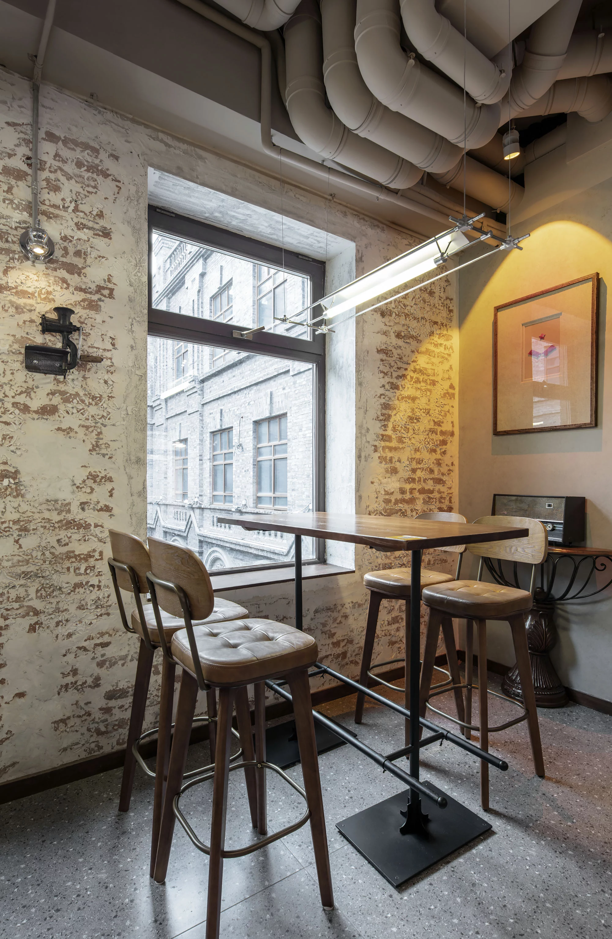 可以铭记的味道划过鼻尖、味蕾,可以触摸的记忆掺于红砖、灰墙,购物区至用餐区楼梯向上背景墙由灰石板墙向斑驳砖墙过渡,可以从楼梯口窥见二楼墙面陈设设计,两片区域自然衔接。用餐区依照工厂的意象进行设计,吊顶和围墙在原始建筑上进行了轻量化干预,墙面斑驳纹理及吊顶投射下的暖黄光亮,仿若夹杂着繁华与颓靡,流淌着热血与峥嵘,历史的厚重感扑面而来。