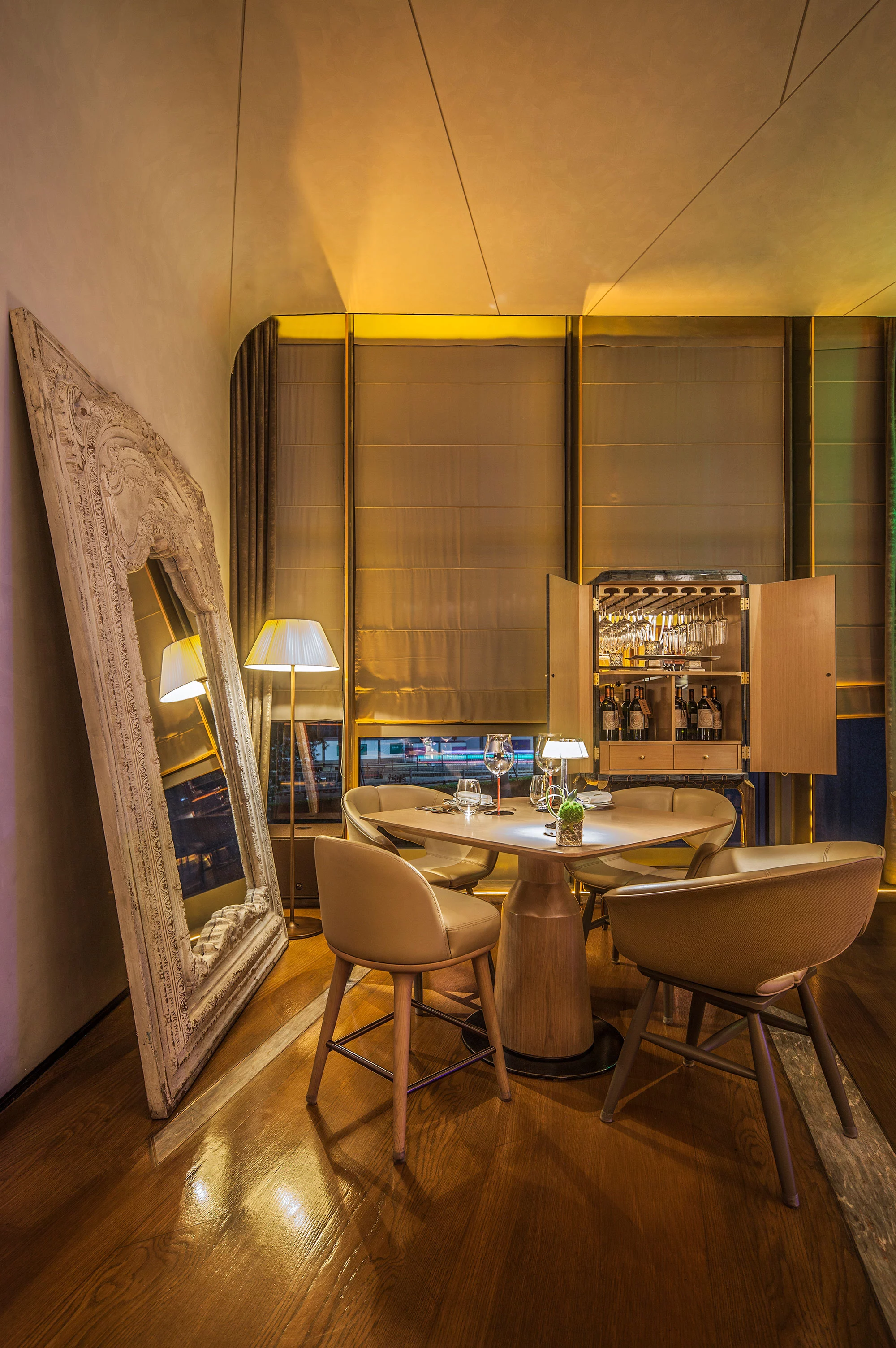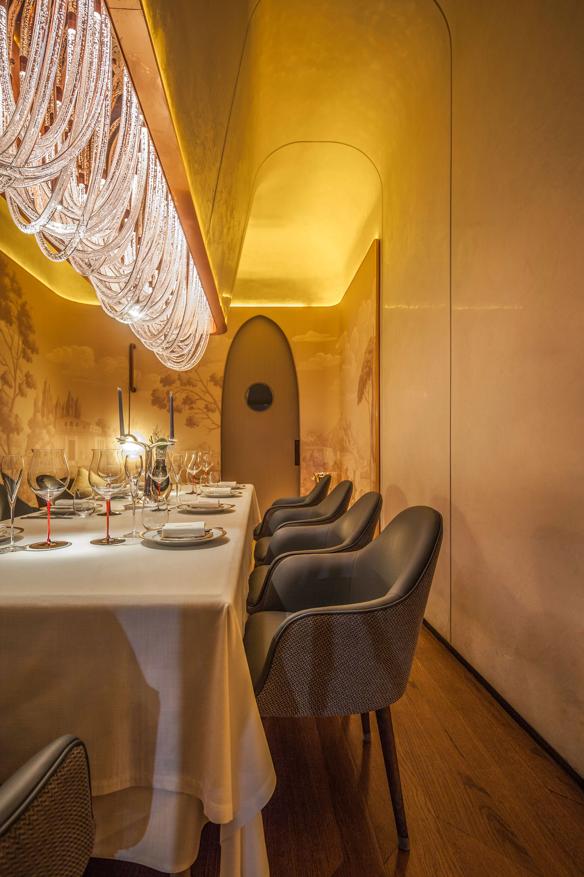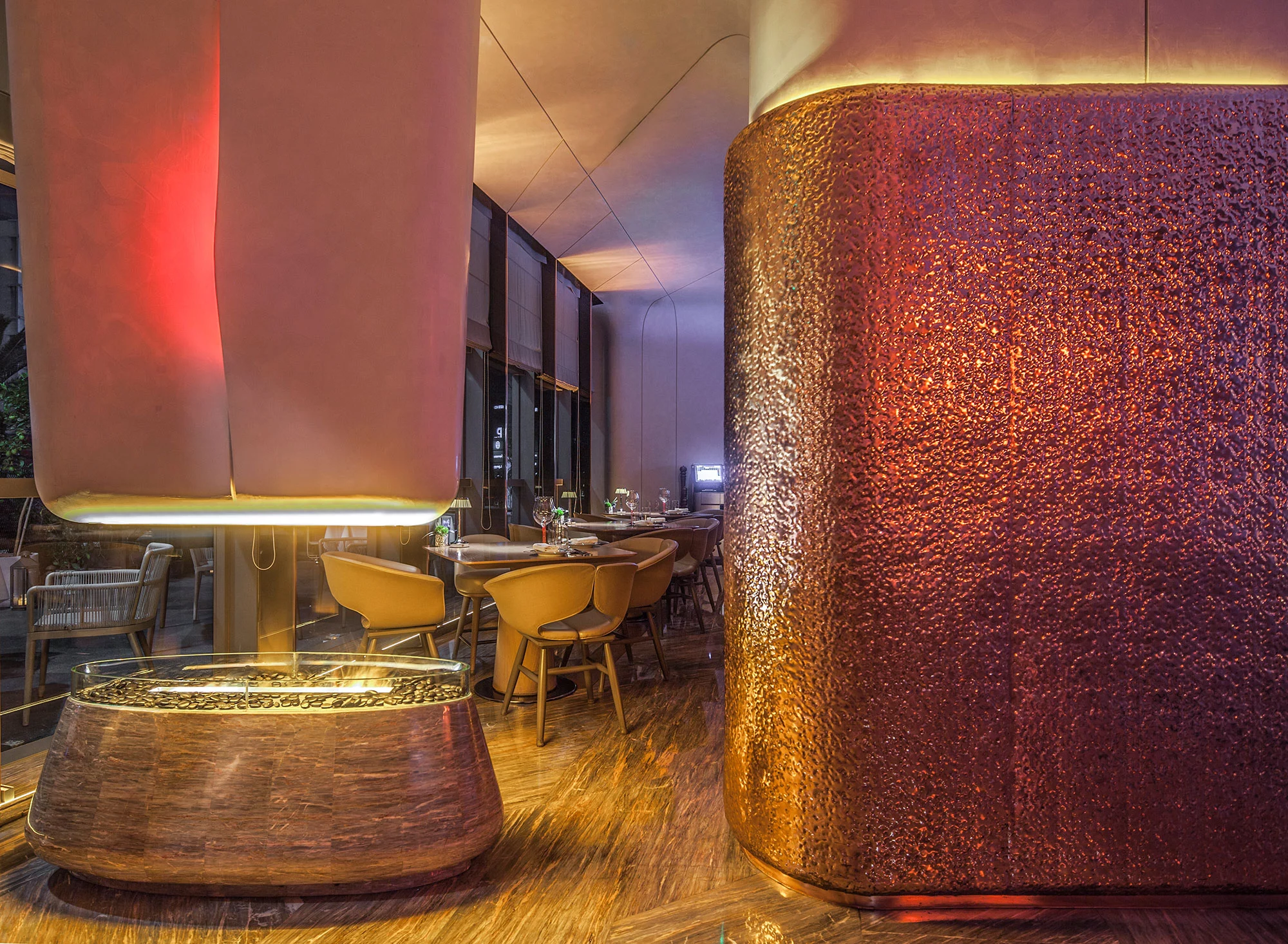 蜿蜒轻盈的浅色系凹线,如环绕的曲水引食客探索,波浪似的大理石纹理,用坚硬的材质诉说流动的美感。