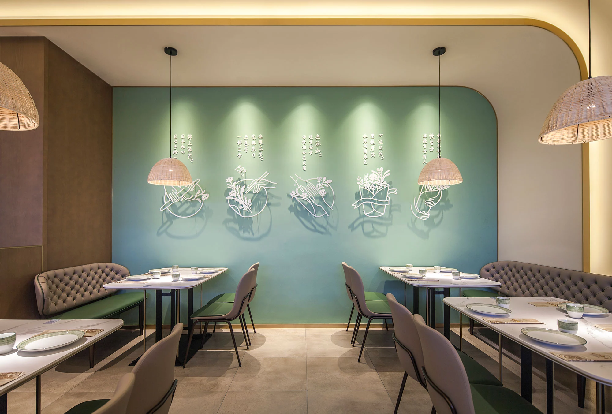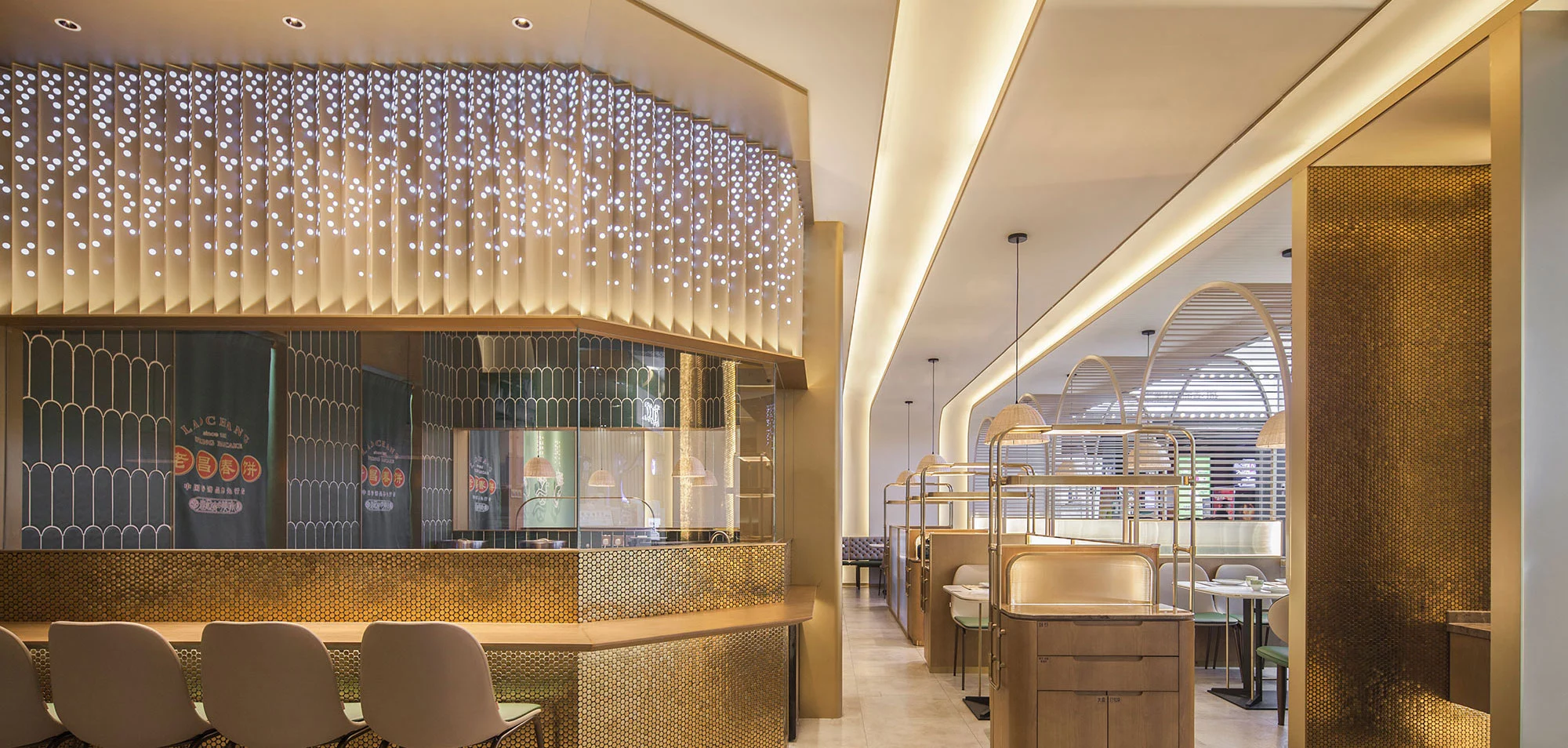 前场为开放式设计并配有绿化隔断,在保障客人用餐区域舒适的前提下也让空间更灵动。明档居中三面通透用餐区围绕布置可以达到更好的展示效果。餐厅靠通道一侧配有悬窗,在不影响室内灯光环境下将商场环境与室内互相融合。