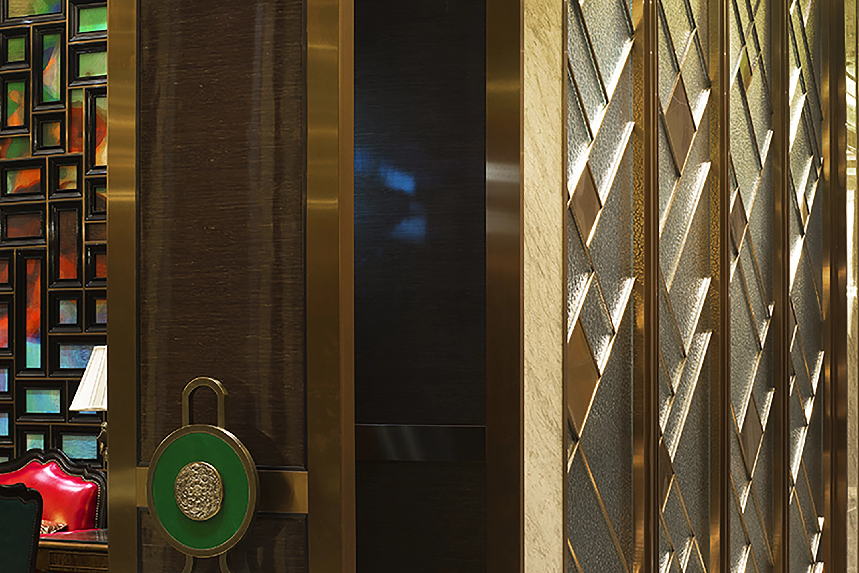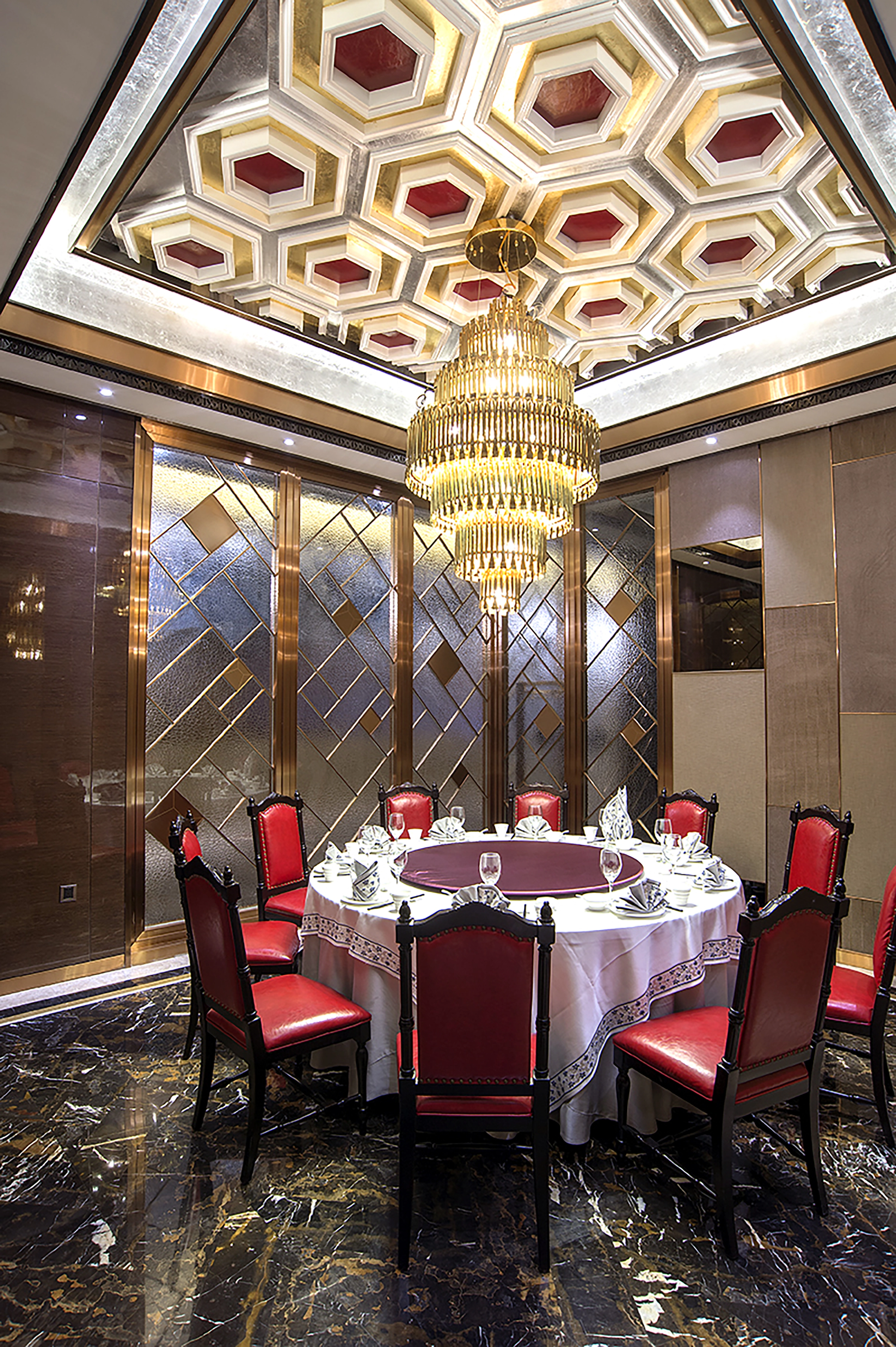 在材料使用方面,强调变奏效应融合软硬两种材质的性质通过极富金属感的玫瑰金不锈钢雕花及硬包围合空间,制造私属领地让每一位客人都有专属感觉。六边形镜面及不锈钢很好地烘托出了梦幻与迷离的感觉。