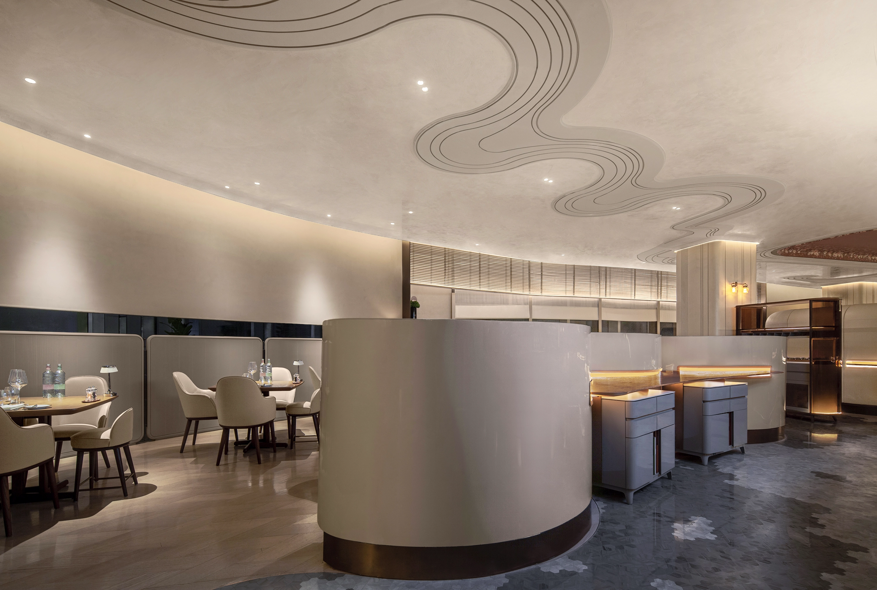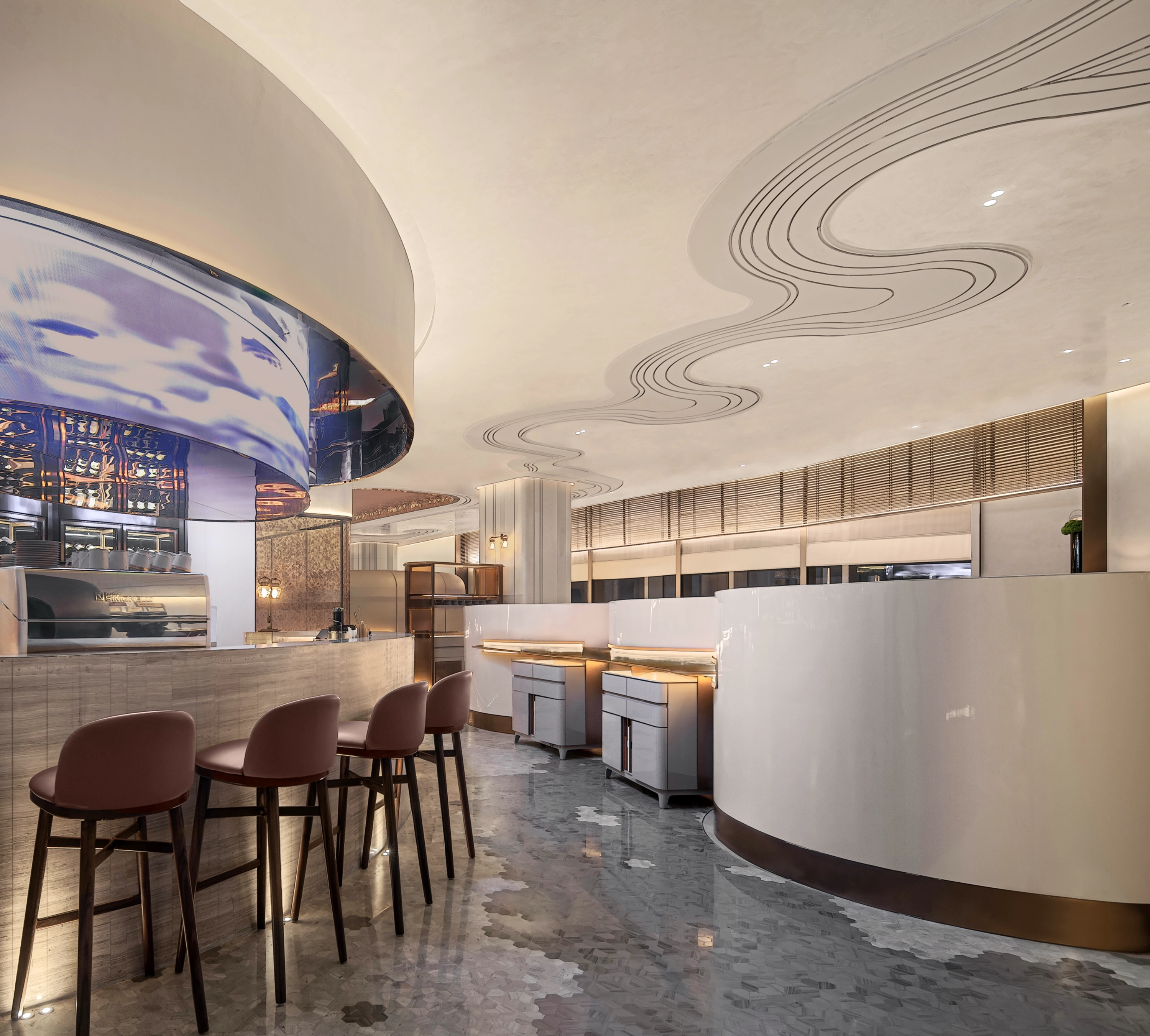 通过材质肌理与光影语言的视觉转译,精准传递品牌文化内核。在空间布局上,以"开放-半开放-私密"的递进关系构建场景序列:入口处开放型水吧与红酒展示柜形成剧场式展陈空间;中央散座区采用钢琴烤漆隔断形成半围合单元,在保持社交距离的同时维系视觉通透性;双动线系统实现顾客流线与服务路径的零干扰并行。