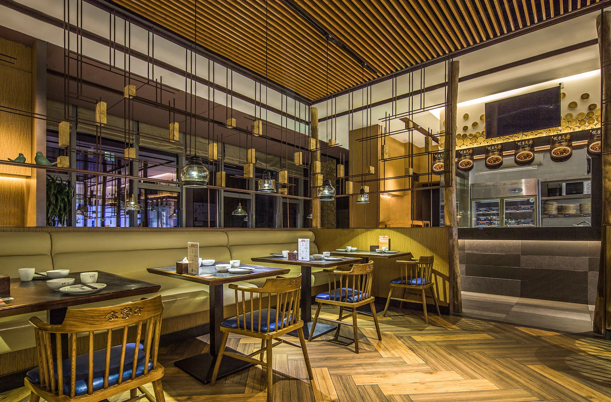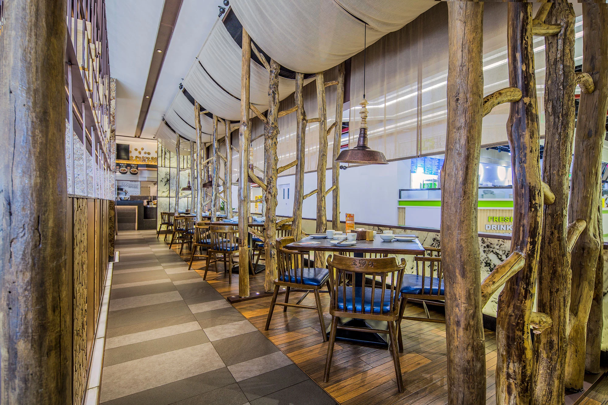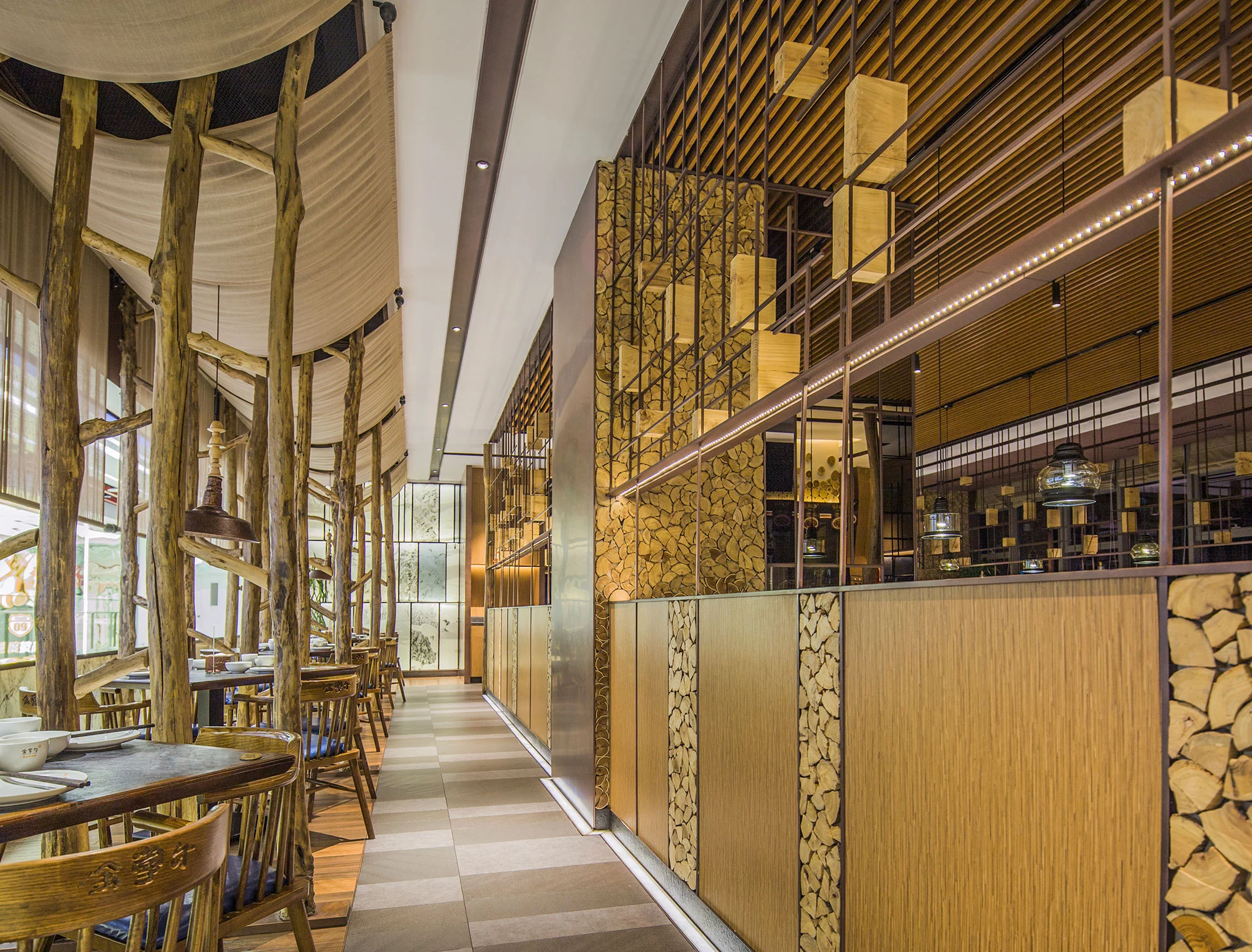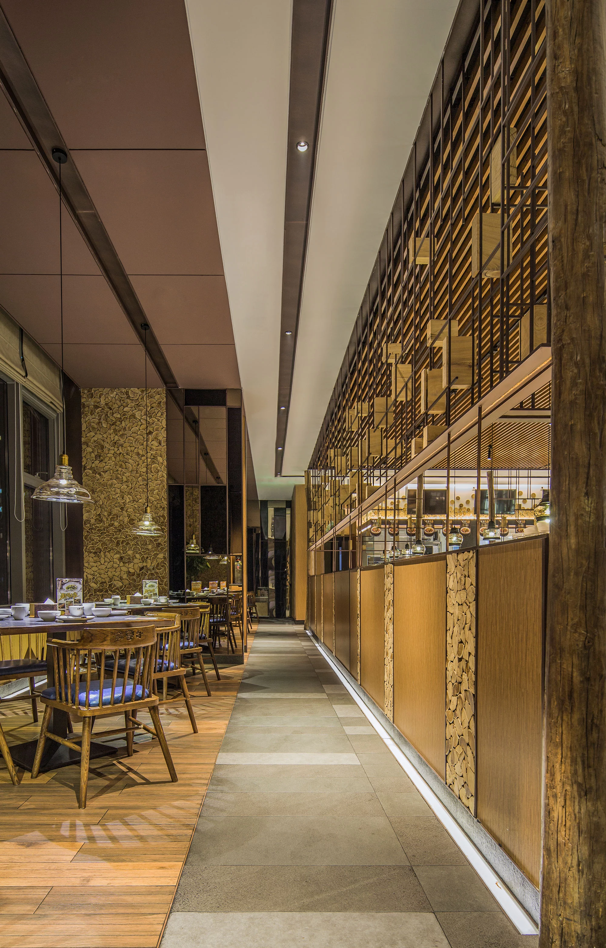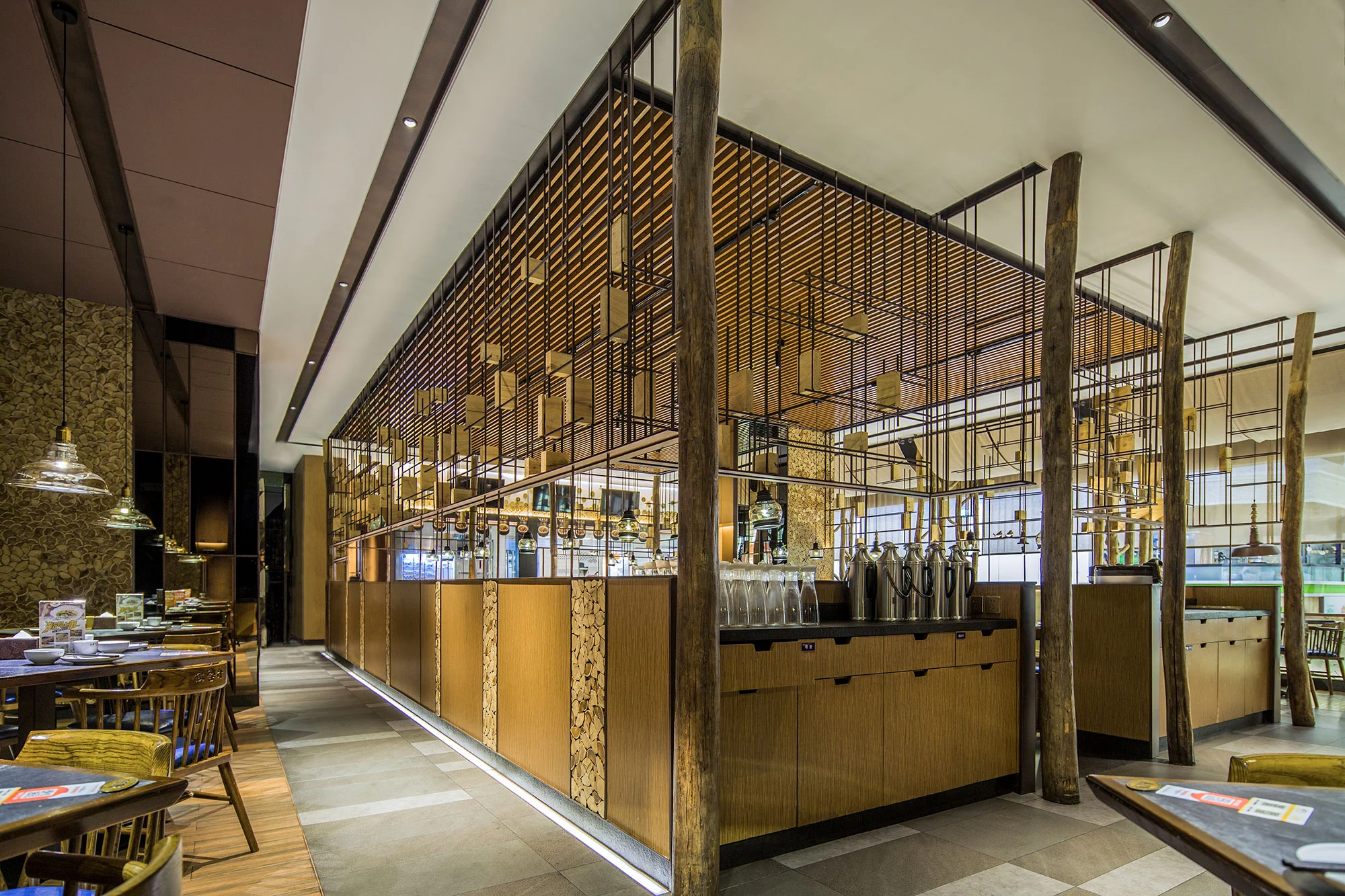 内部为一个整体通透的空间,采用金属编织的造型隔断,将区域进行了有序的划分,增加了空间的互动性,通过冰雪图案与空间中的原木搭配,突出北方风格的就餐环境。