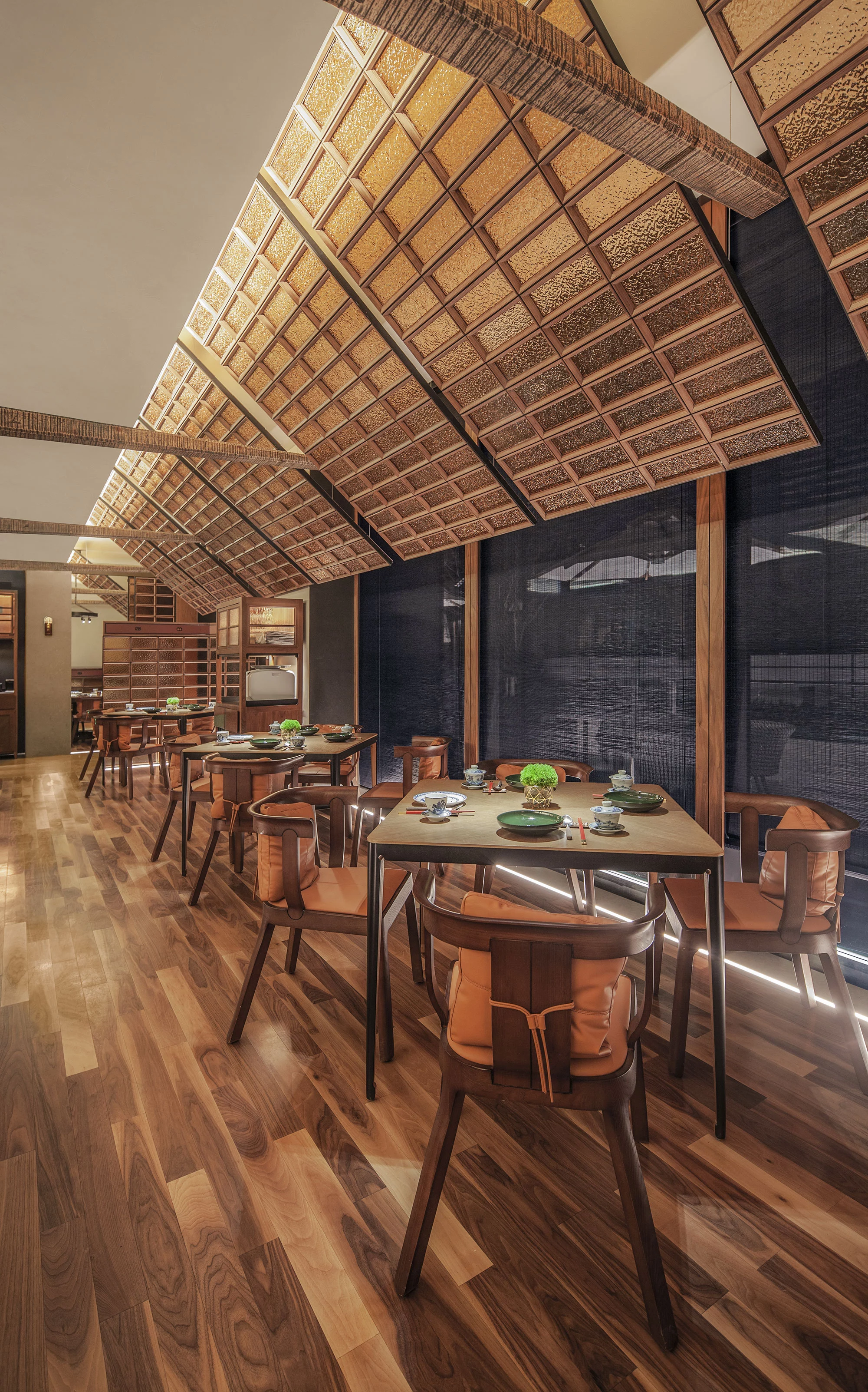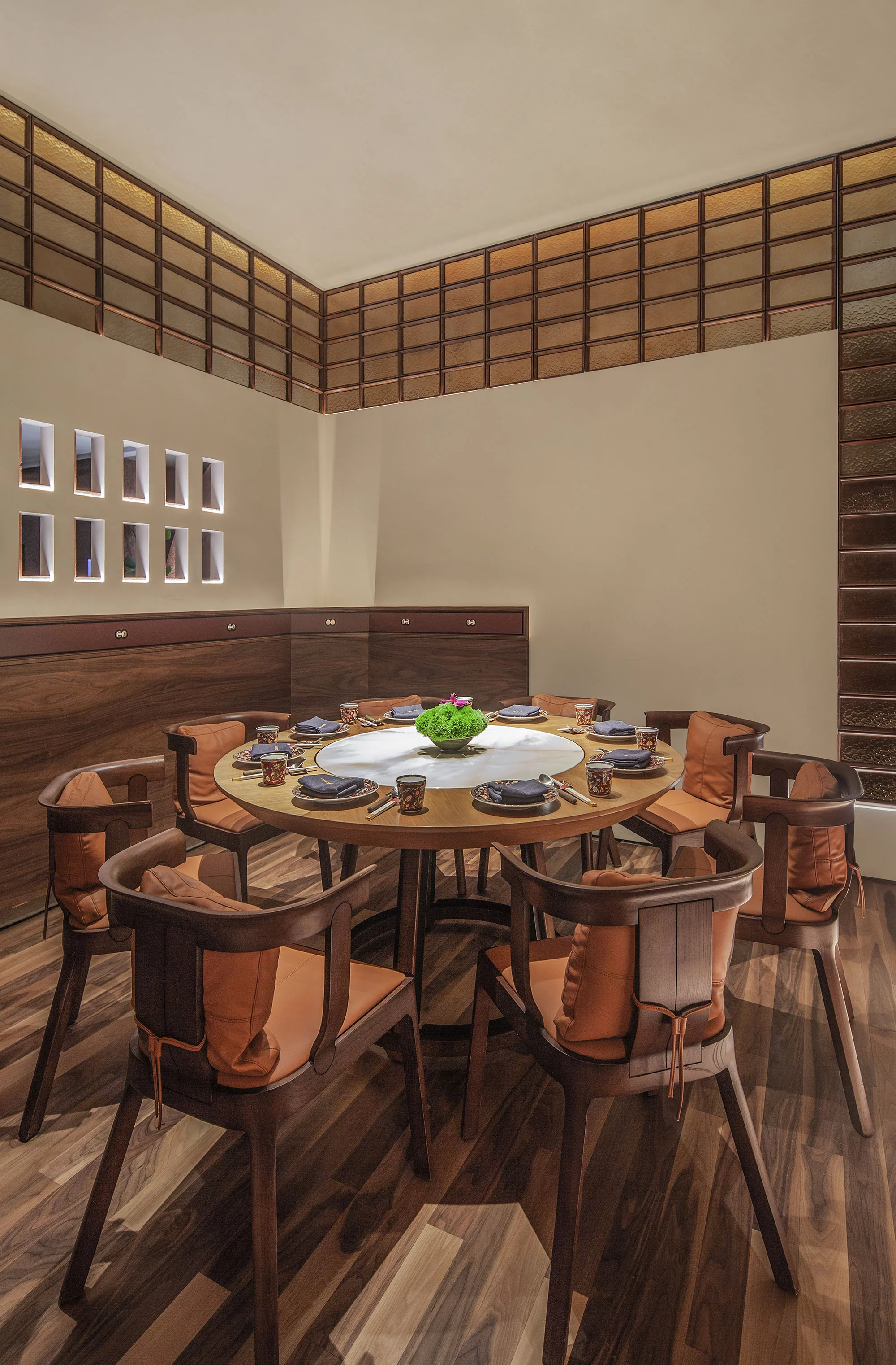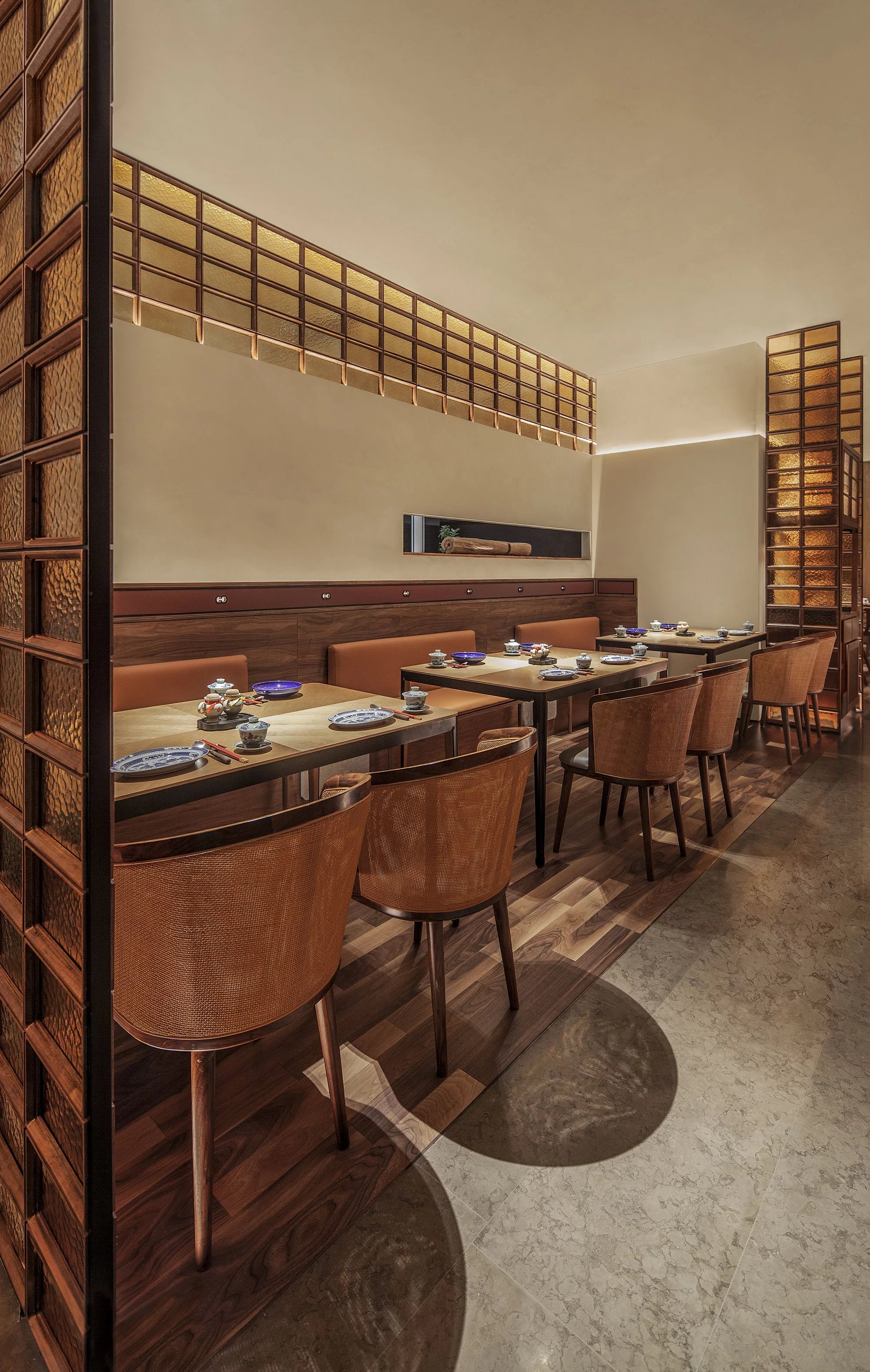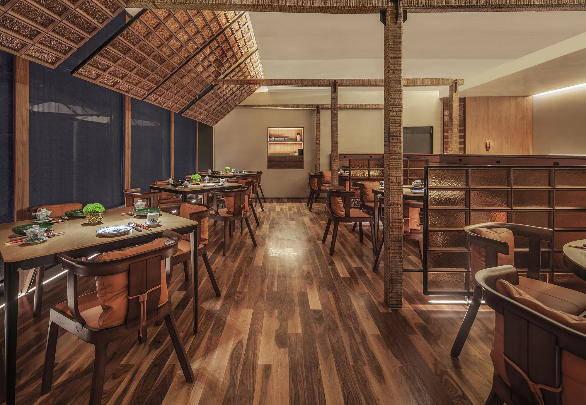 以中国古代建筑和传统文化为基础,运用现代设计理念营造出具有南京文化属性的空间意境。设计沿袭古制的表现形式,以平凡之物造境,触发全新感受。灯光焦聚在空间尺度与感知上力求平衡,营造出舒适的用餐氛围。