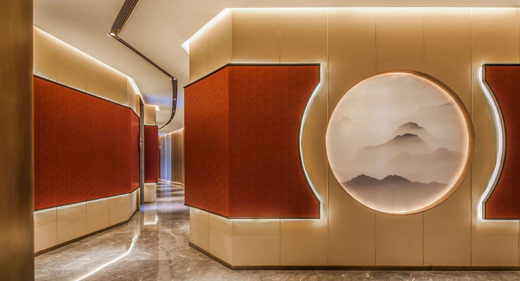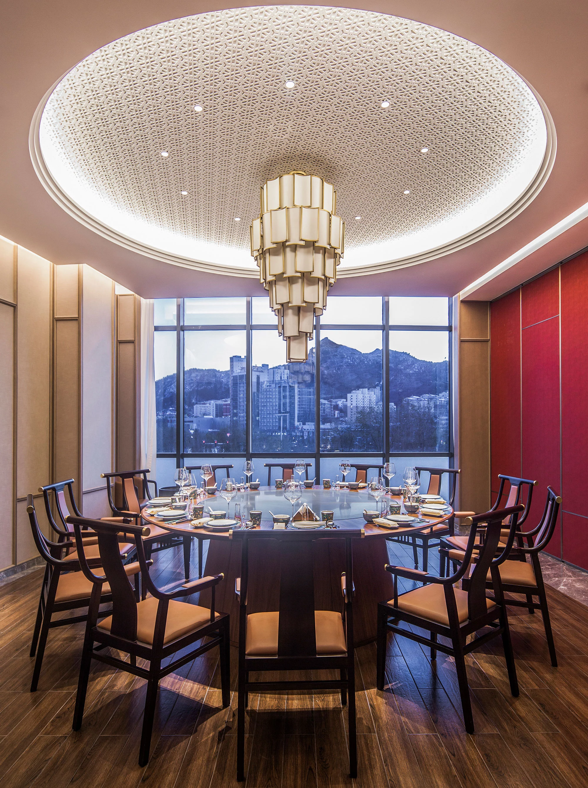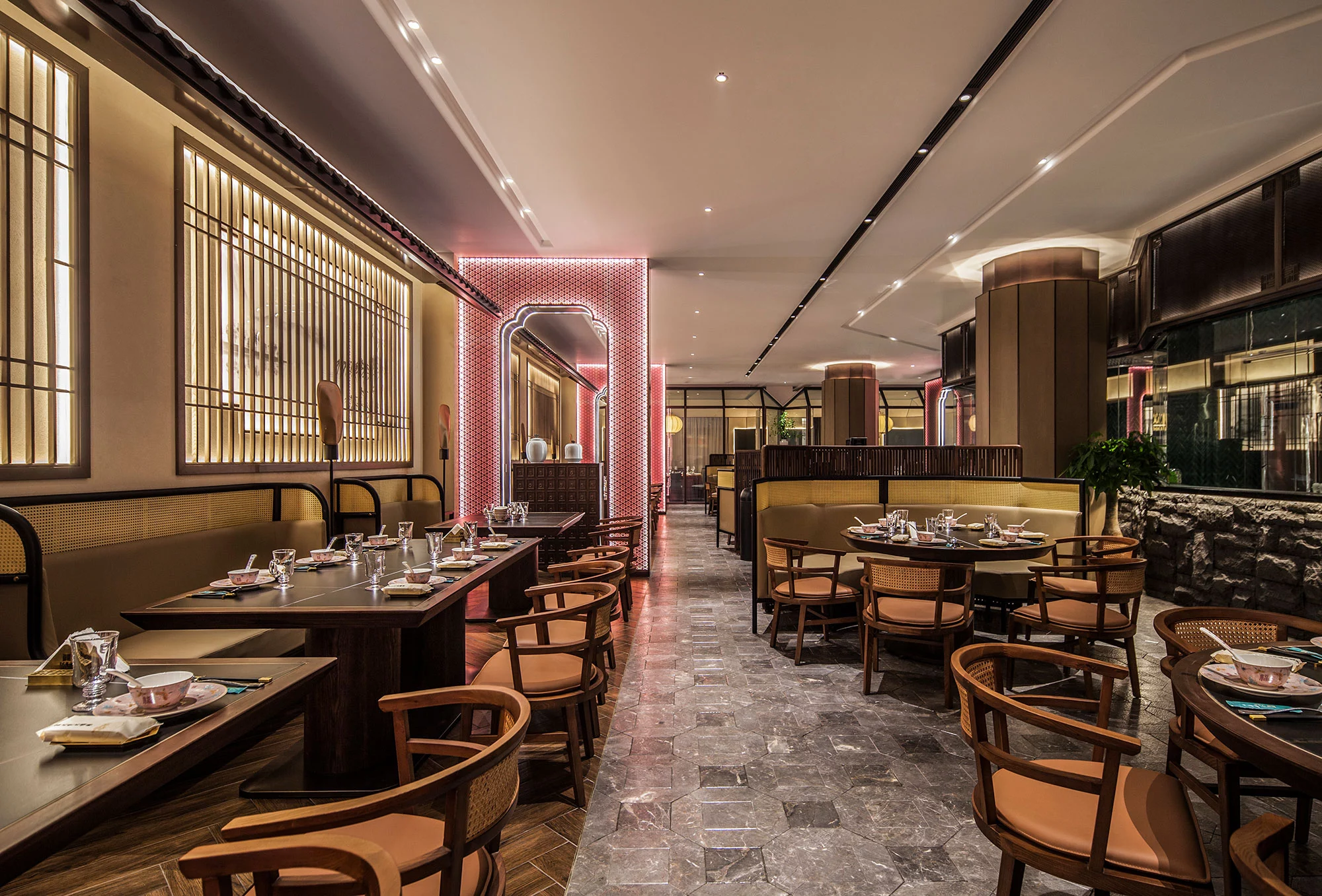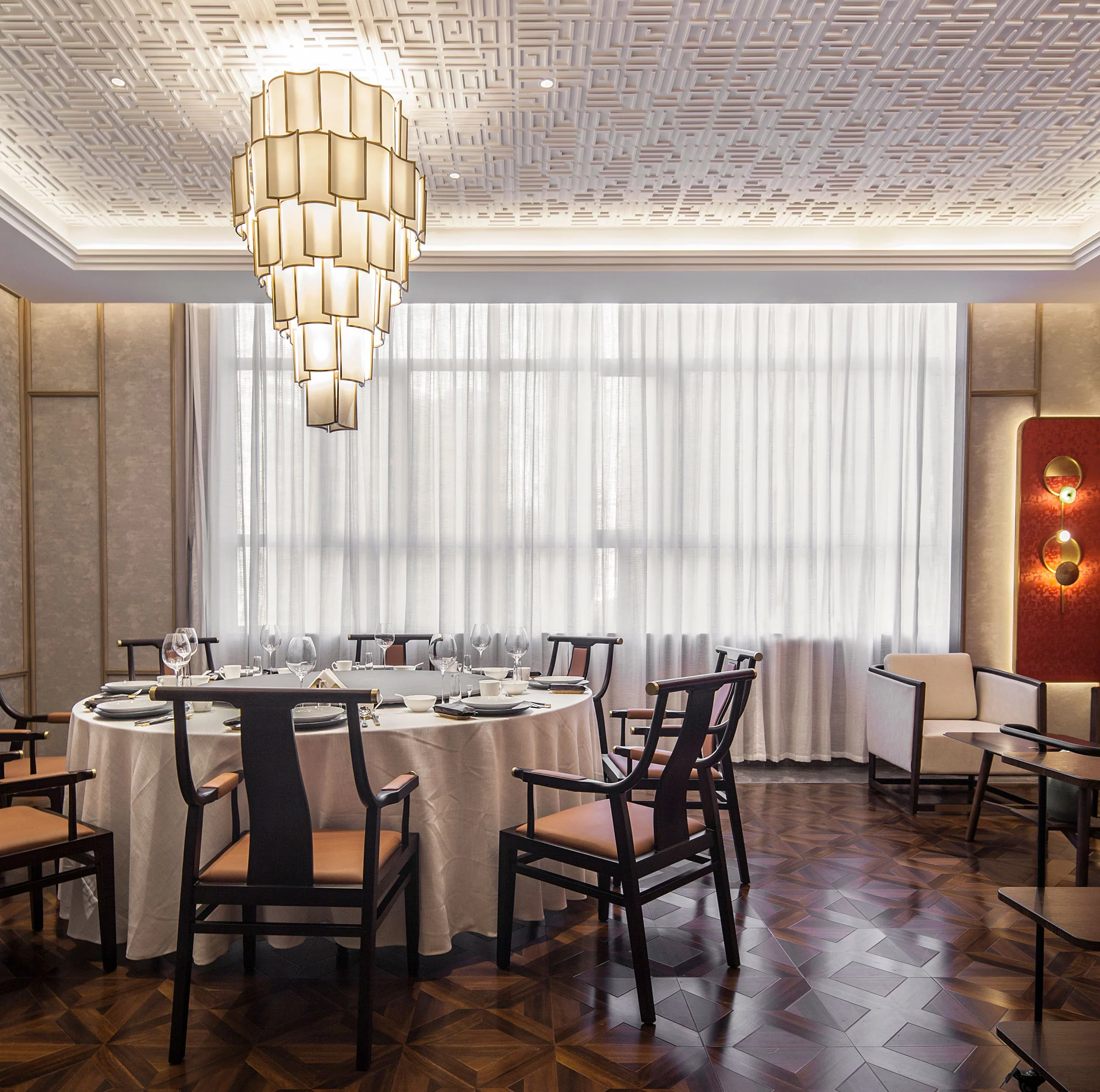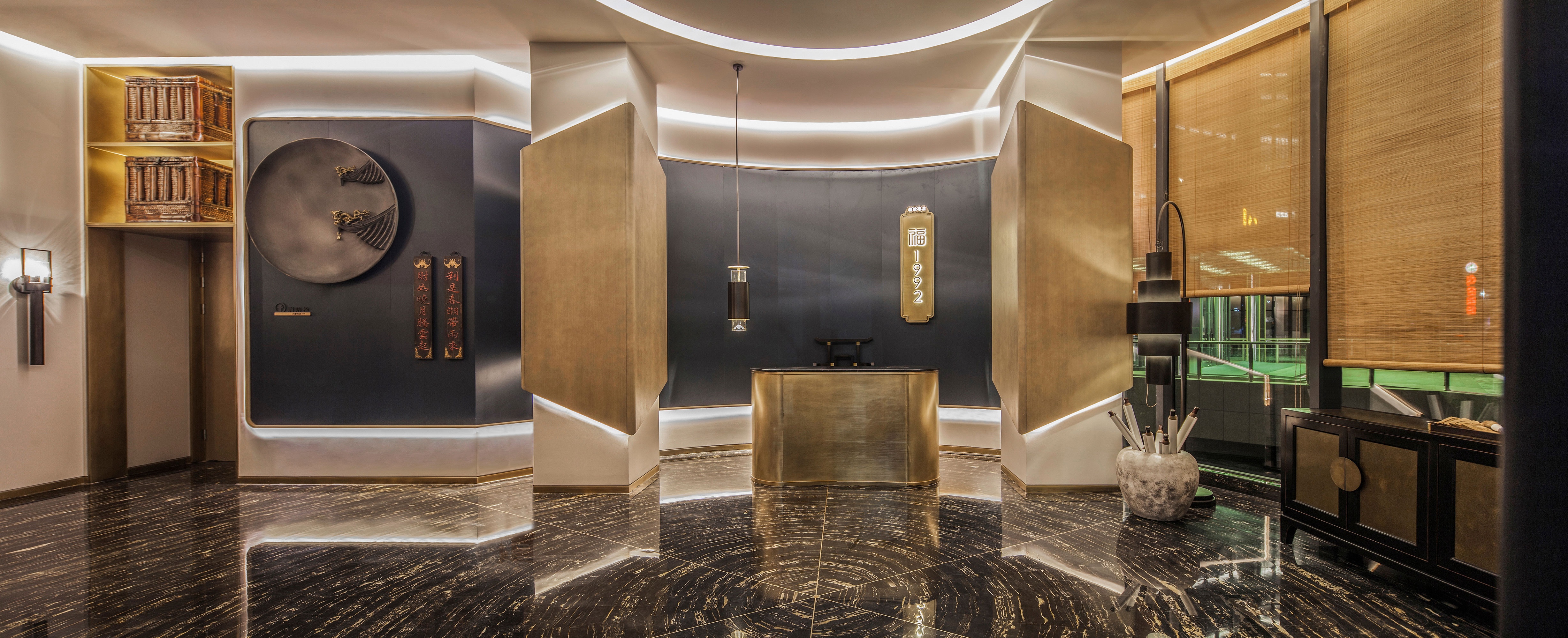 环形动线的设置使空间更加流动、顺畅,便于客商的通行。中式的花纹简约中带着古典的韵味。