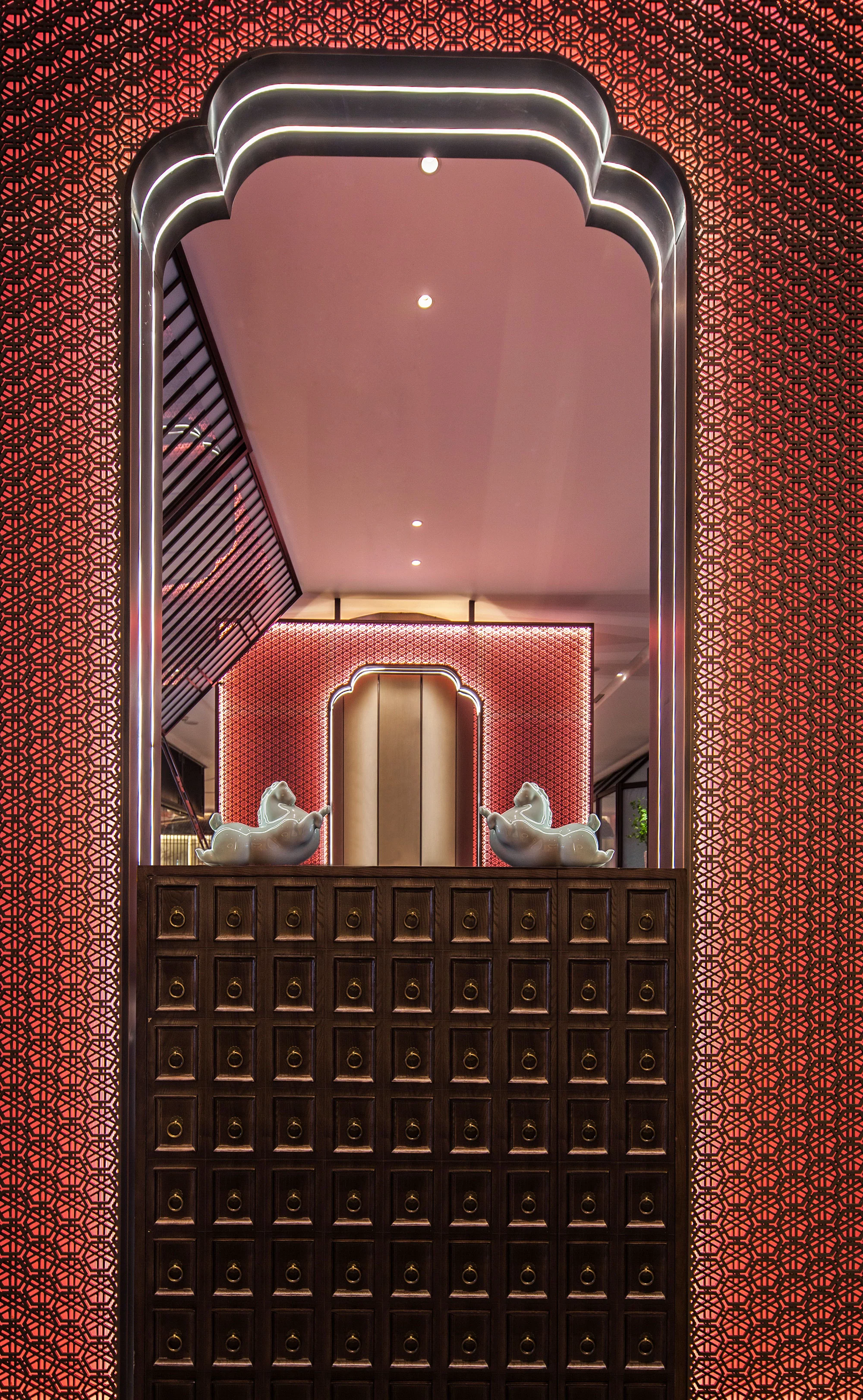 进入酒楼的第一空间为重置的跨越两层的共享空间,令人眼前豁然开朗,正中间的招牌与天花上的木质架构,为酒楼赋予了一道厚重的文化底色。