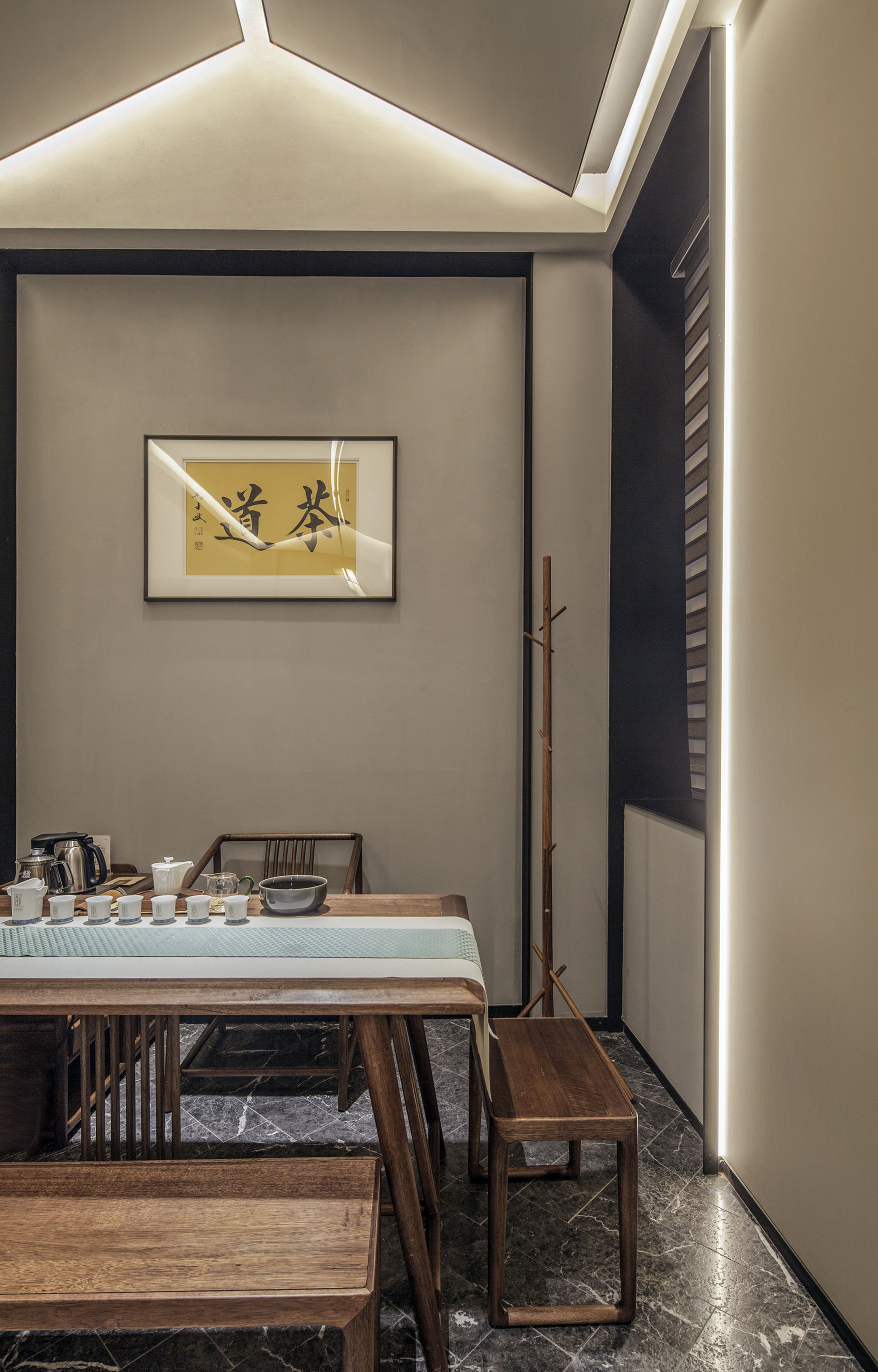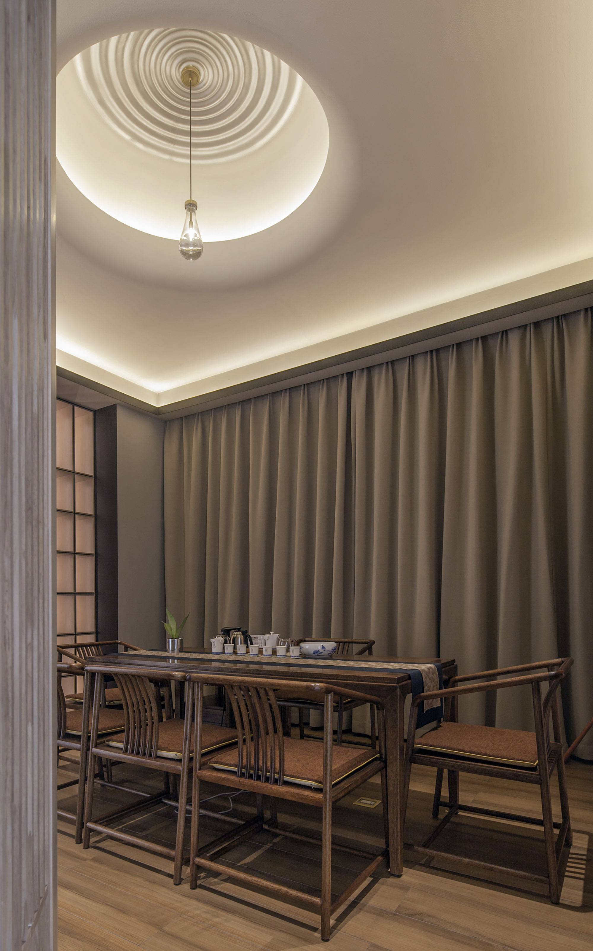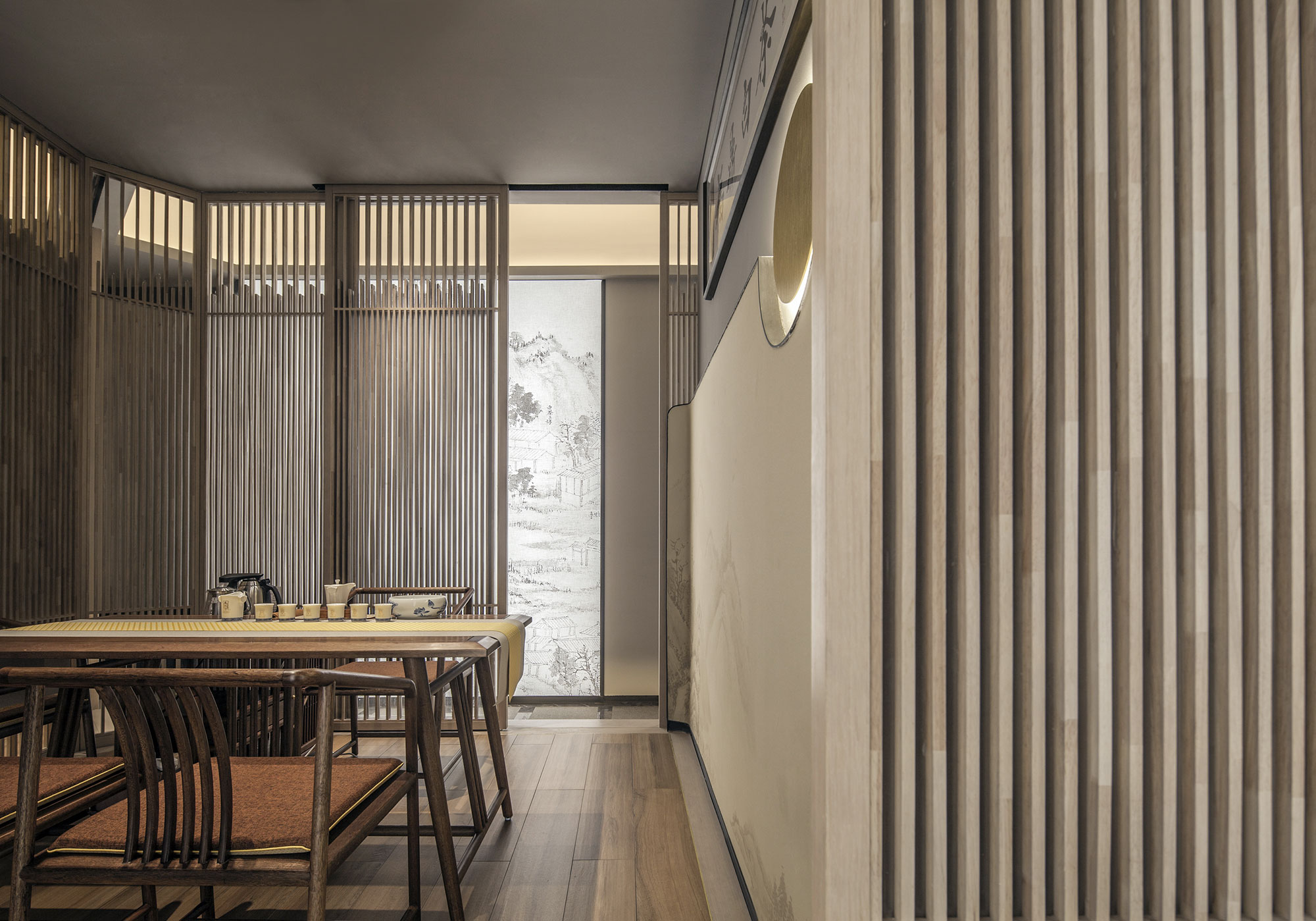 茶楼的风格多样,但以中式风格最能展示茶馆之神韵,以高空间,大深度的表现手法深化设计。材料一般以天然木材为主要装饰材料,保持材料的原始纹理与色泽。同时色彩使用得当,可以突出气氛。此方案以中式轻奢的风格让顾客在感受茶香的同时又不失场景带来的安逸。