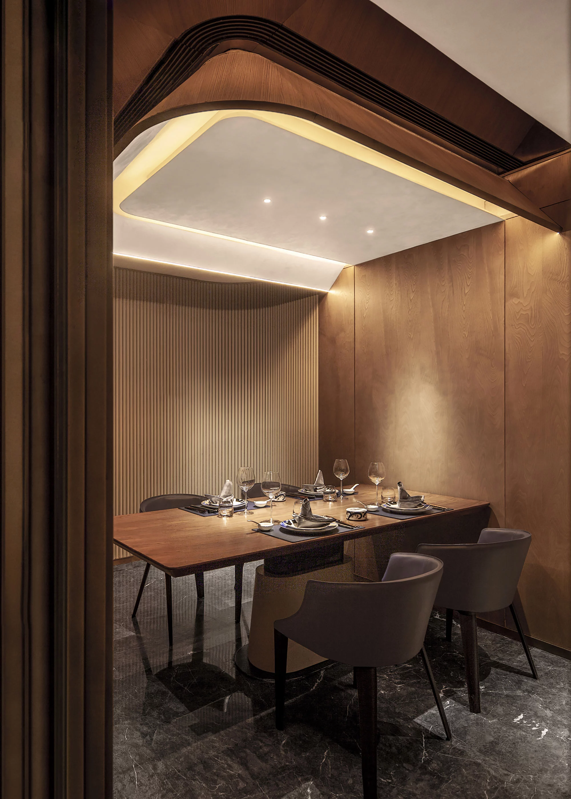 二层空间所有的墙面转折和天花棚角都使用了弧形元素,让客人在就餐中好似在海的环抱中,中间区域设有包房和传菜间,形成环形通道,使得动线如湾流般更加流畅。