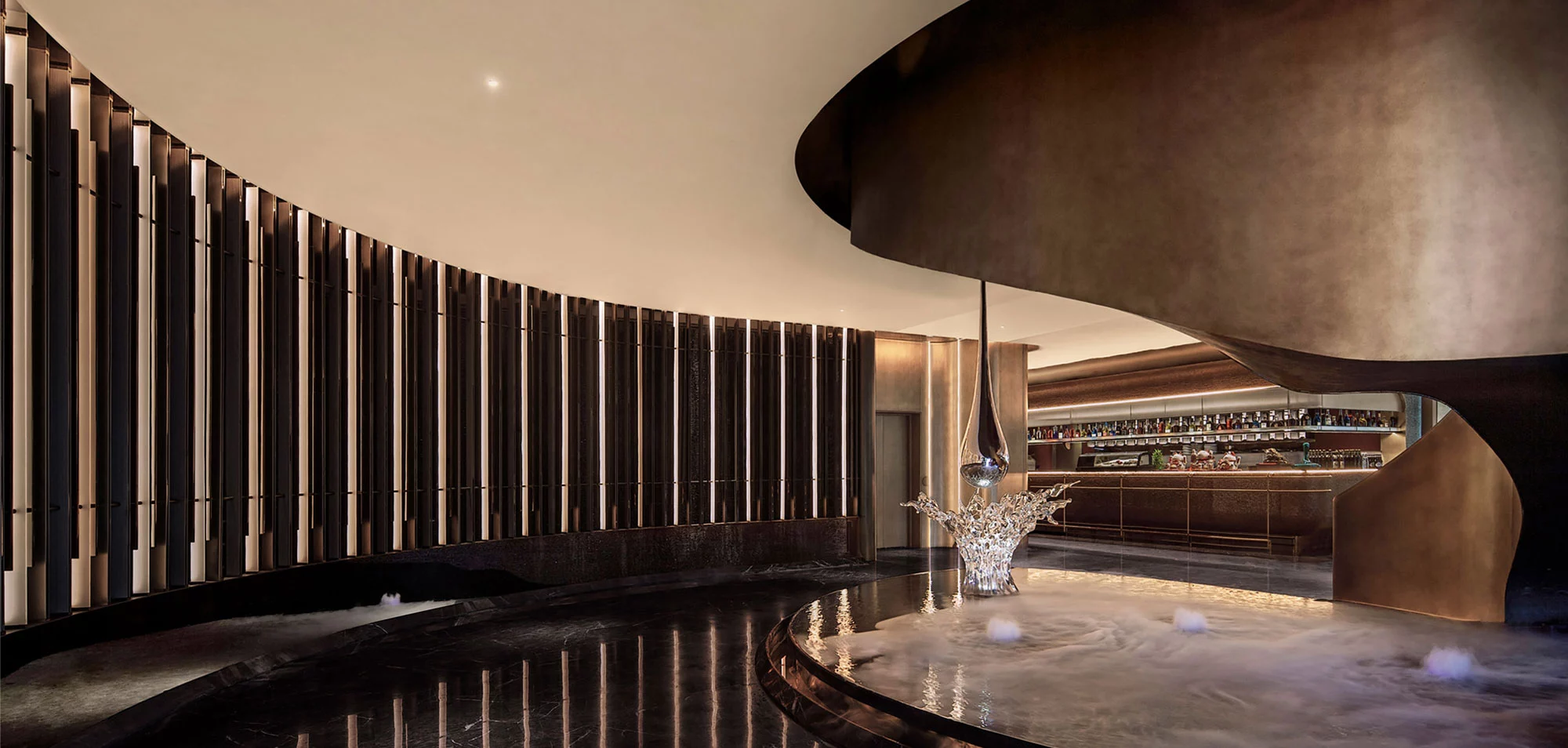 步入餐厅迎面所见整面墙水幕景观,水流自上而下汇集到底部后再延伸至楼梯底部的水池,不仅具备实用性,更增添了空间的灵动性。明档区域将就餐区分为两个部分,既方便服务又增加了私密性。后入口的水吧台作为一层的亮点,背面整面的玻璃窗不尽可以将夕阳的余辉带入室内,夏季还可整体升降让室内外融为一体。