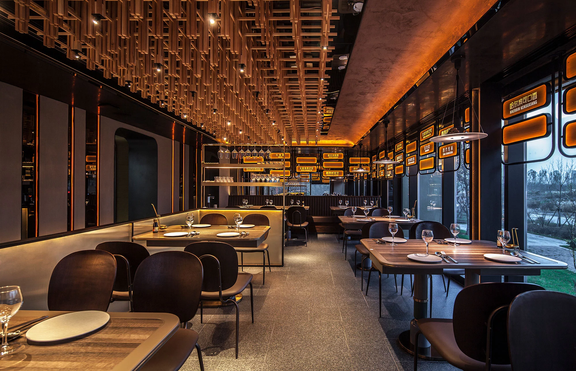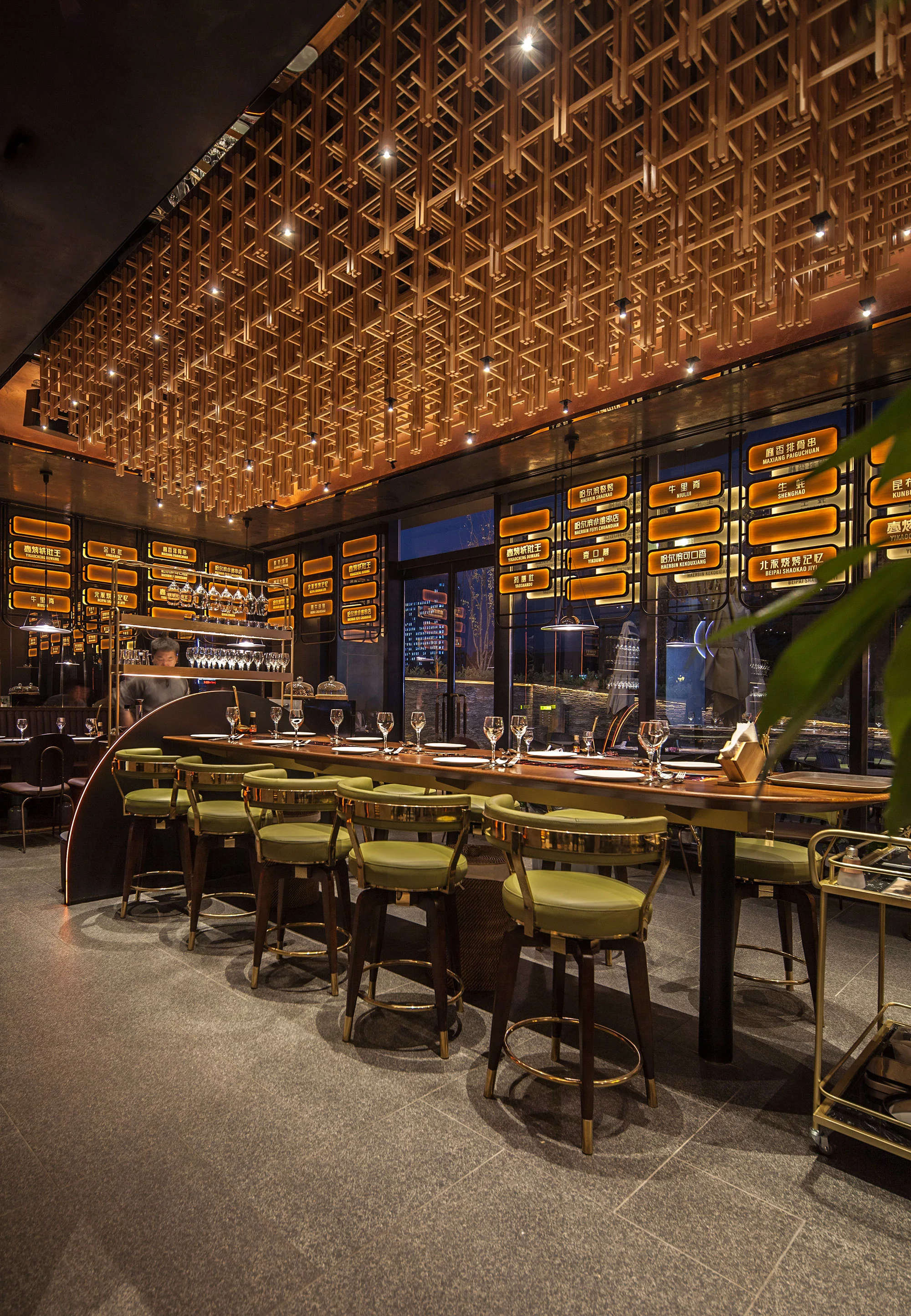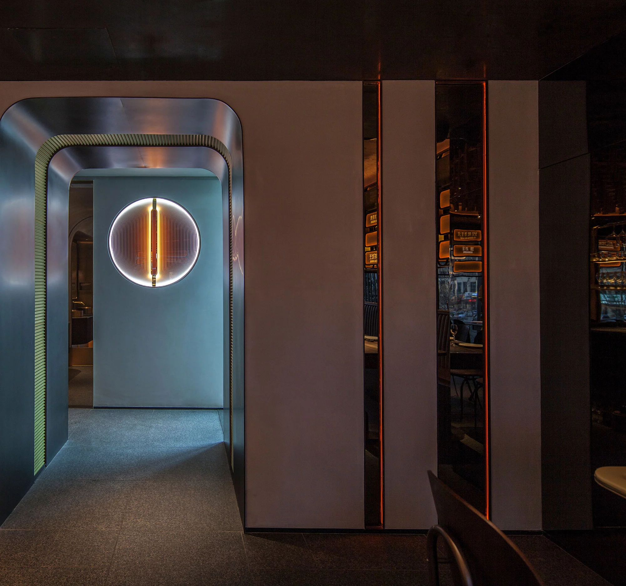 本案运用基本的材料,通过简洁明快的线条使其分块清晰,并富有肌理感;走进室内中心,共享空间中上升至二层的自动升降酒架,能够吸引人们的视线,向上引流;其棚面的镜面反射更加提升了空间的延伸感……