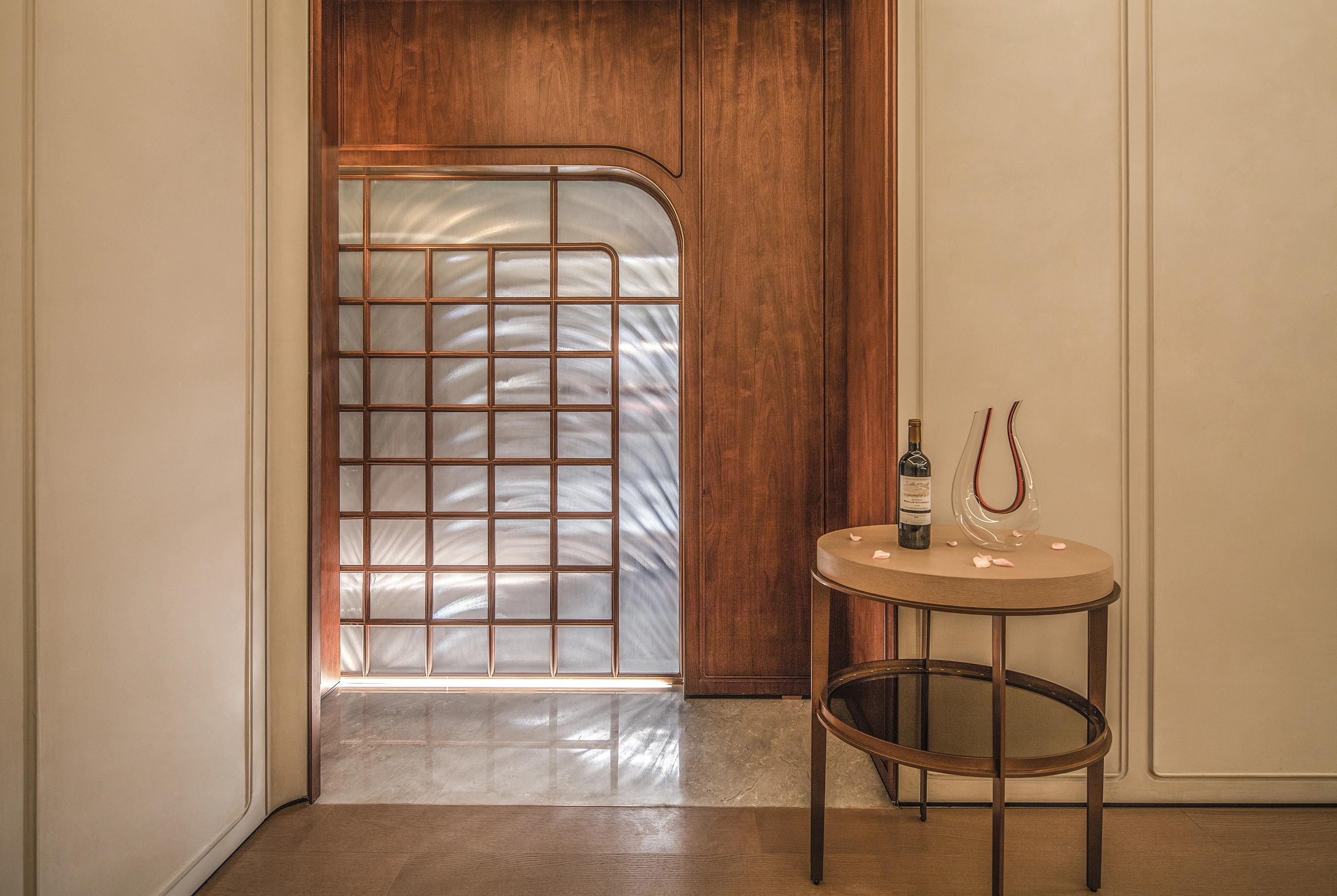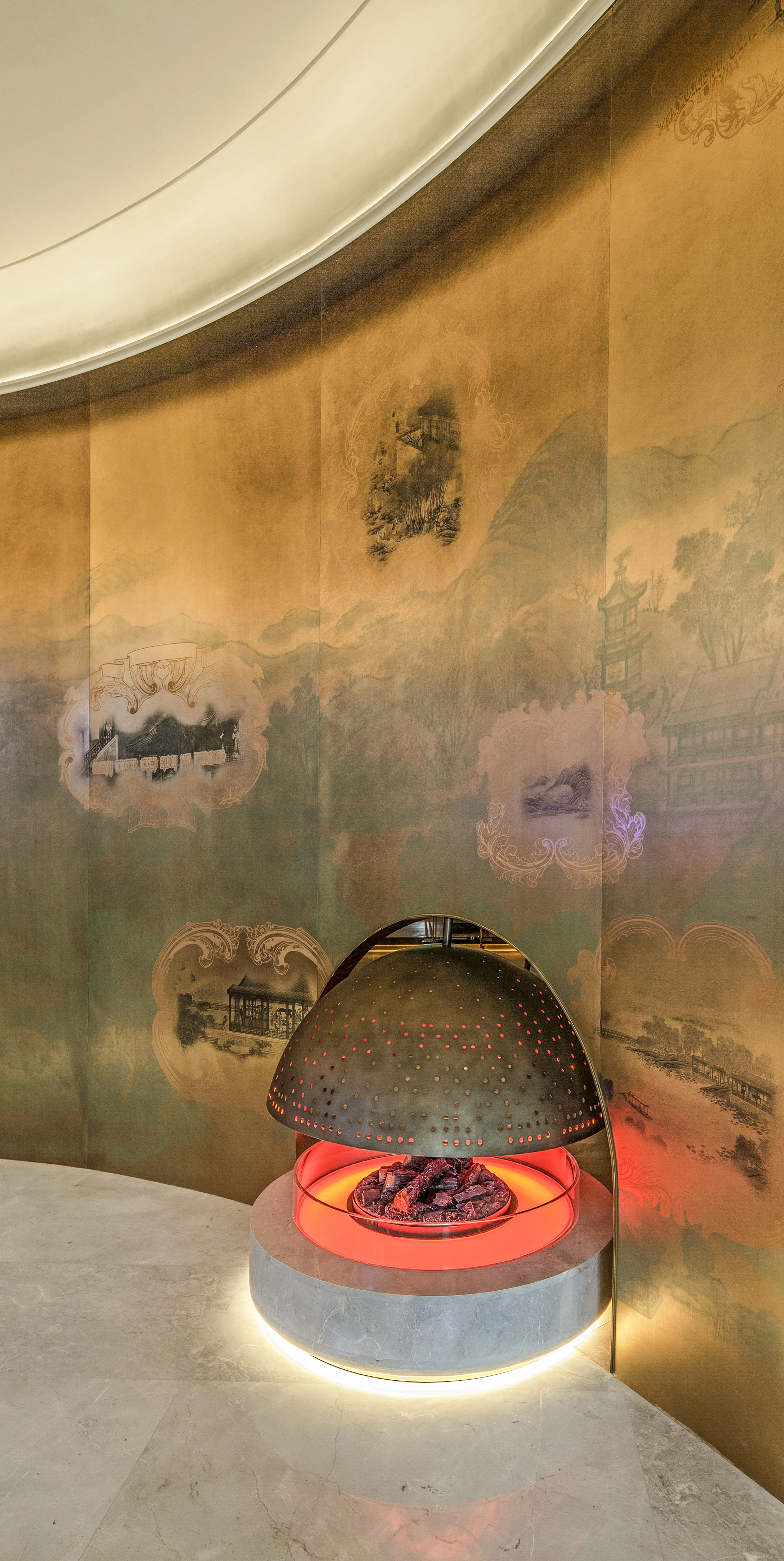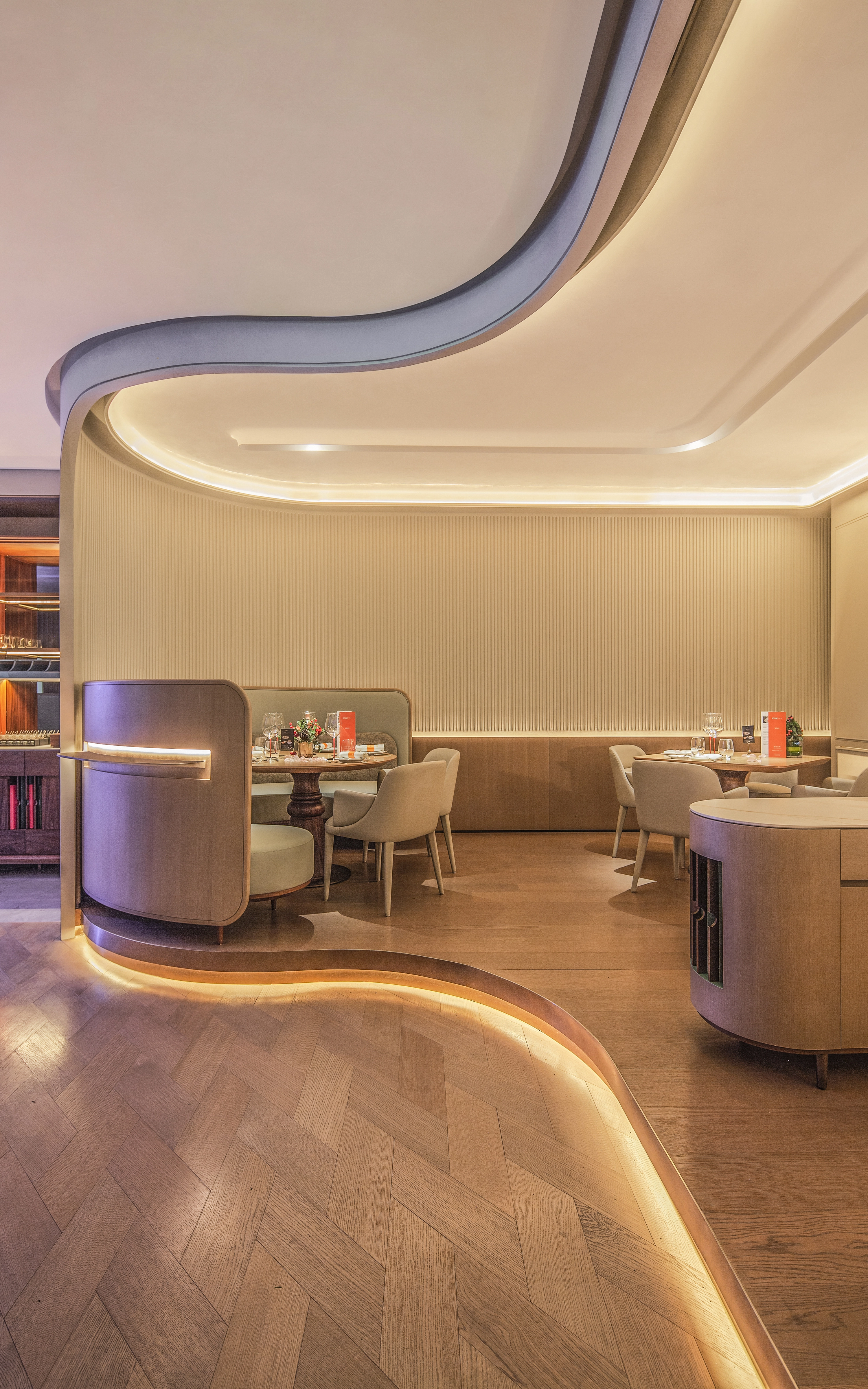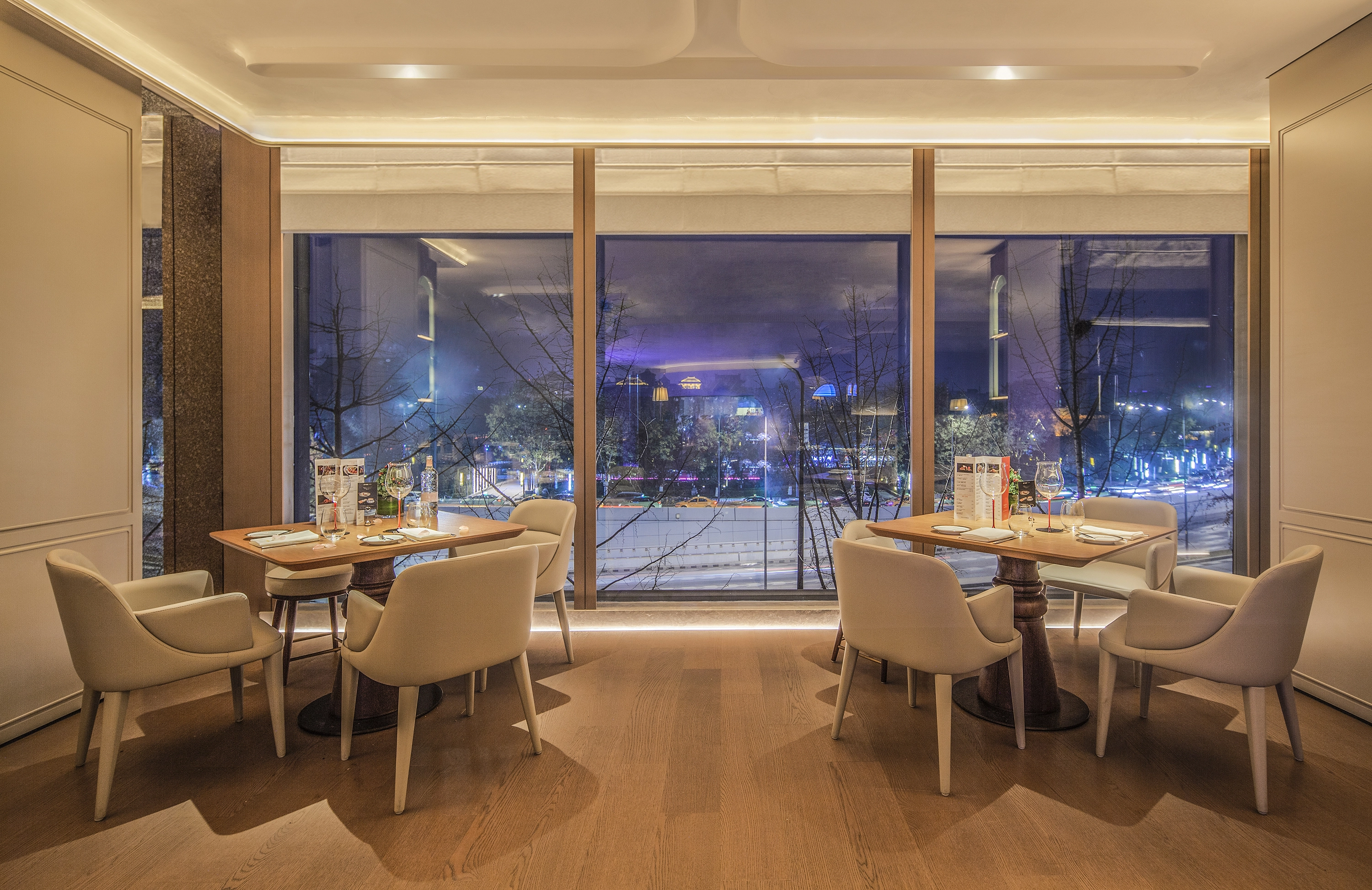 夜晚灯光幽谧,氛围与情调愈渐浓郁,暗示着空间内部某种非日常的精神与情绪的表达。在光线的映衬下表述雅致的情绪对牛排家文化的传承再塑造。