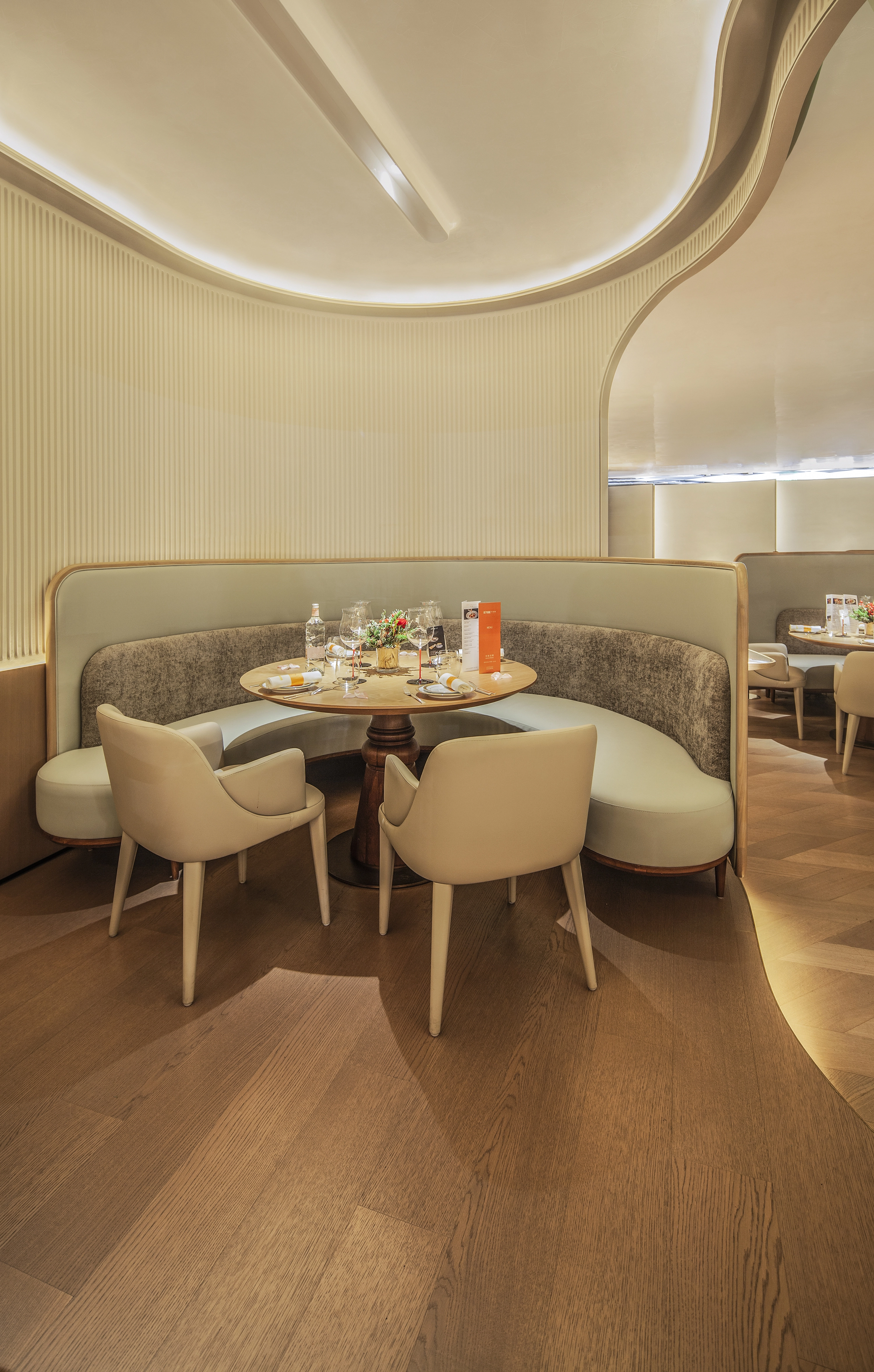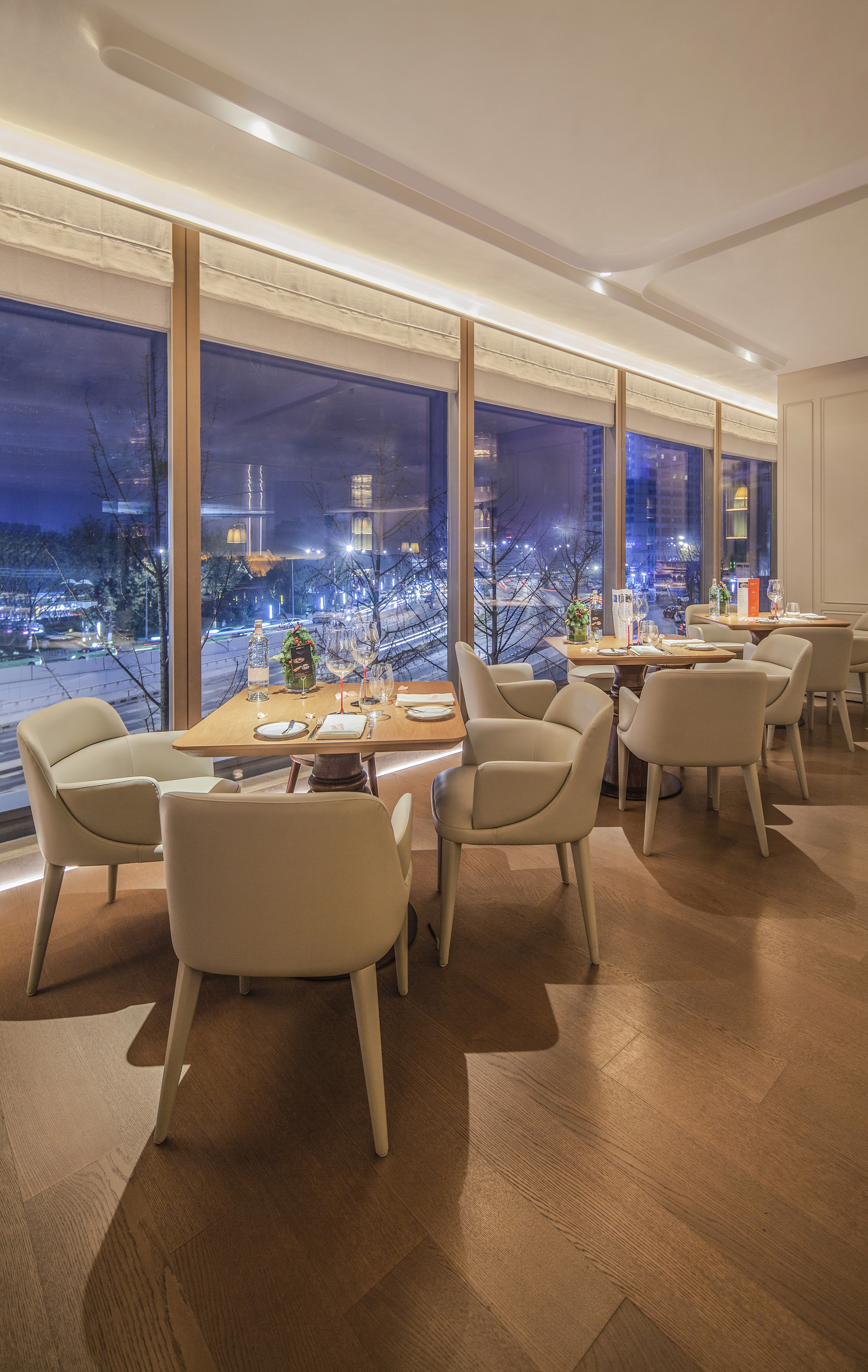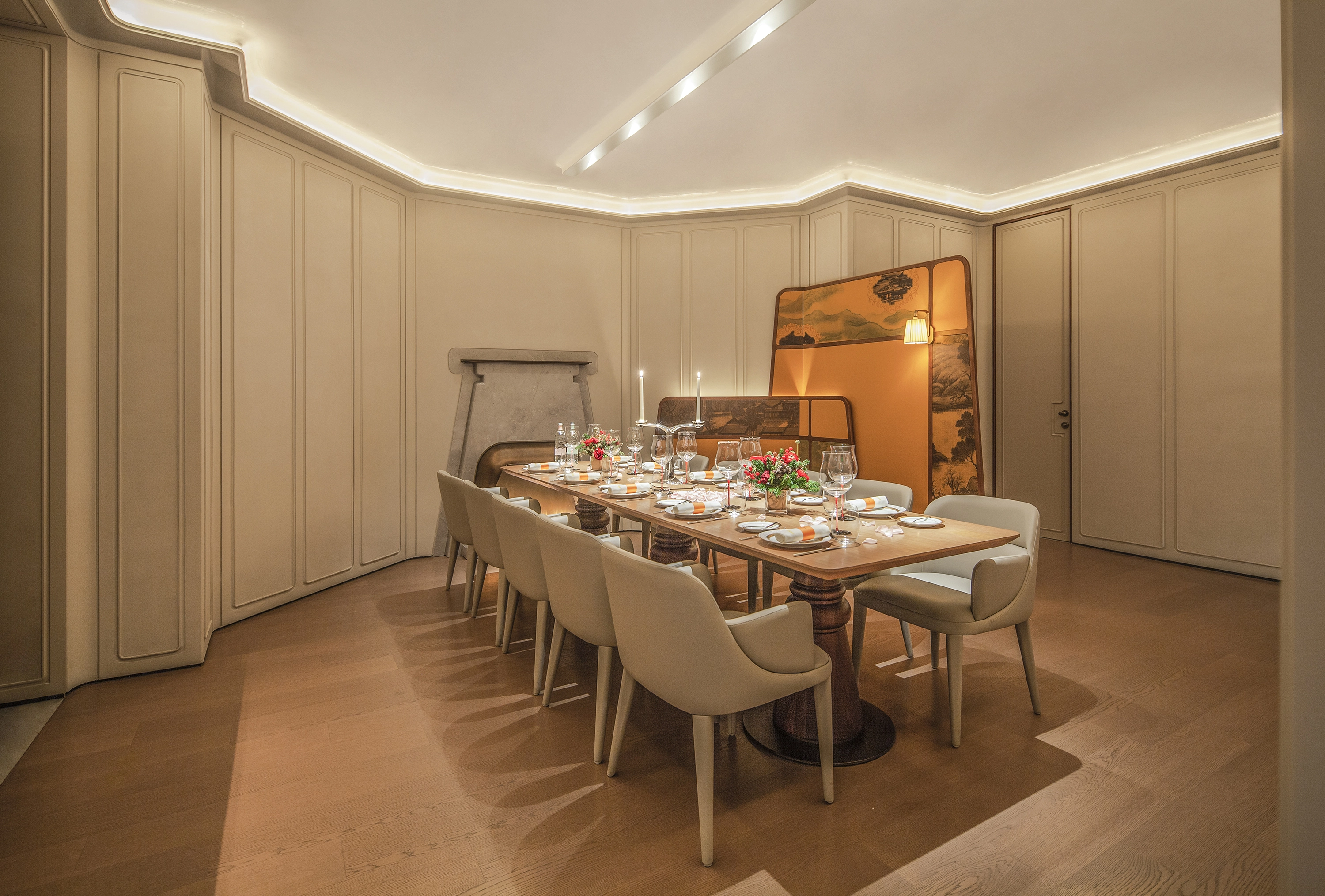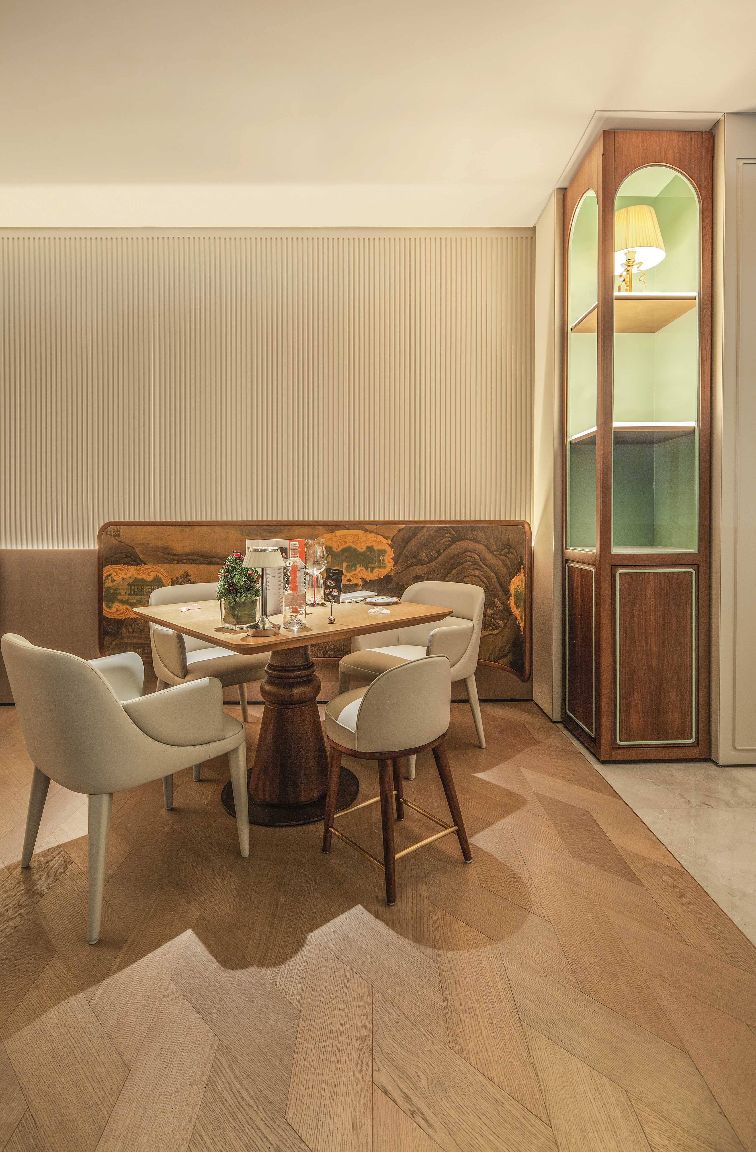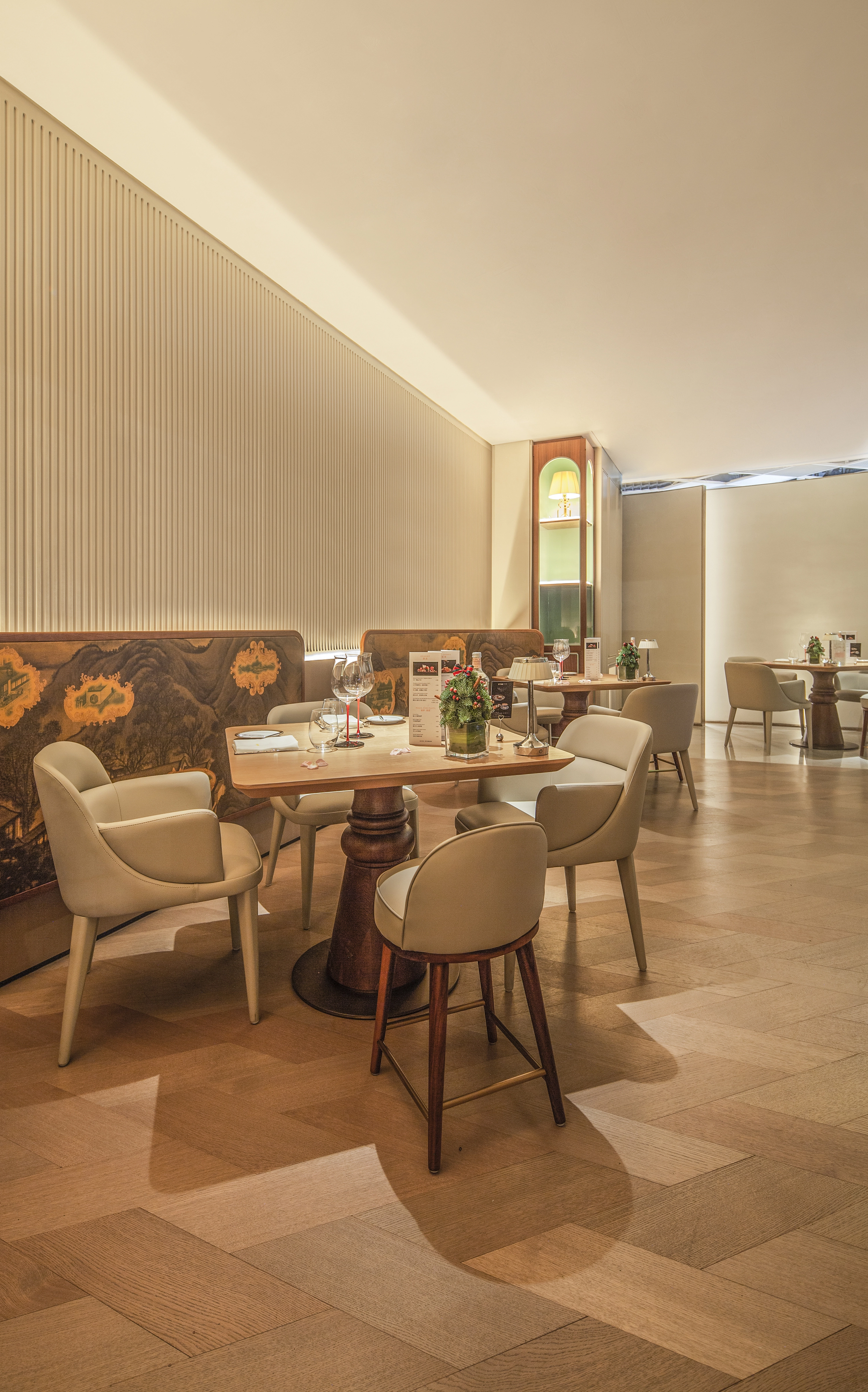 夜晚灯光幽谧,氛围与情调愈渐浓郁,暗示着空间内部某种非日常的精神与情绪的表达。在光线的映衬下表述雅致的情绪对牛排家文化的传承再塑造。