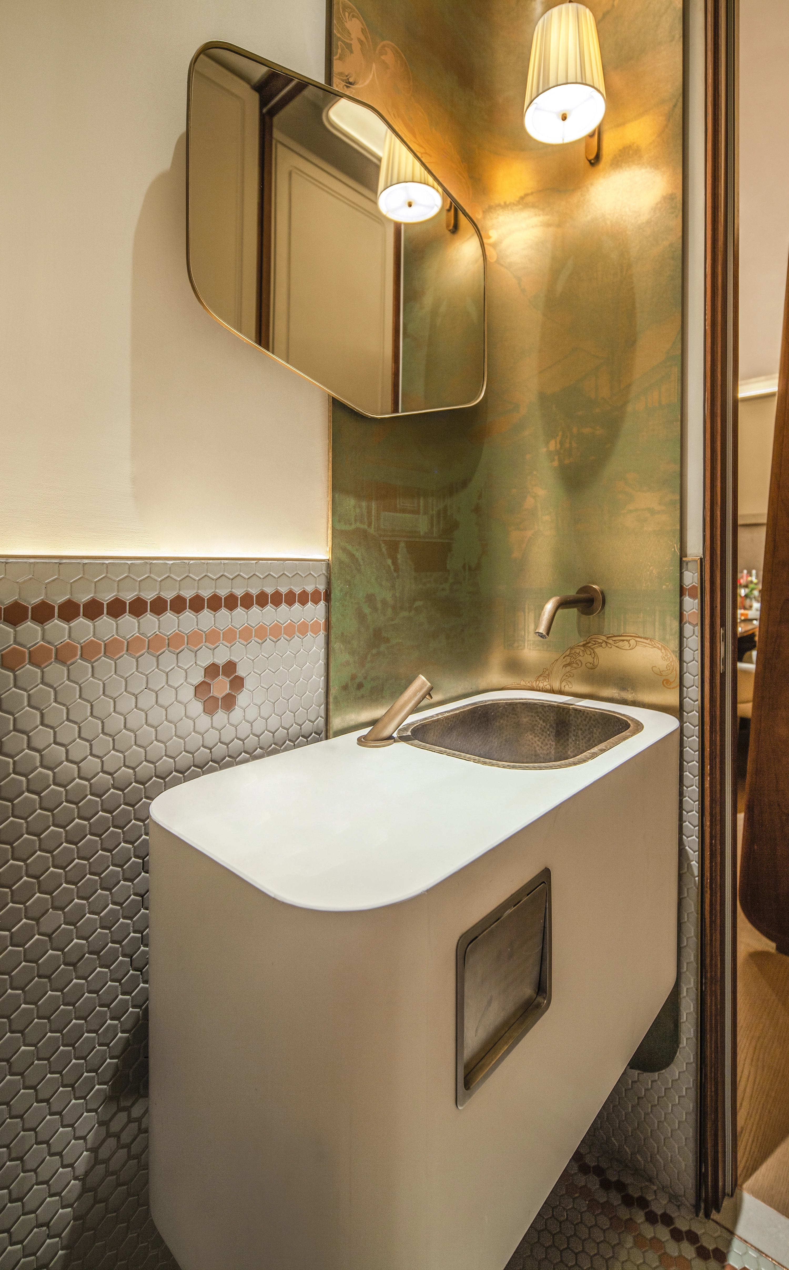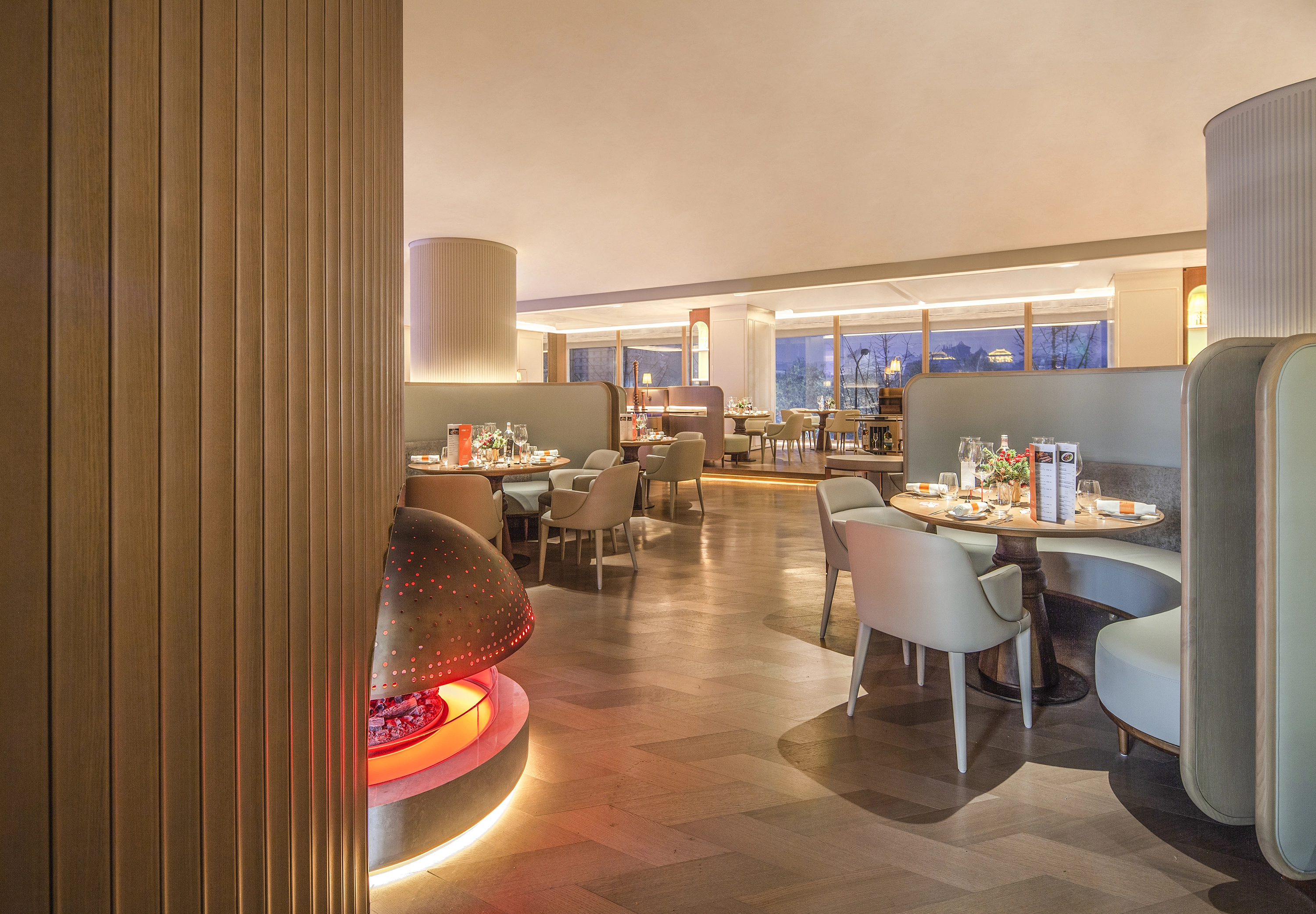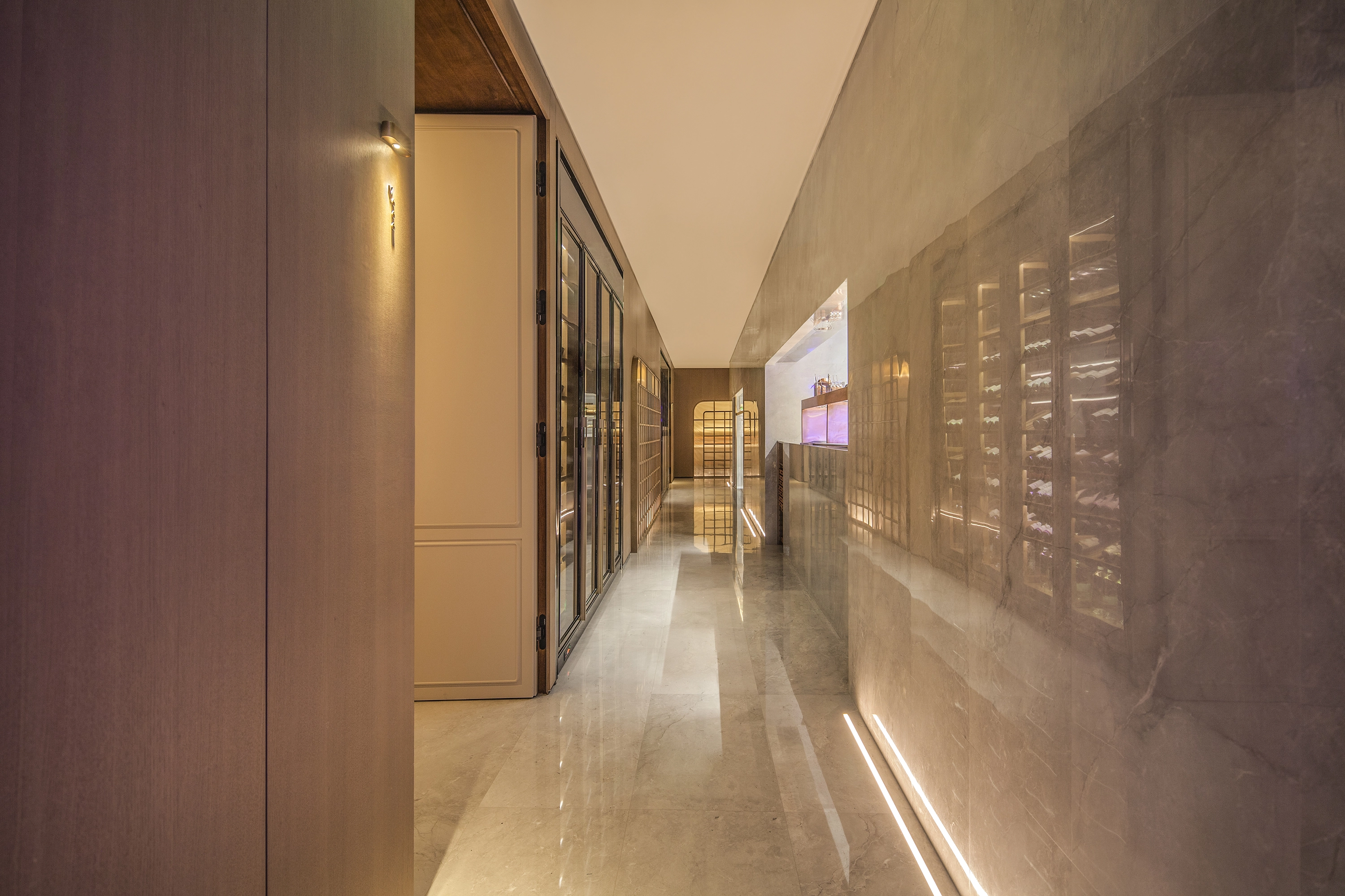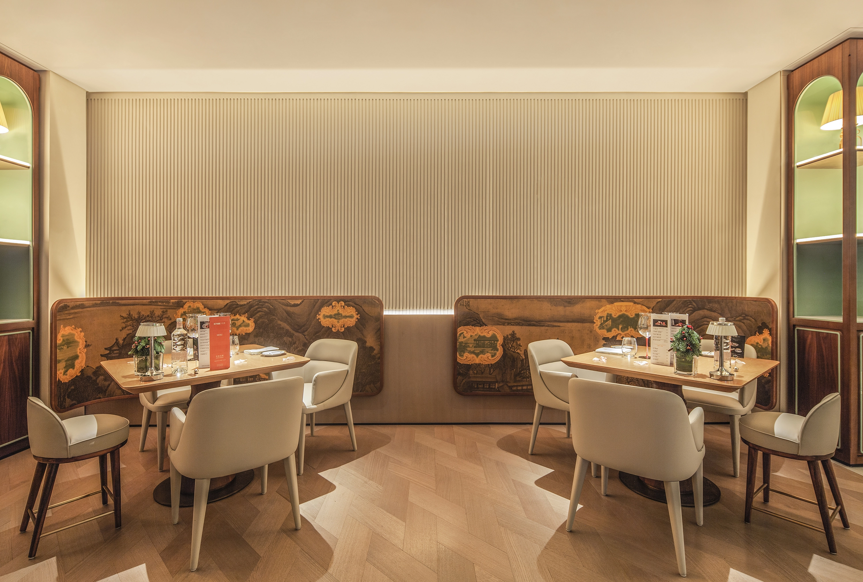 夜晚灯光幽谧,氛围与情调愈渐浓郁,暗示着空间内部某种非日常的精神与情绪的表达。在光线的映衬下表述雅致的情绪对牛排家文化的传承再塑造。