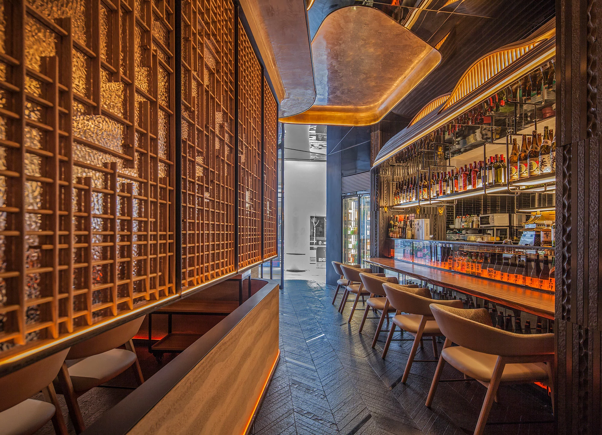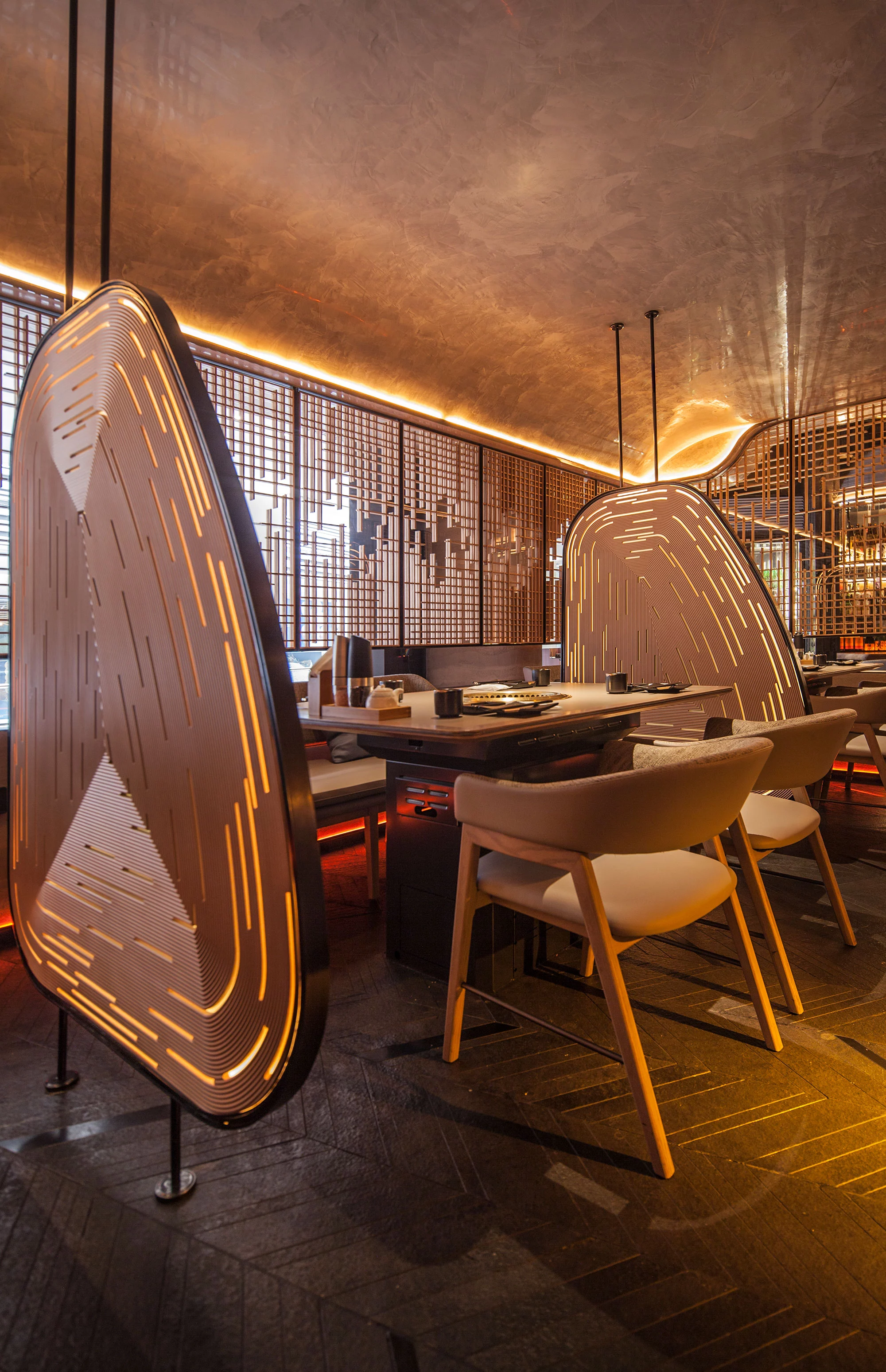 本色木格花窗与水纹玻璃的交错,部分的遮挡为空间增添一份私密感,创造出一种深层次的幻觉,让人们在流动的空间中停滞,享受其美之时却忘时间的流逝。