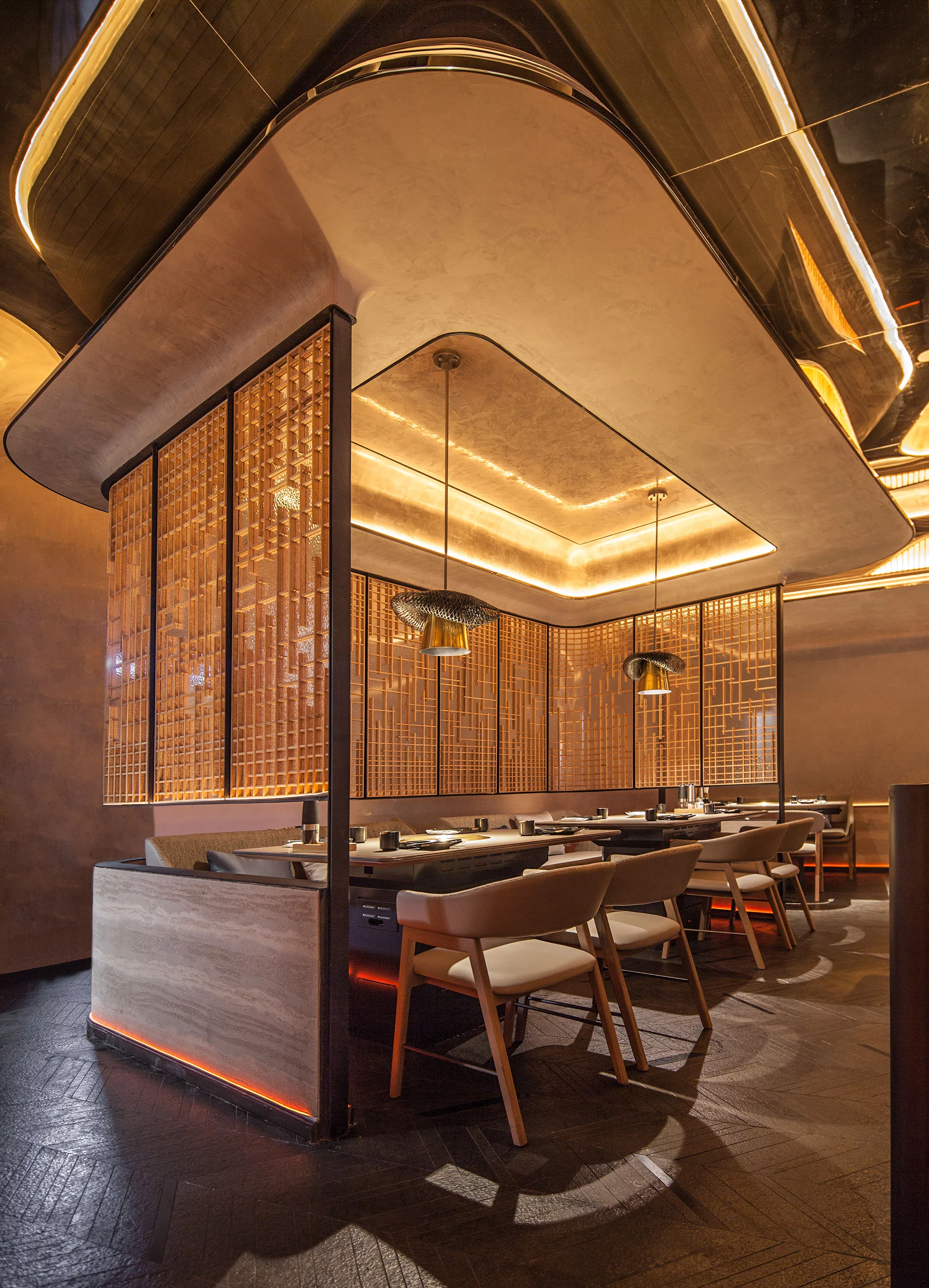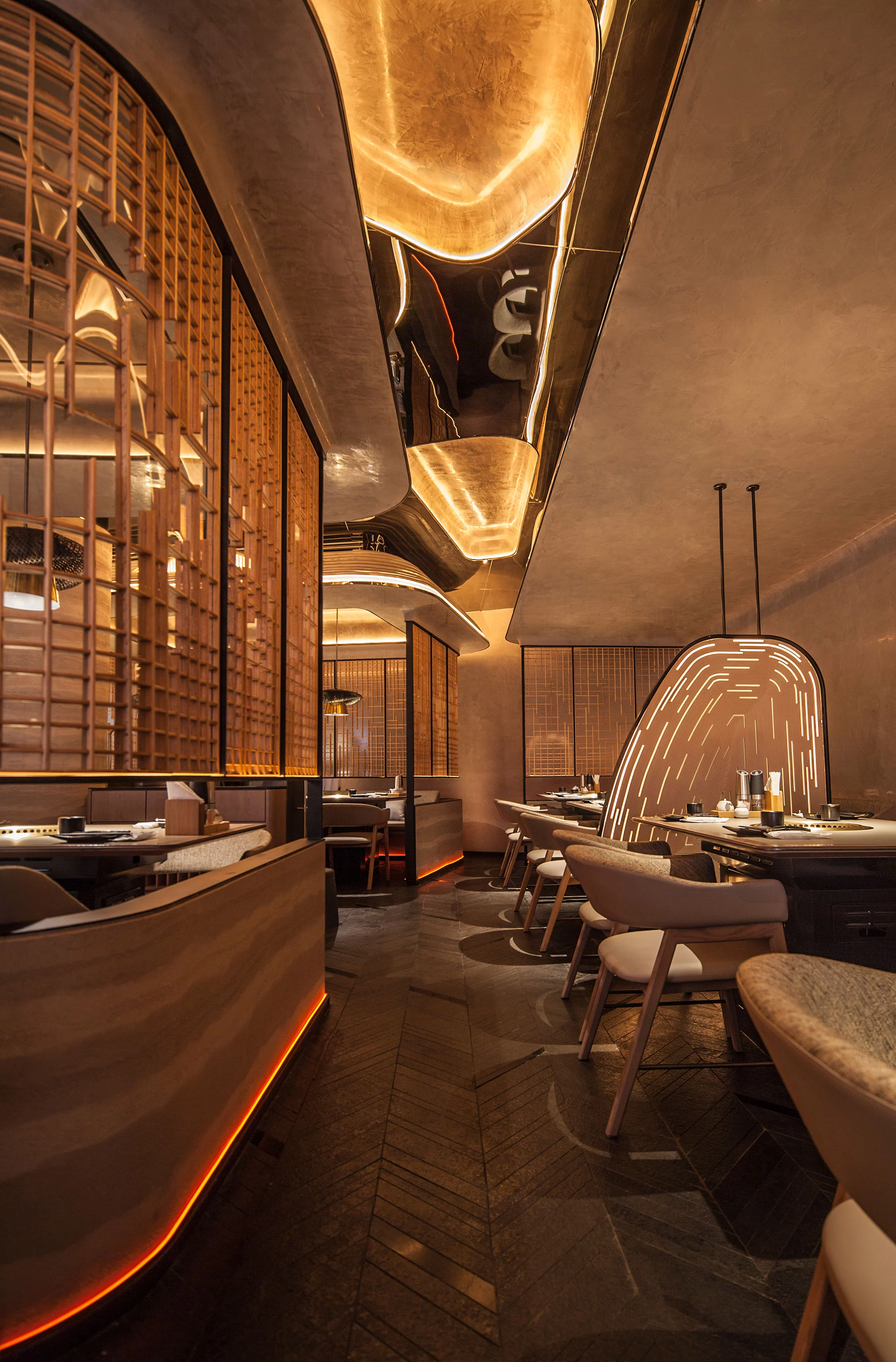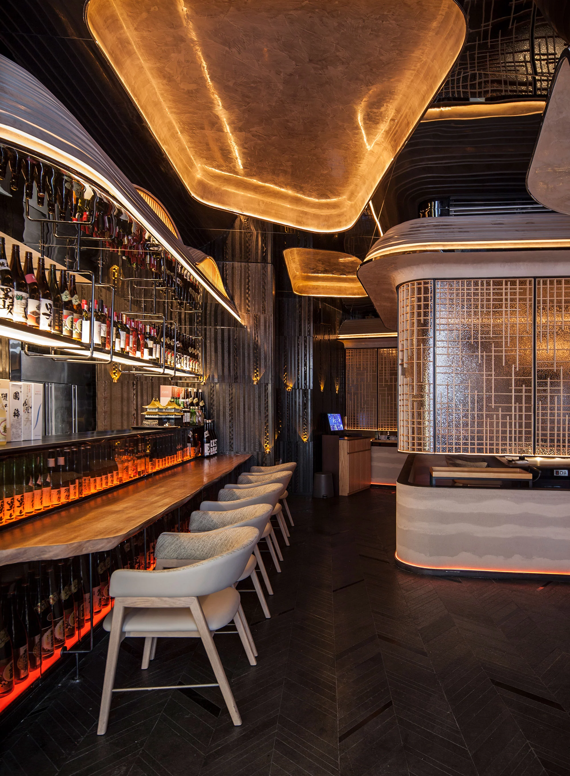 曲线贯穿整个空间打破原有的束缚,随意中却带有一份秩序感,微弱的光感,提高空间的深度,增加暧昧的氛围,融入环境,才能属于环境。