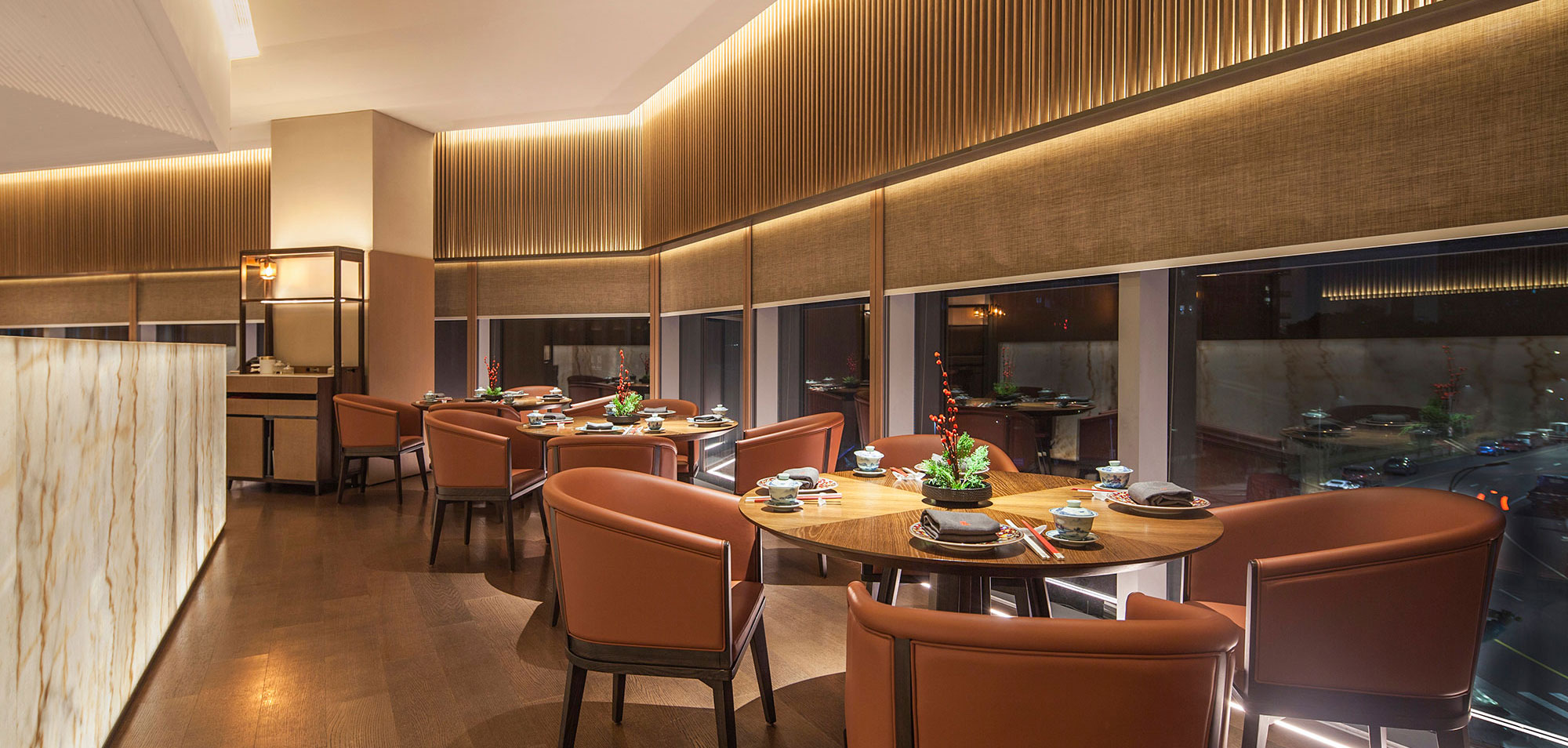 局部细节、质感、几何上呈现出简洁整体的一面,采光的木格栅在不同时间段融入不同的采光背景使其更加流光溢彩。简洁的几何和线条的节奏将整个空间串联起来。餐厅多个位置的民族图案通过叠加、分割在空间上产生映衬的色彩氛围。