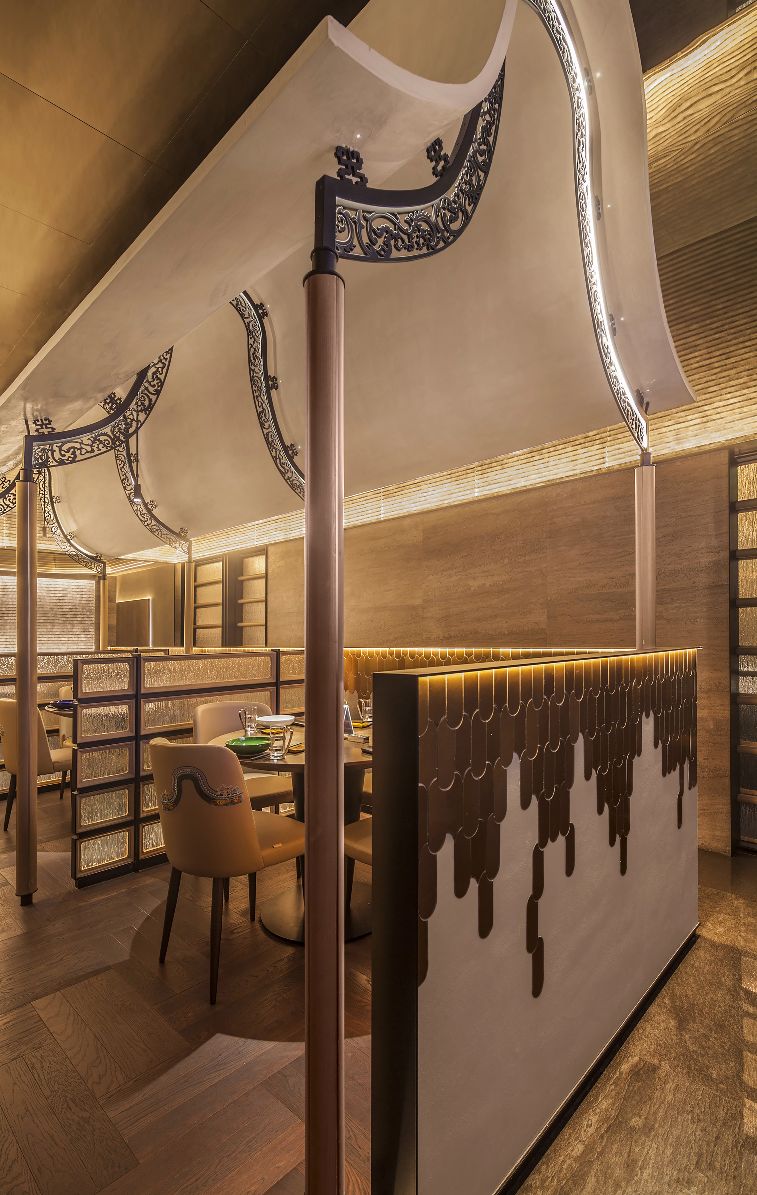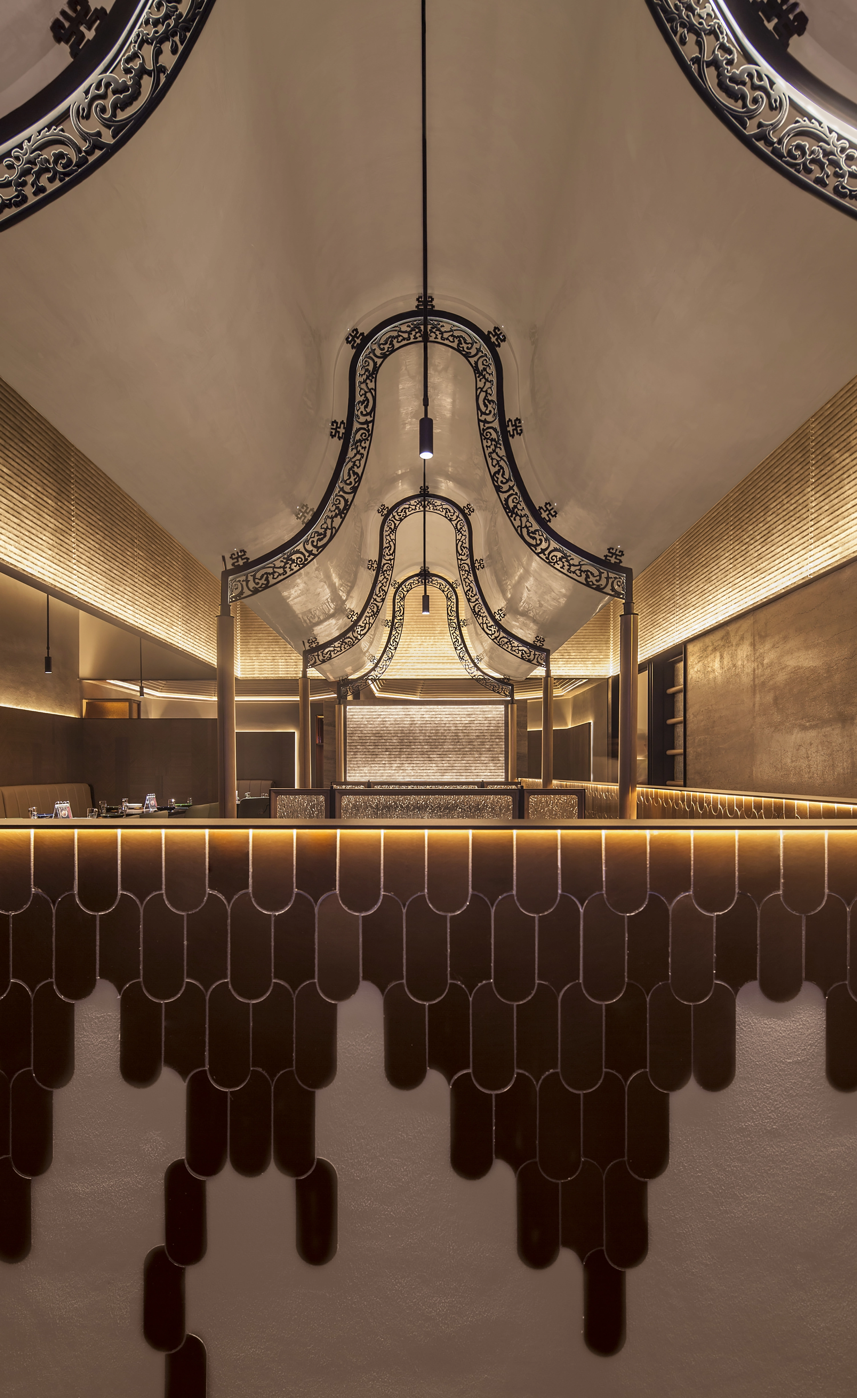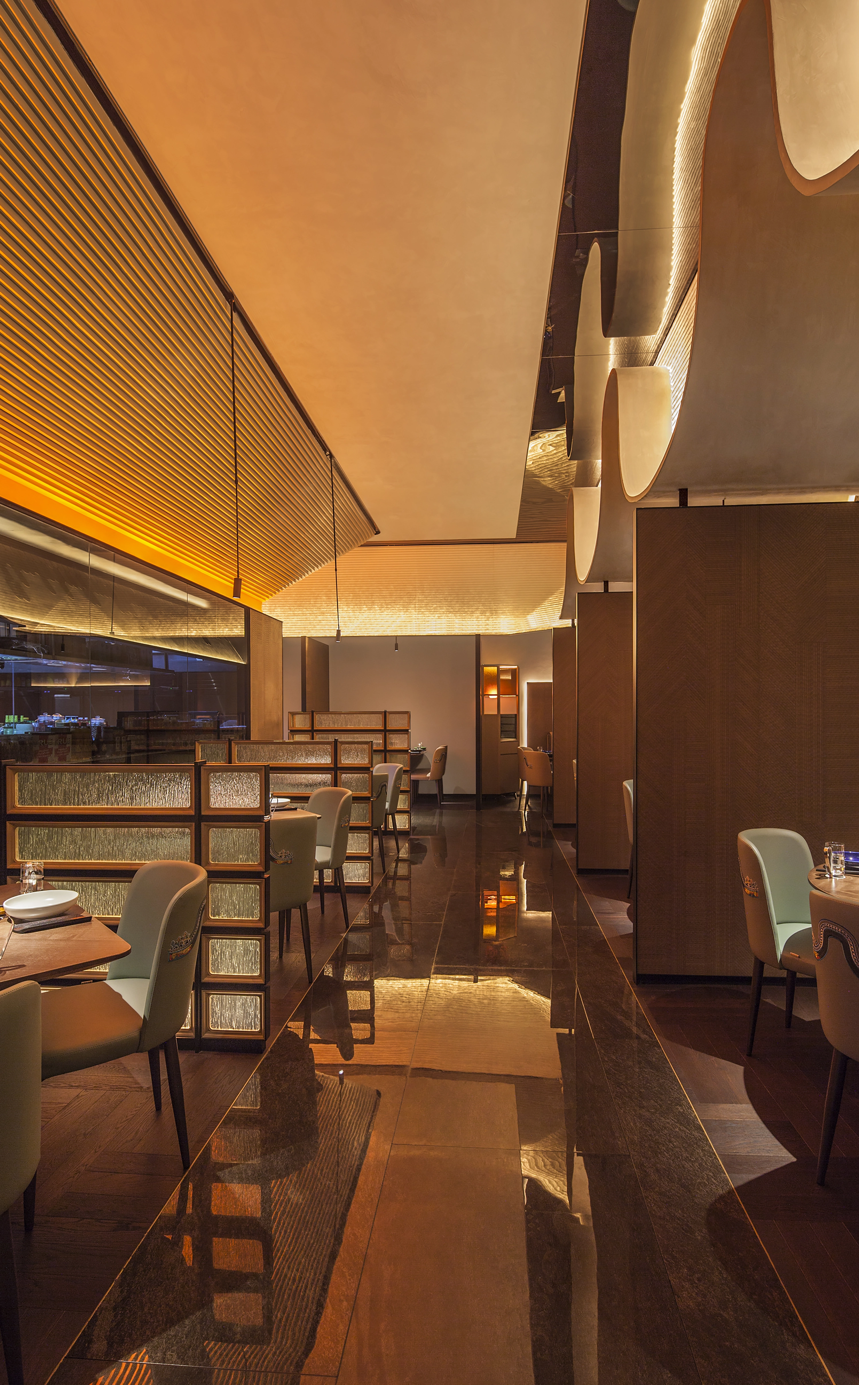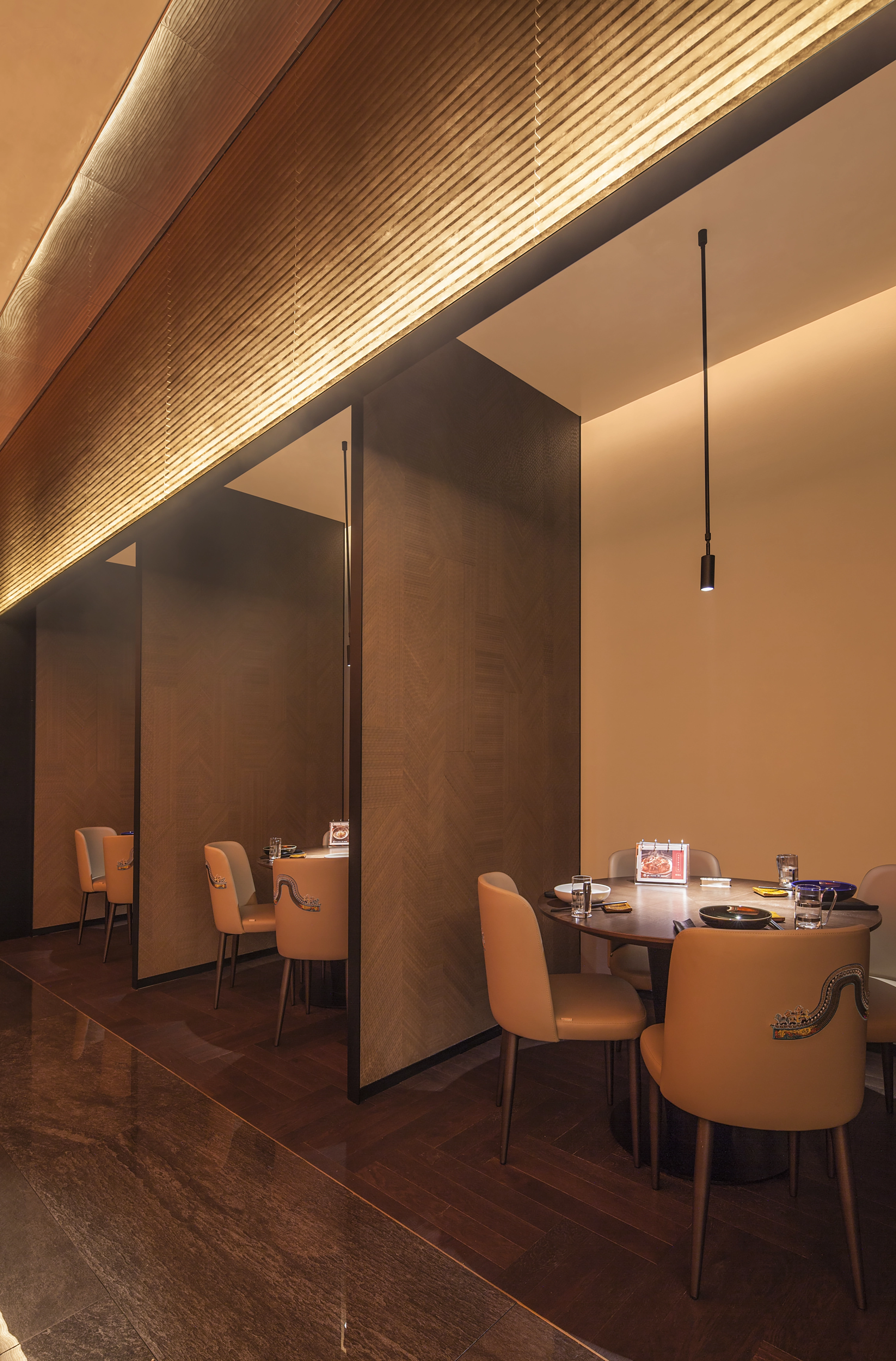 虚实的光线与文宝宣纸贯穿的上层空间在棚面幽若荡漾,建造出有序为整的用餐空间场域。