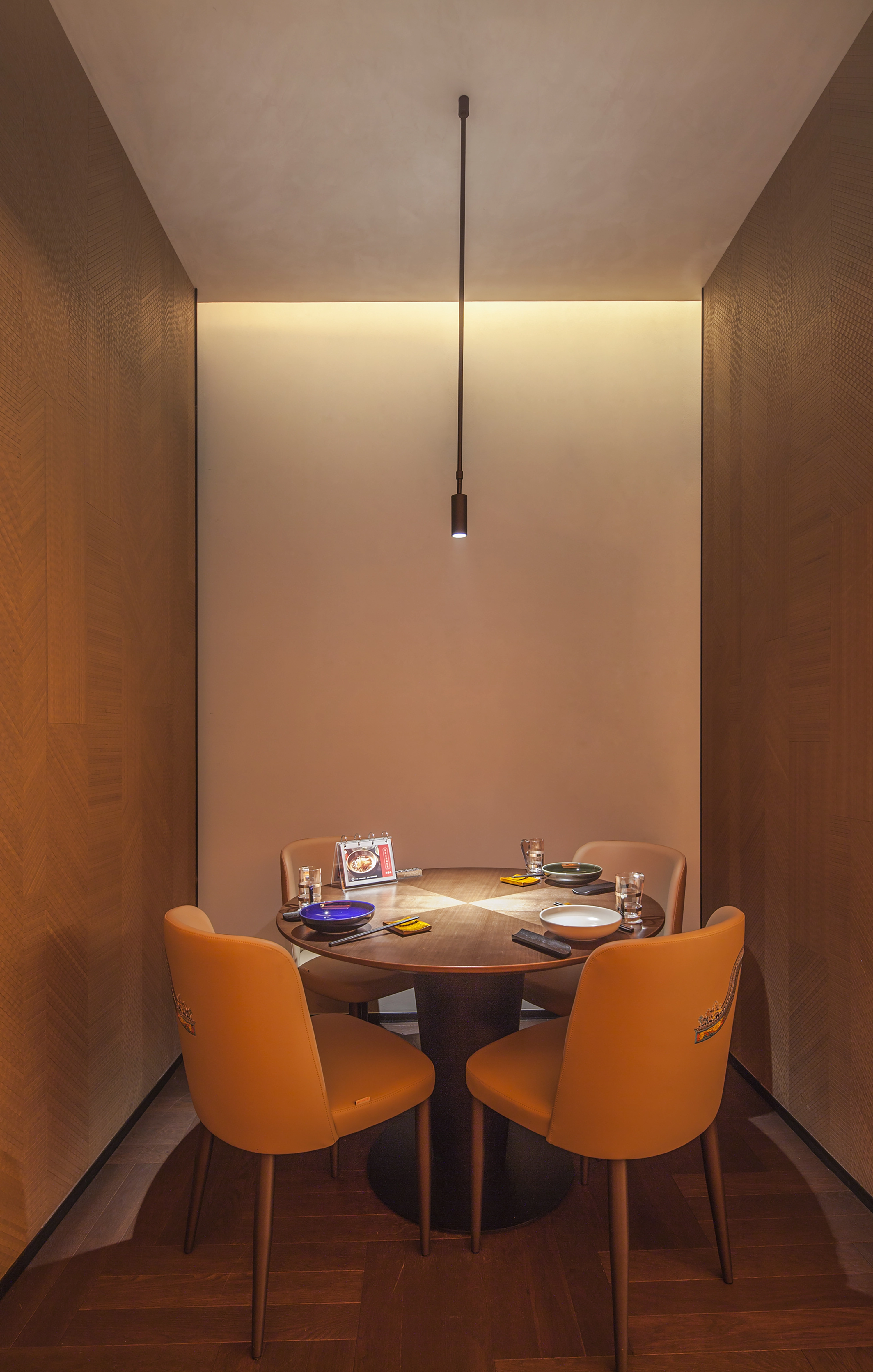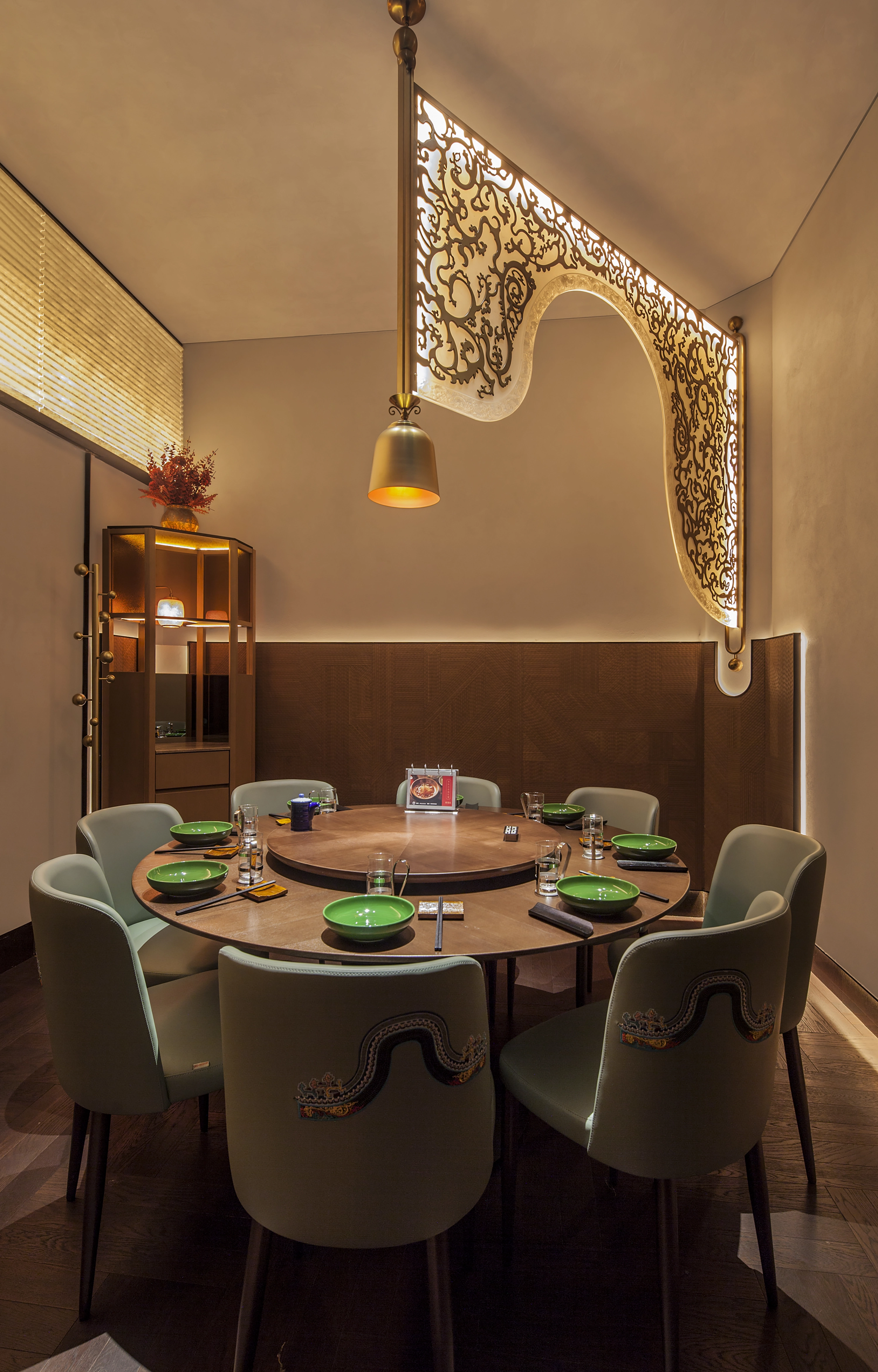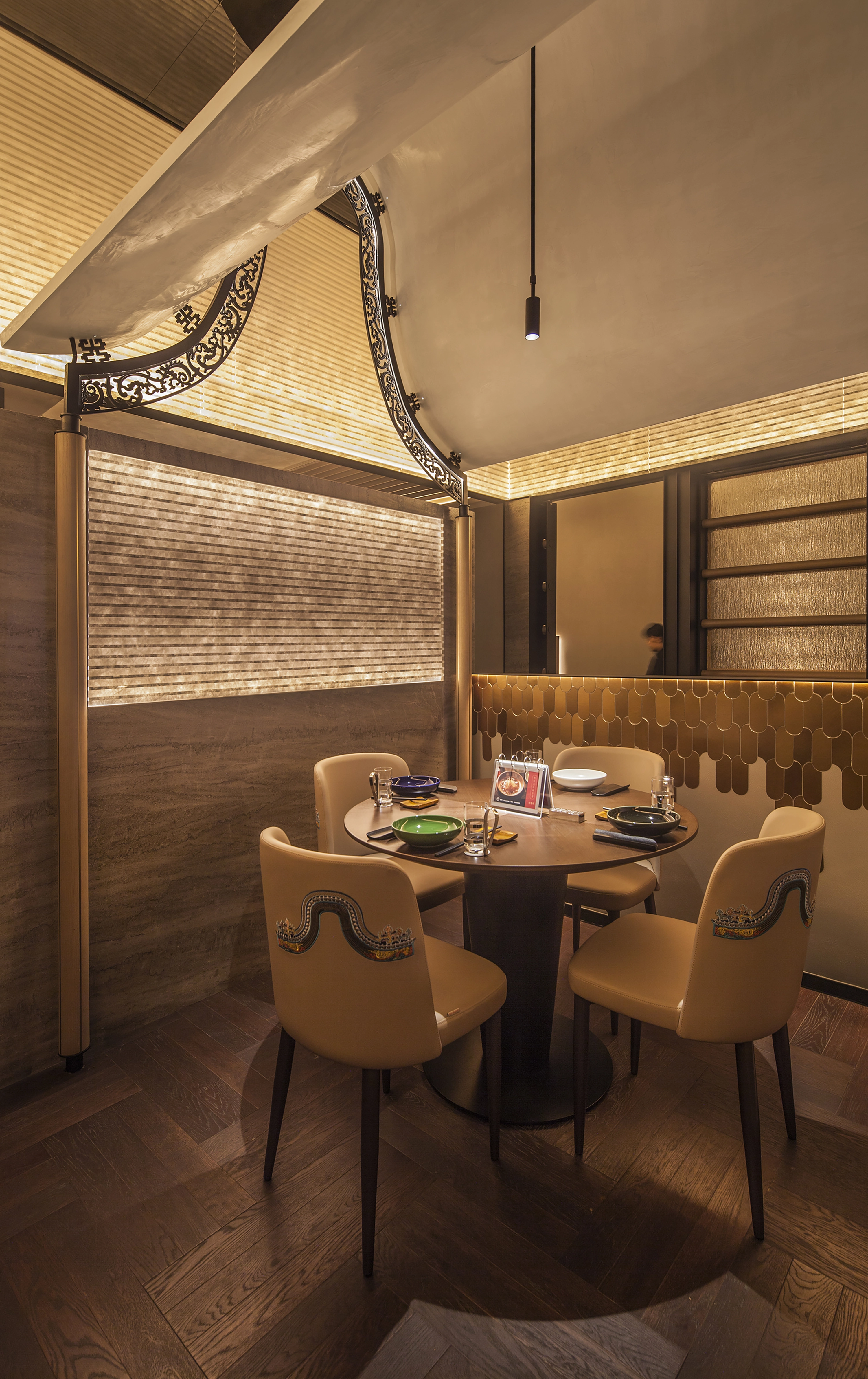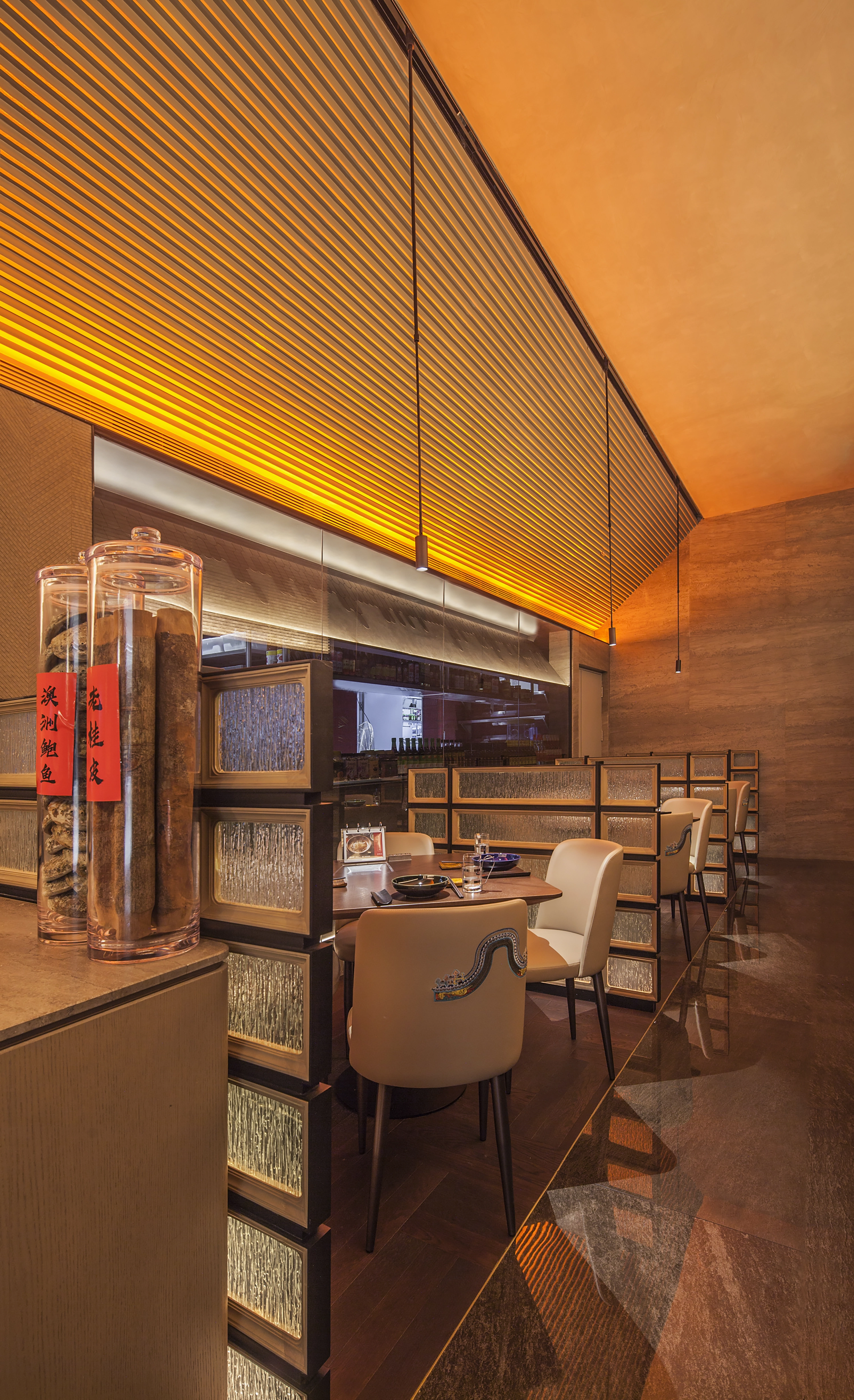 虚实的光线与文宝宣纸贯穿的上层空间在棚面幽若荡漾,建造出有序为整的用餐空间场域。