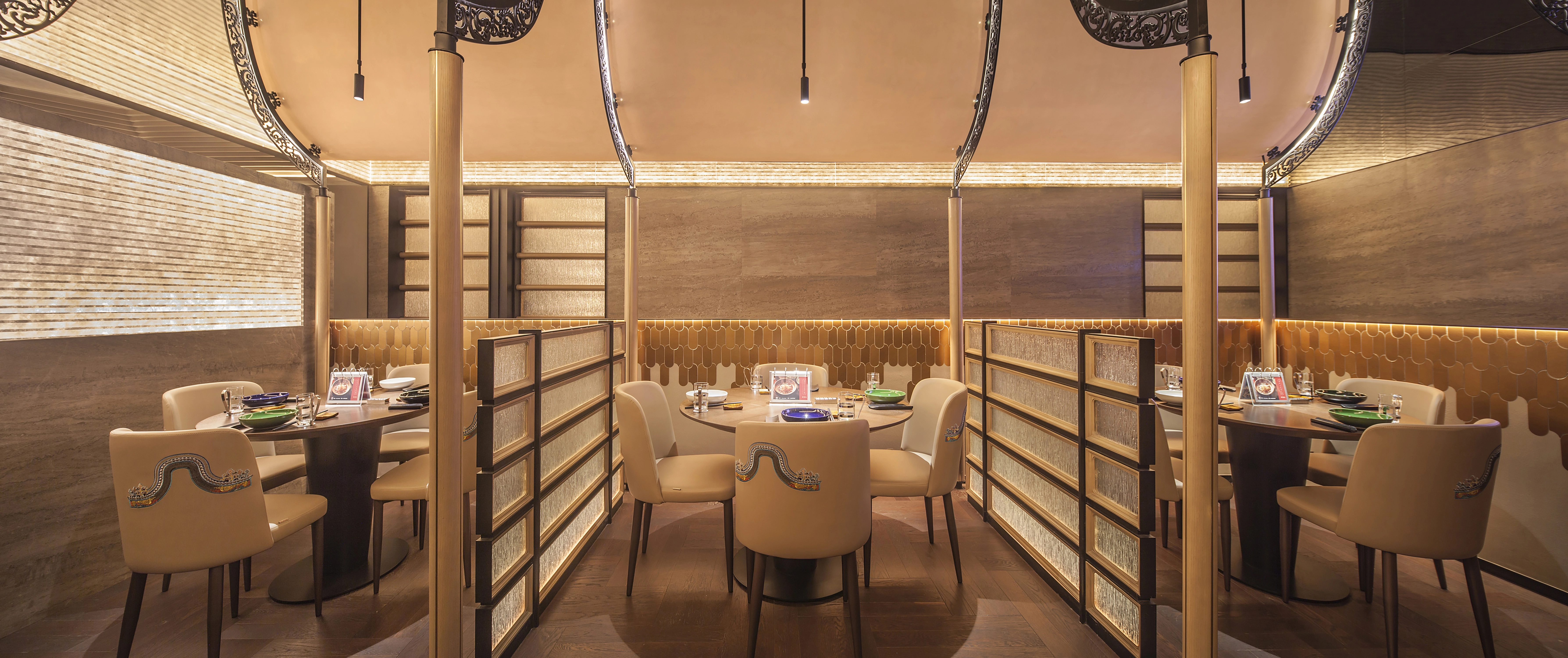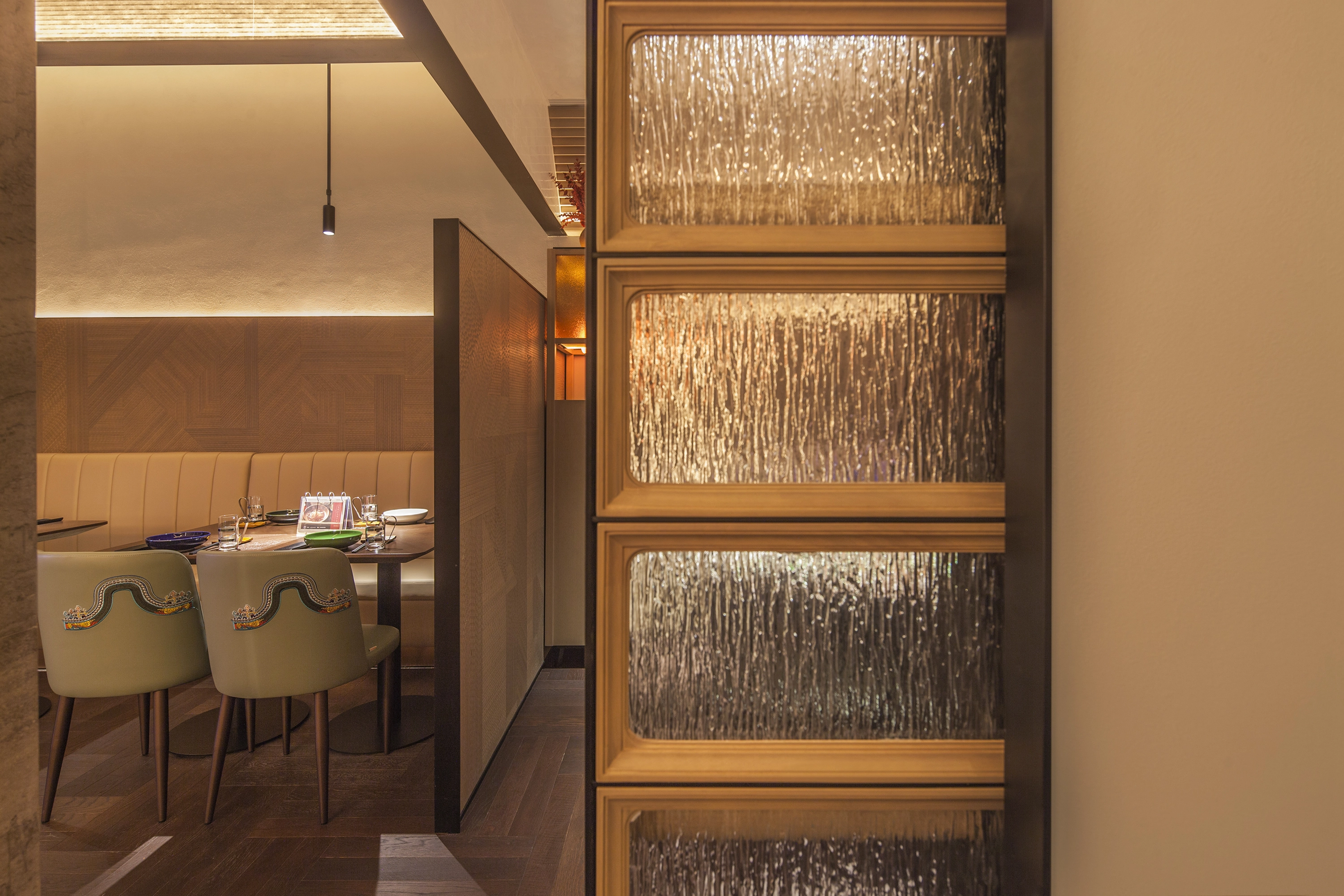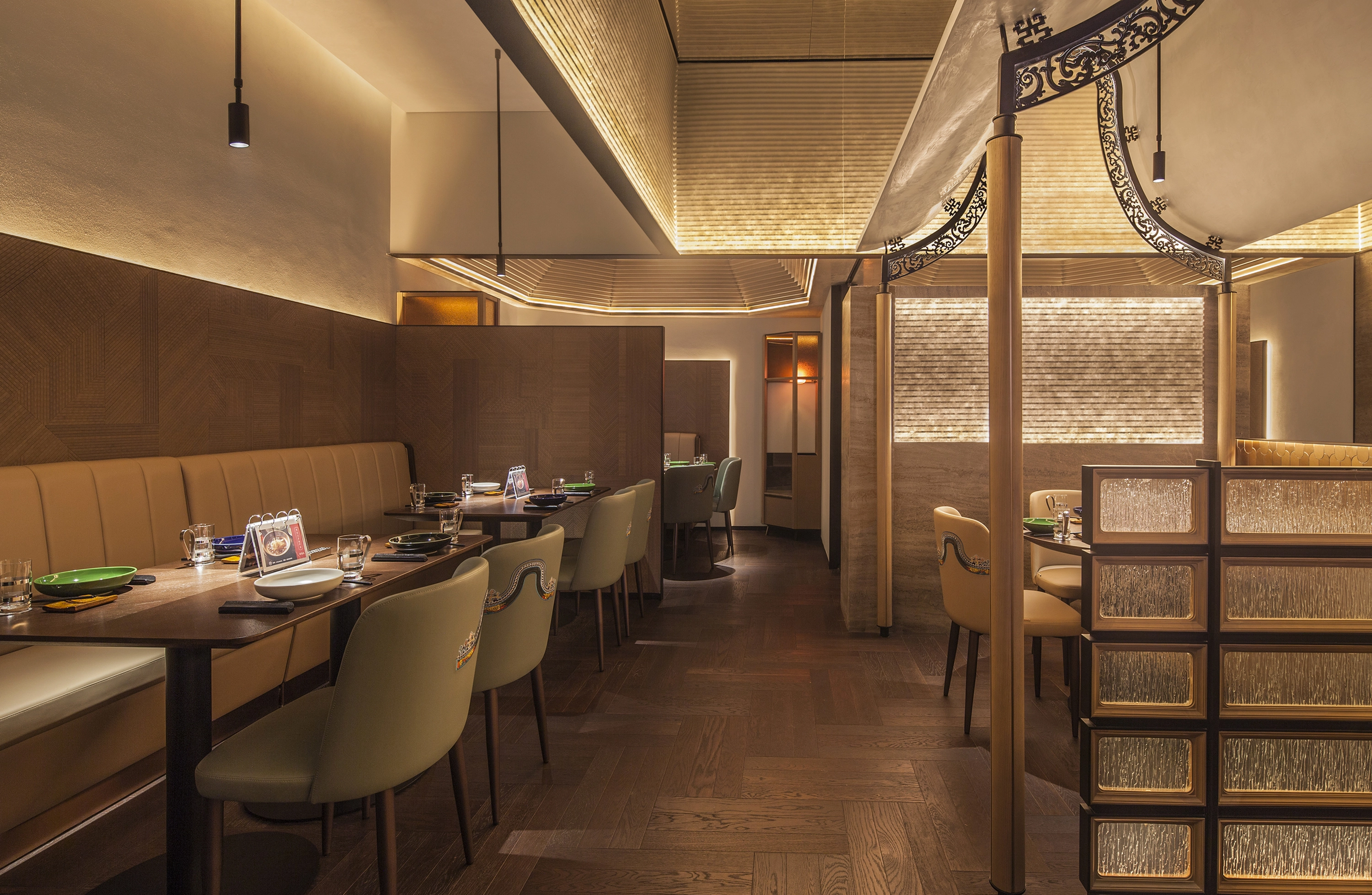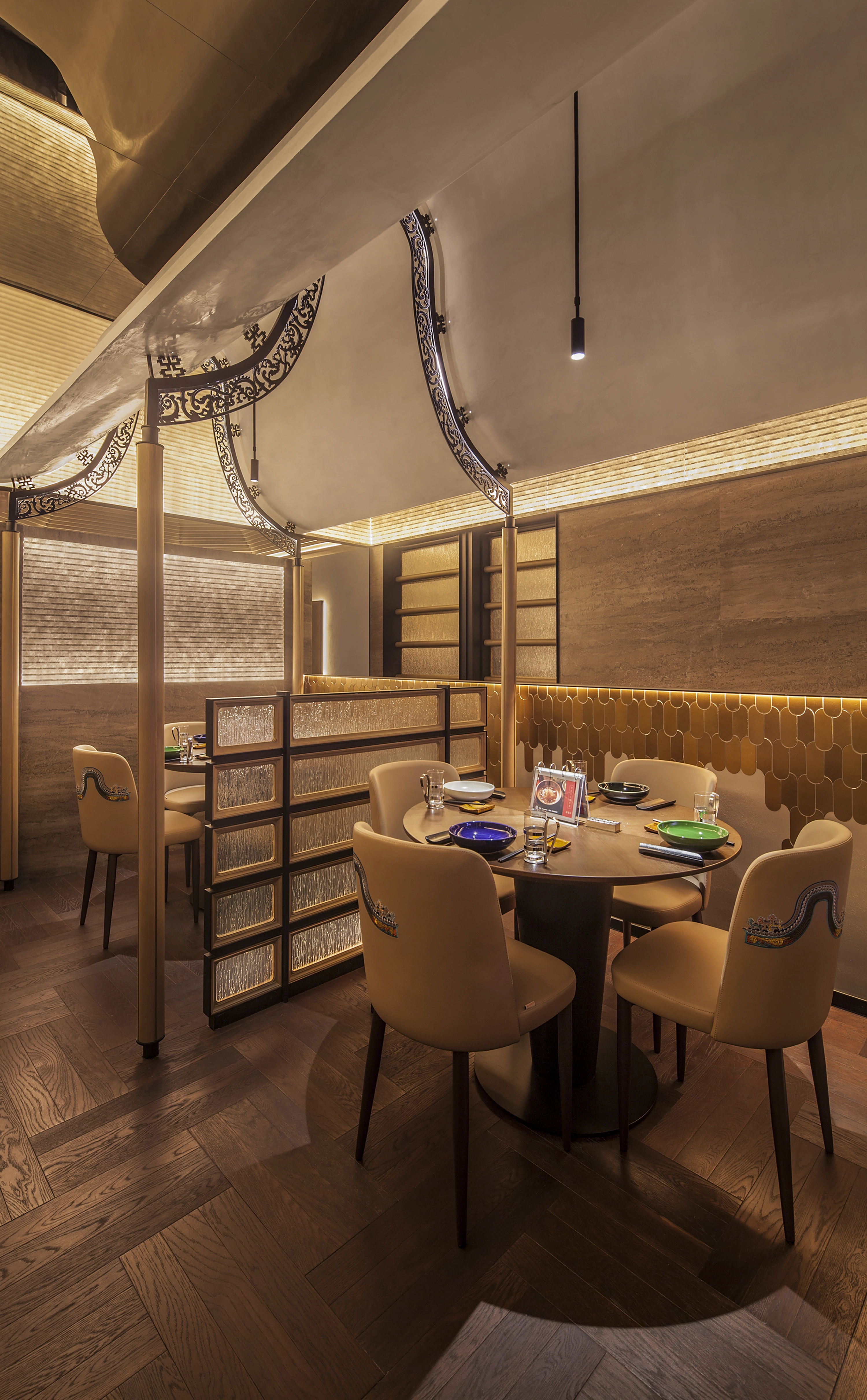 虚实的光线与文宝宣纸贯穿的上层空间在棚面幽若荡漾,建造出有序为整的用餐空间场域。