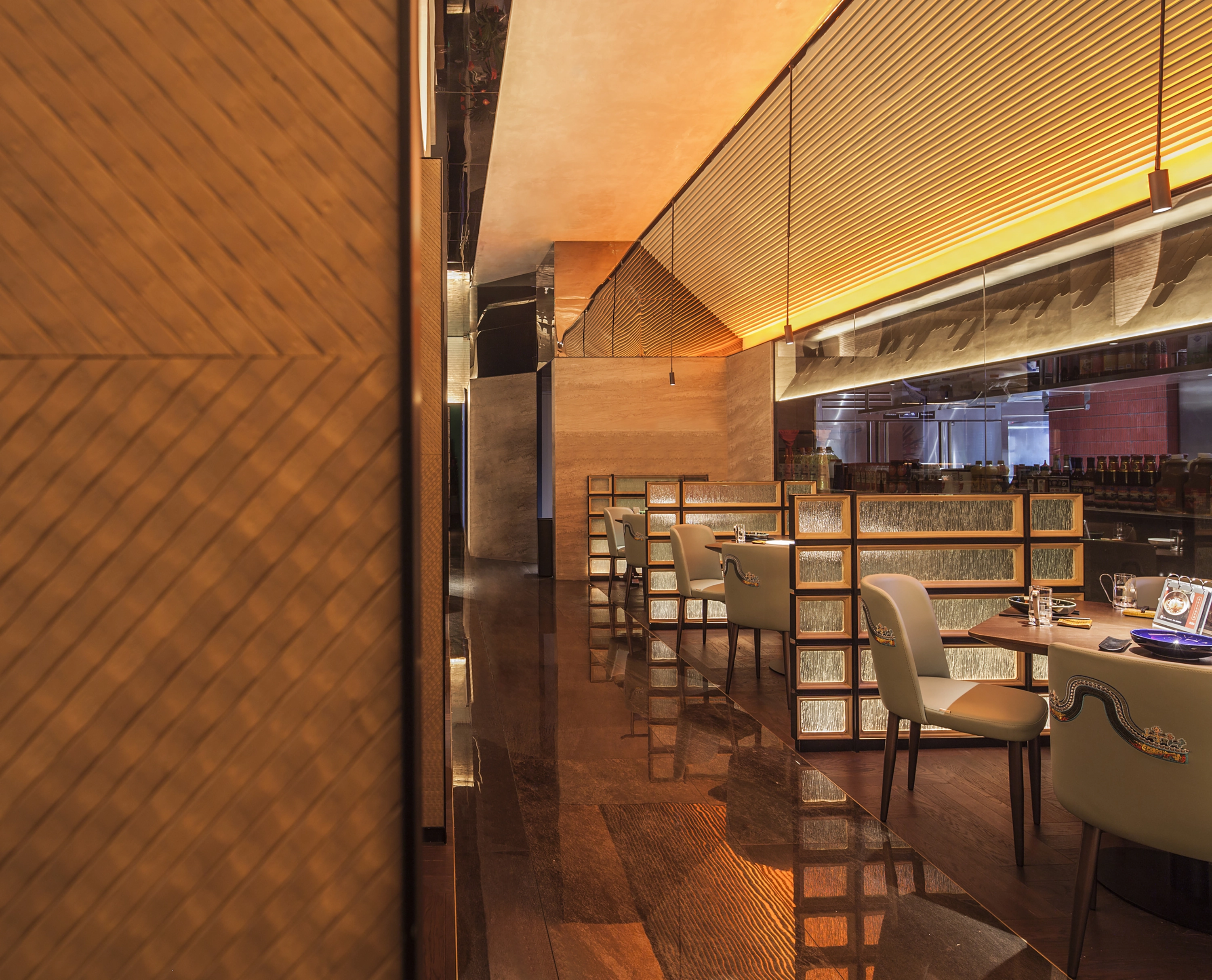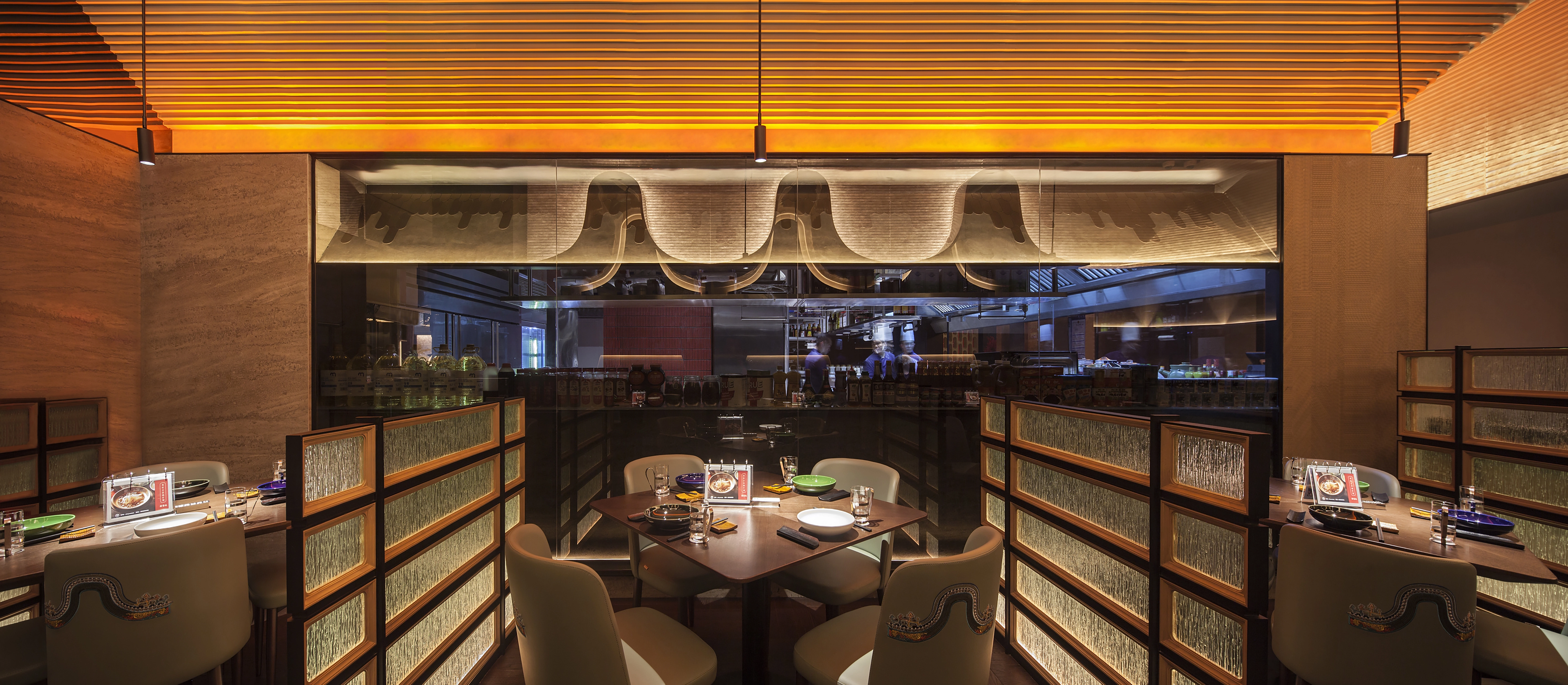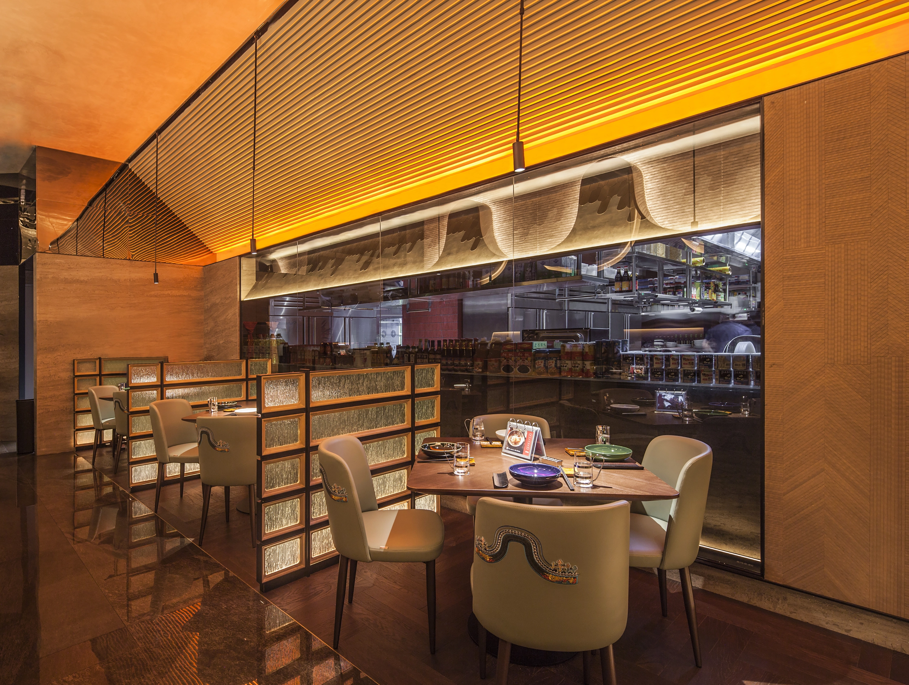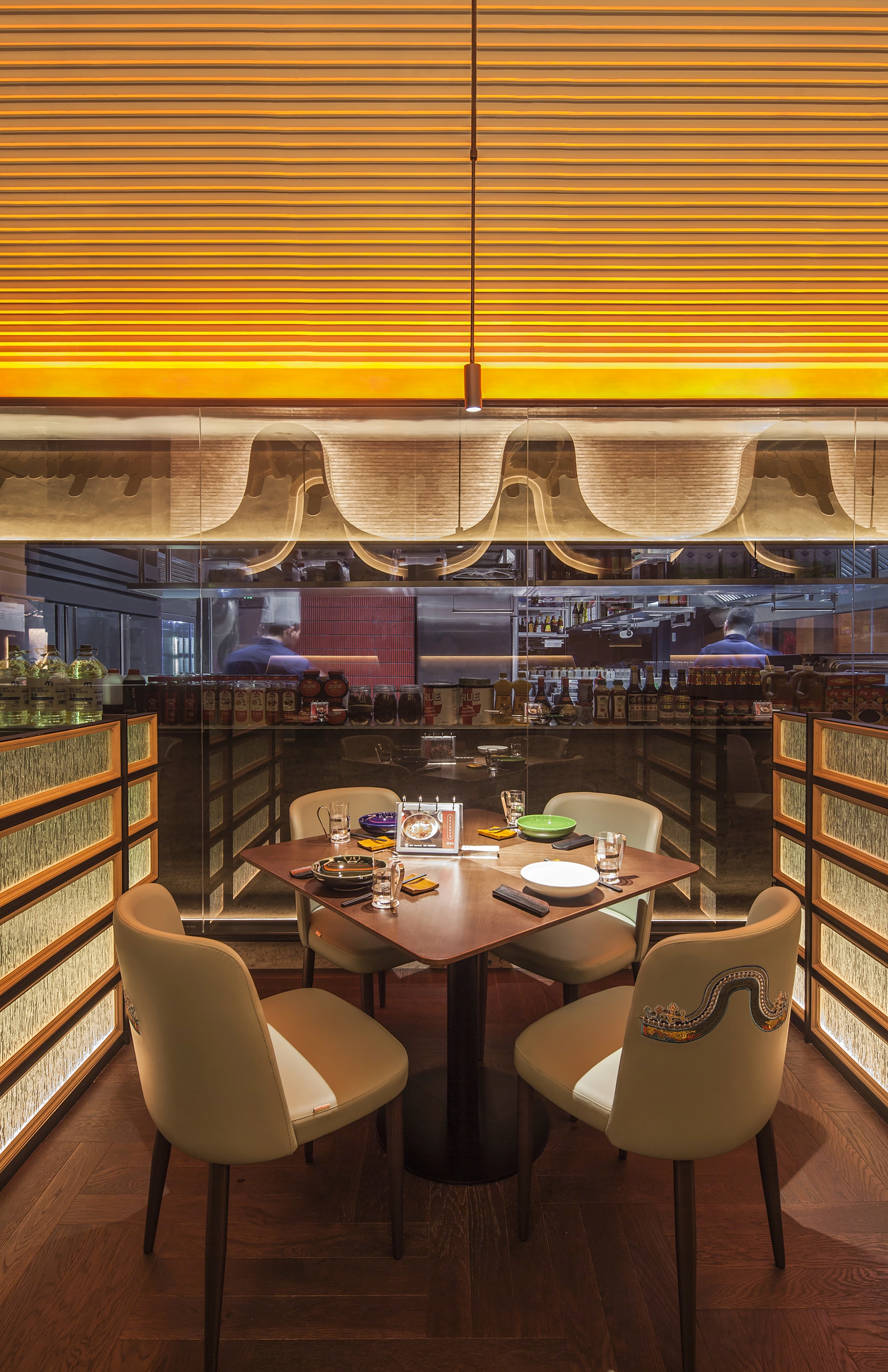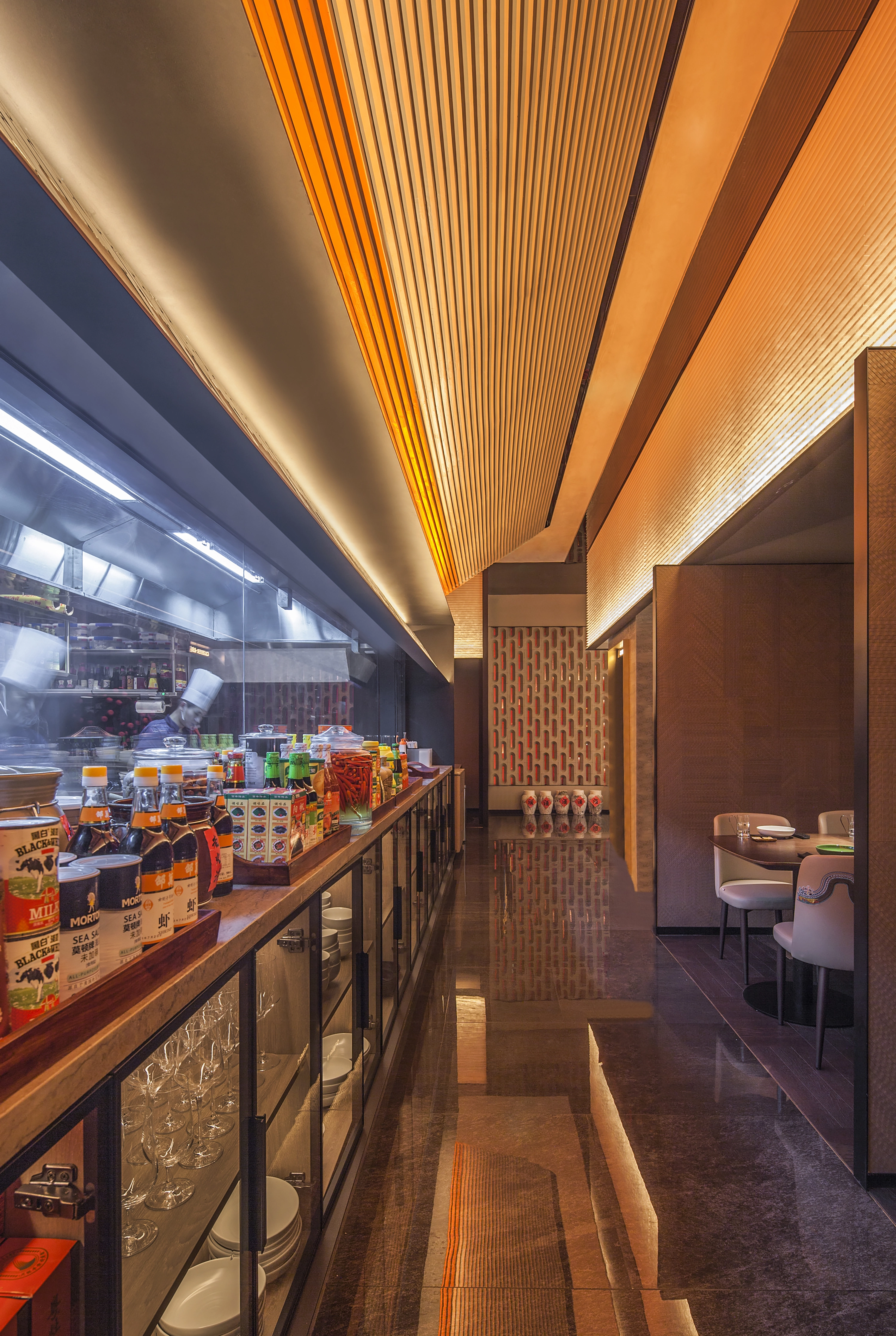 以核心“明厨”烹饪演绎制作,观赏互动成为空间核心主体,大有“广摄四旁,居中自定”的气度与自信。