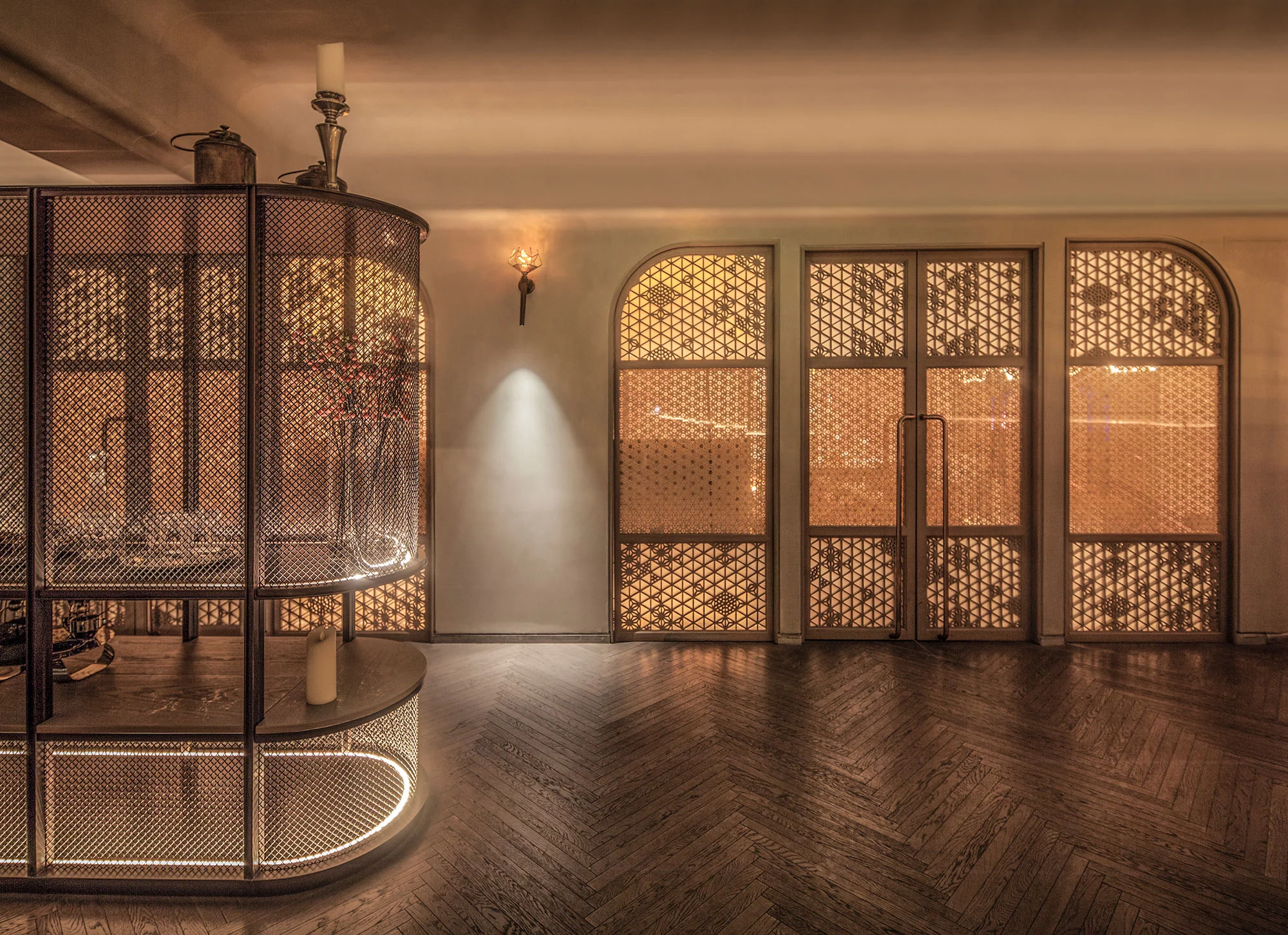 柔美的弧形线条作用于空间,水吧垂直耸立,营造空间视觉中心,古铜色金属和毛石的厚重,与印花玻璃的剔透突破了工艺和创新的界限,空间内火炬灯柱照亮一室璀璨。
