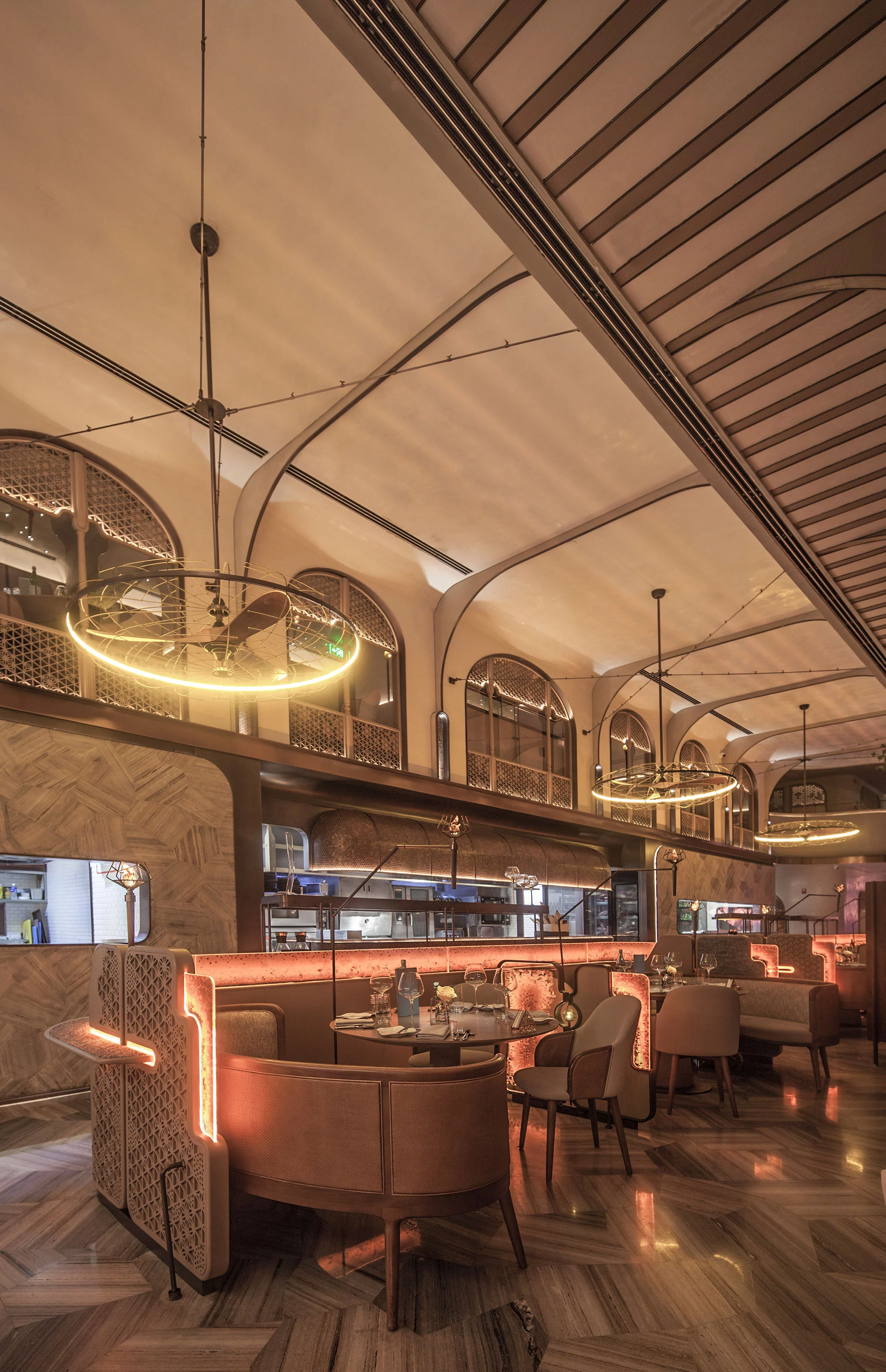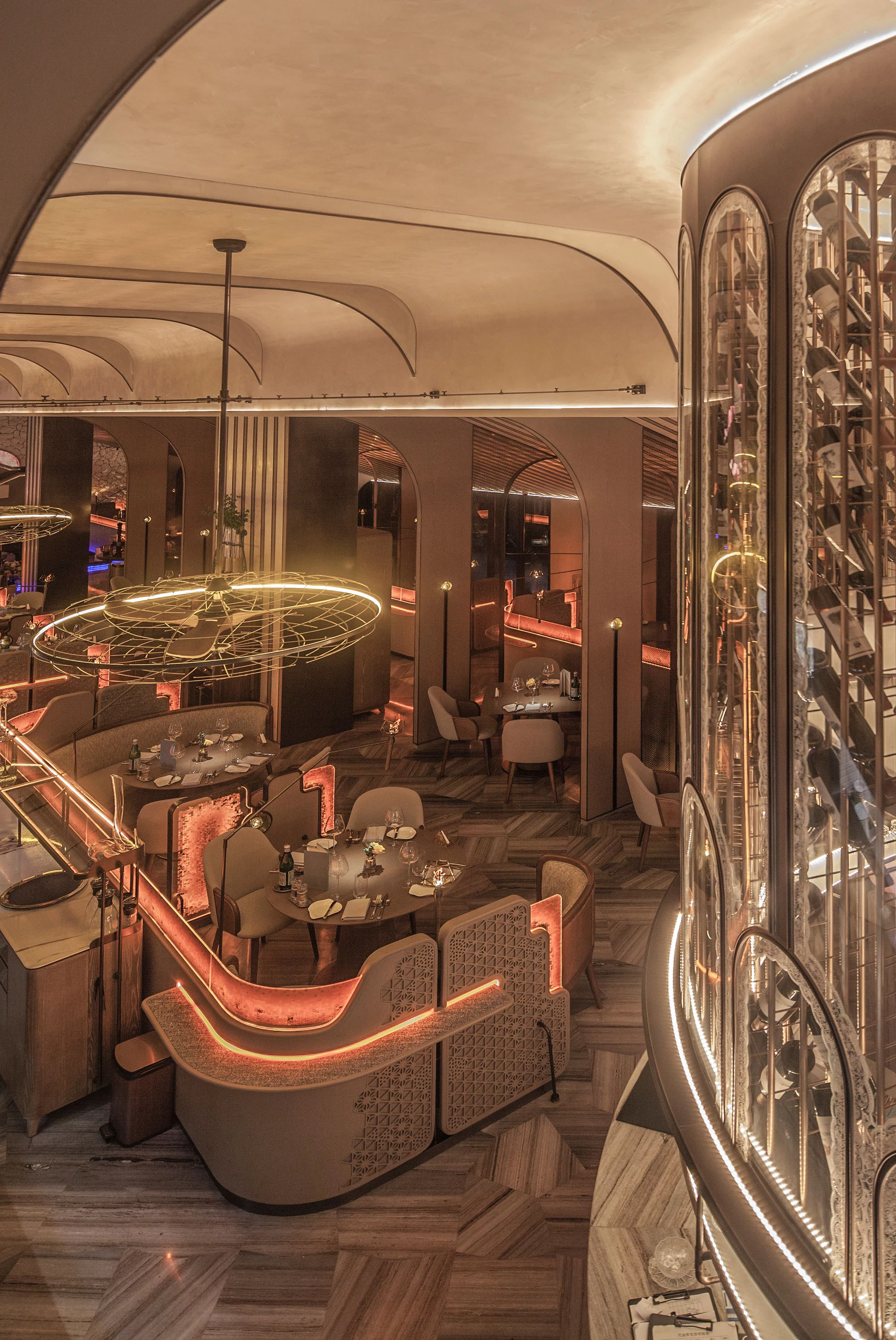 循着流动的曲线深入探索,不经意的抬眸即可感受优雅与热烈,体块的律动让空间视觉更显统一。