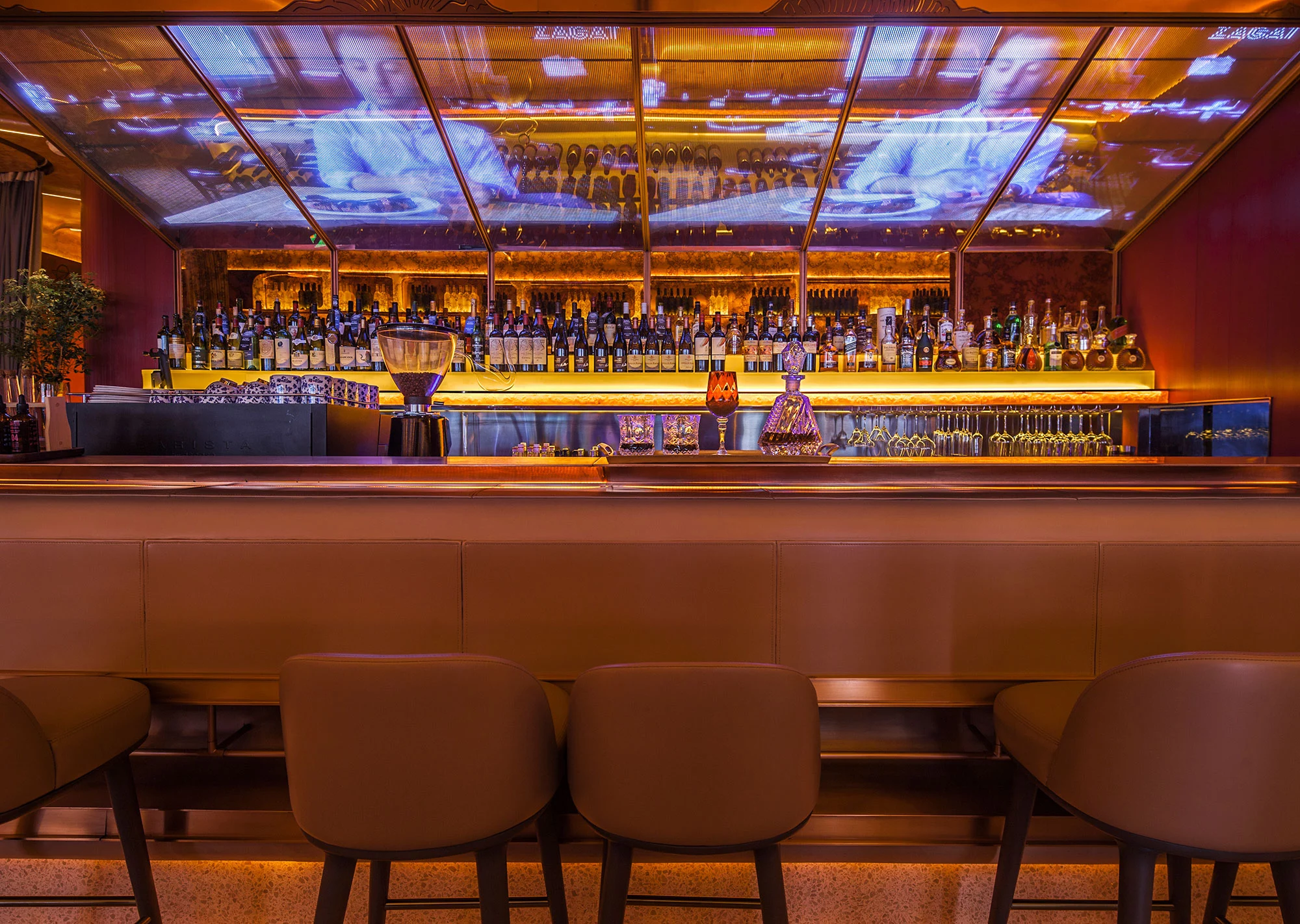 室内的整体空间,同样是多样的色彩搭配,重塑现代感的石膏线弧形棚顶,红色的墙布,点缀着淡绿色新艺术运动纹样,现代复古的家具在设计选型与组合上突出体现空间的韵味,将一种沉浸式的感受放到了望京的街头。