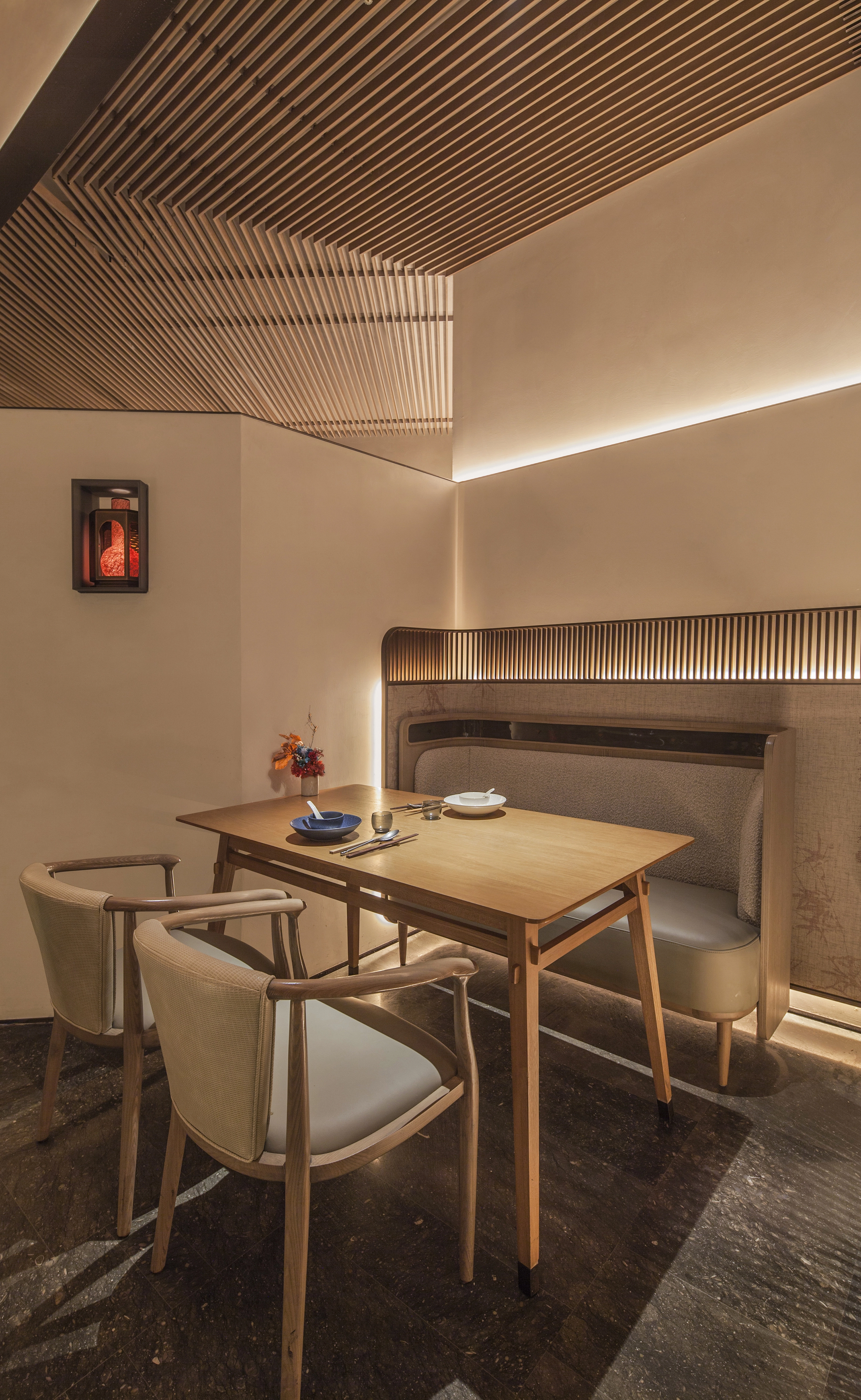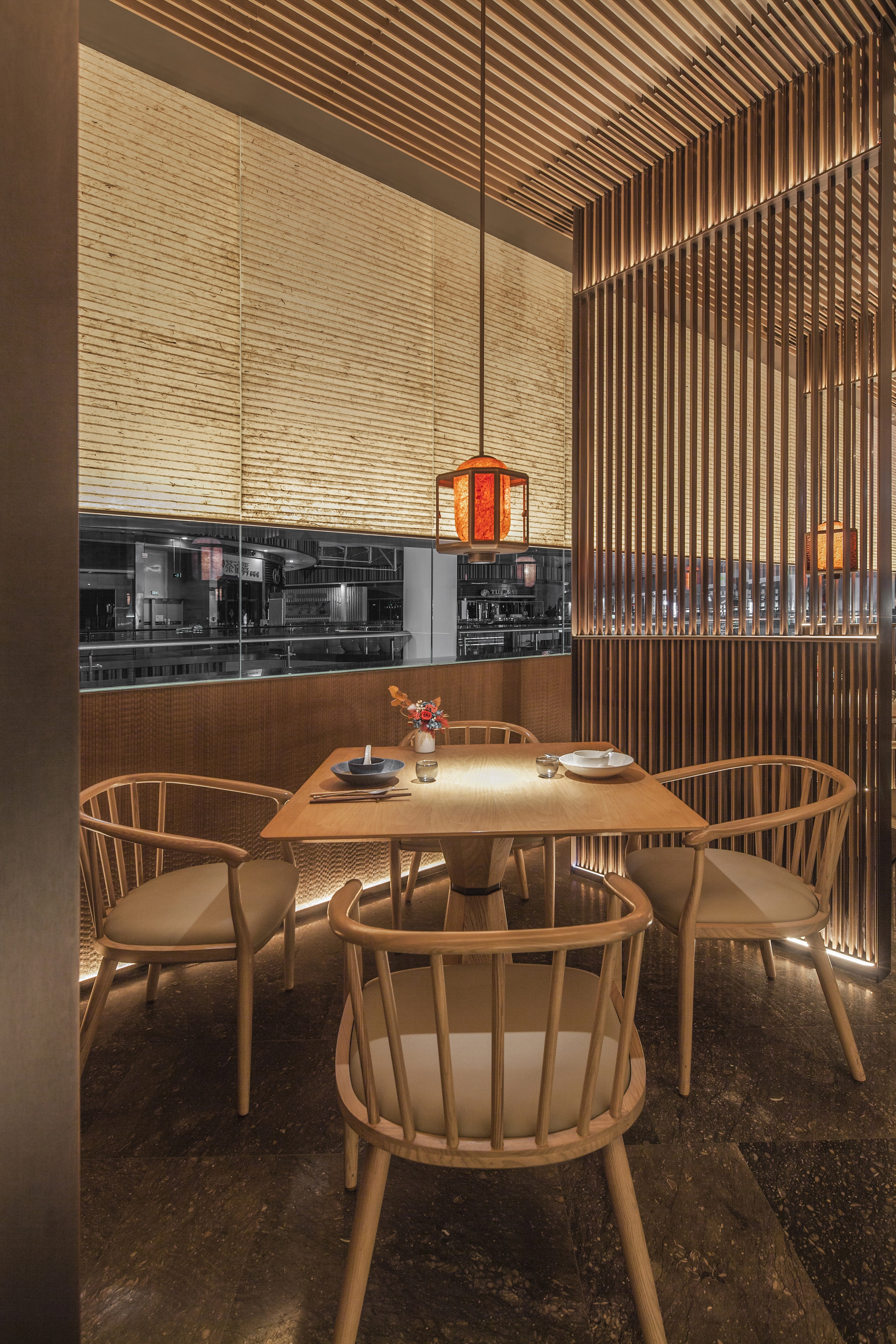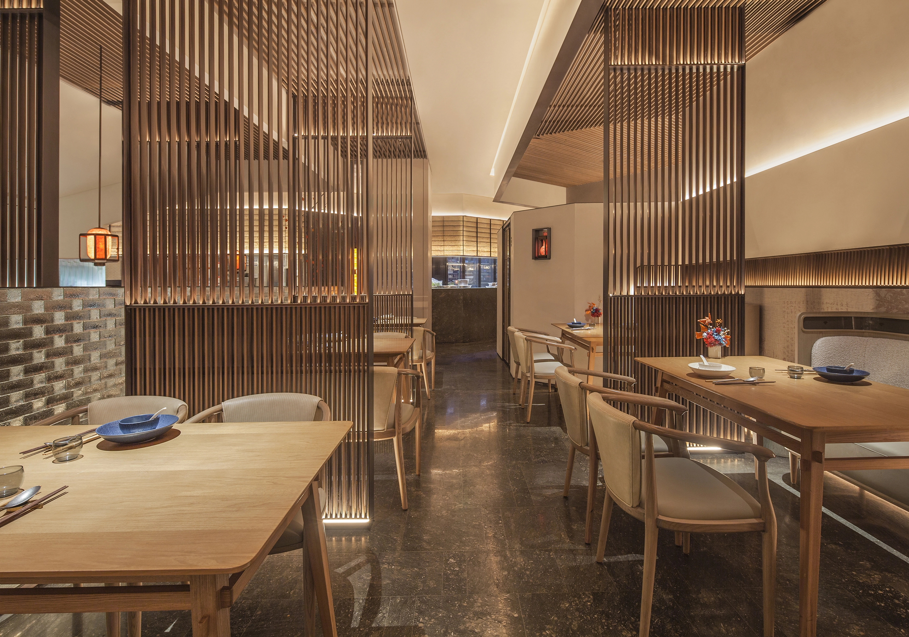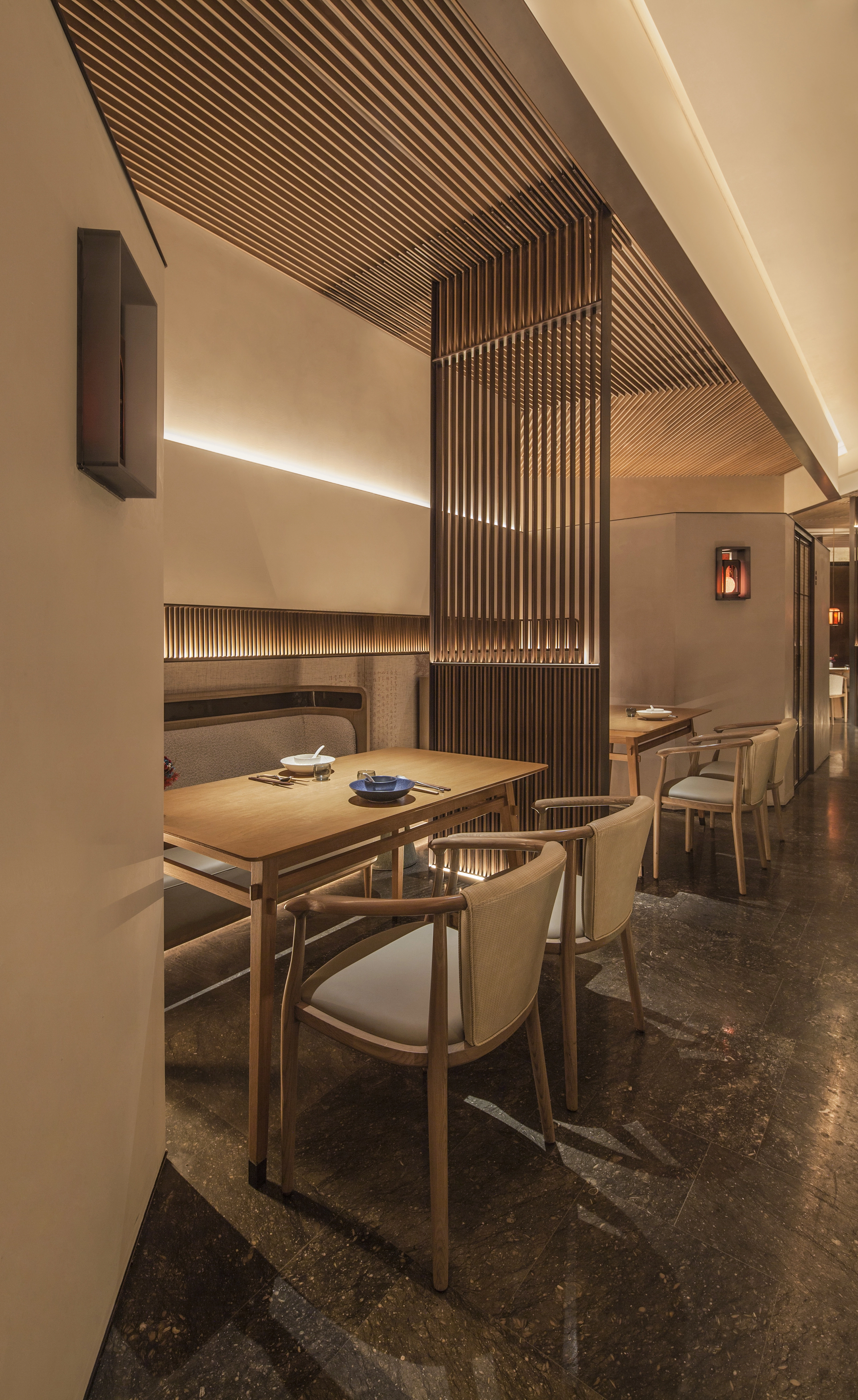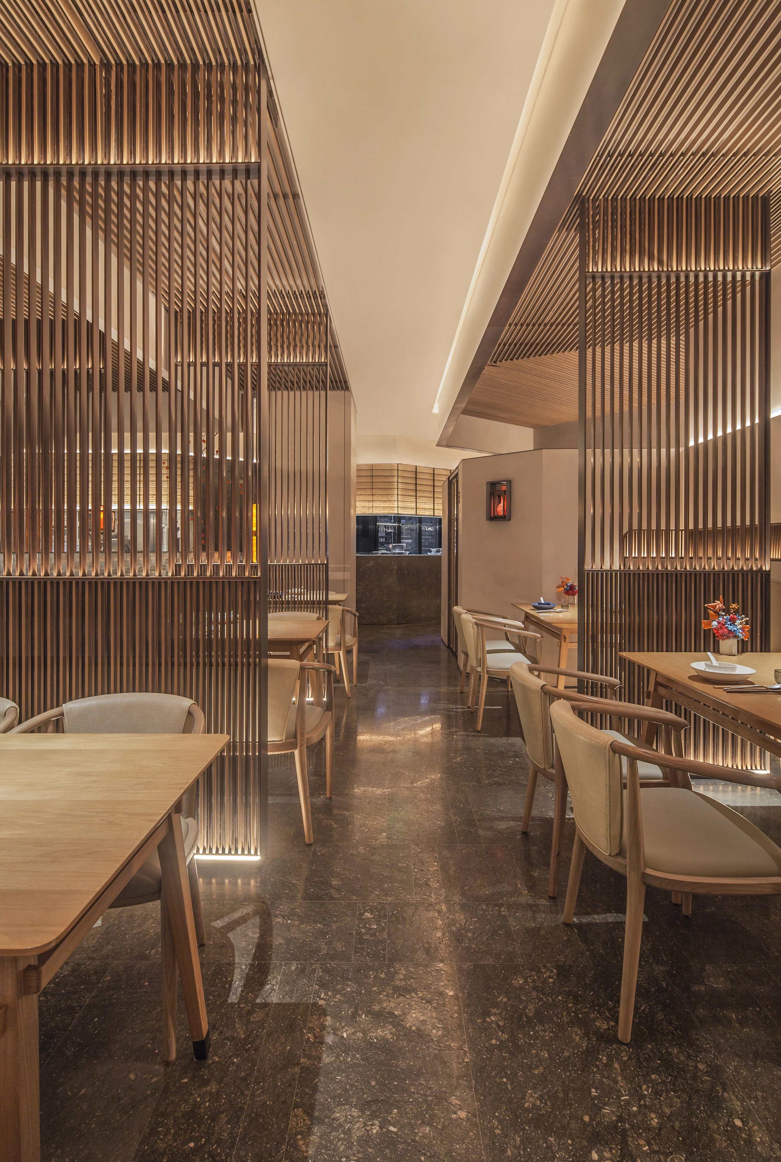 整个空间具有当代的结构形式和文人的内敛气质,使用木质与金属、涂料的材料相组合。整个建筑空间设计中对序列、流淌、高低尺度的再创造,以求达到隐、遮、露、透的环境形式。