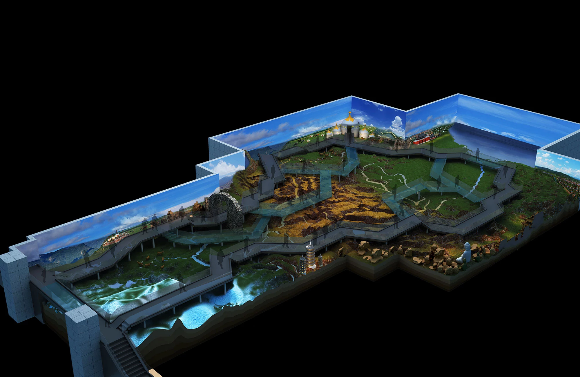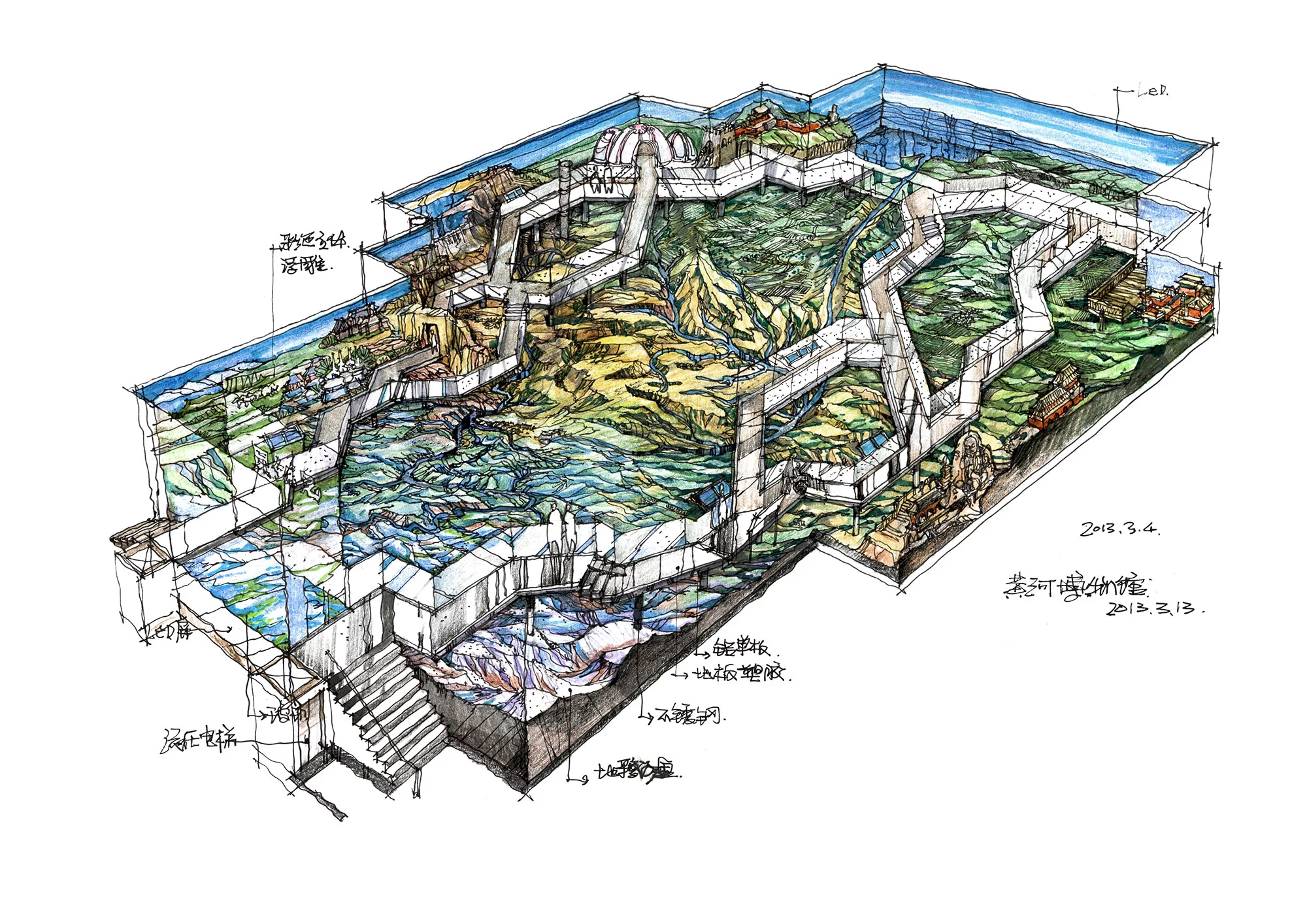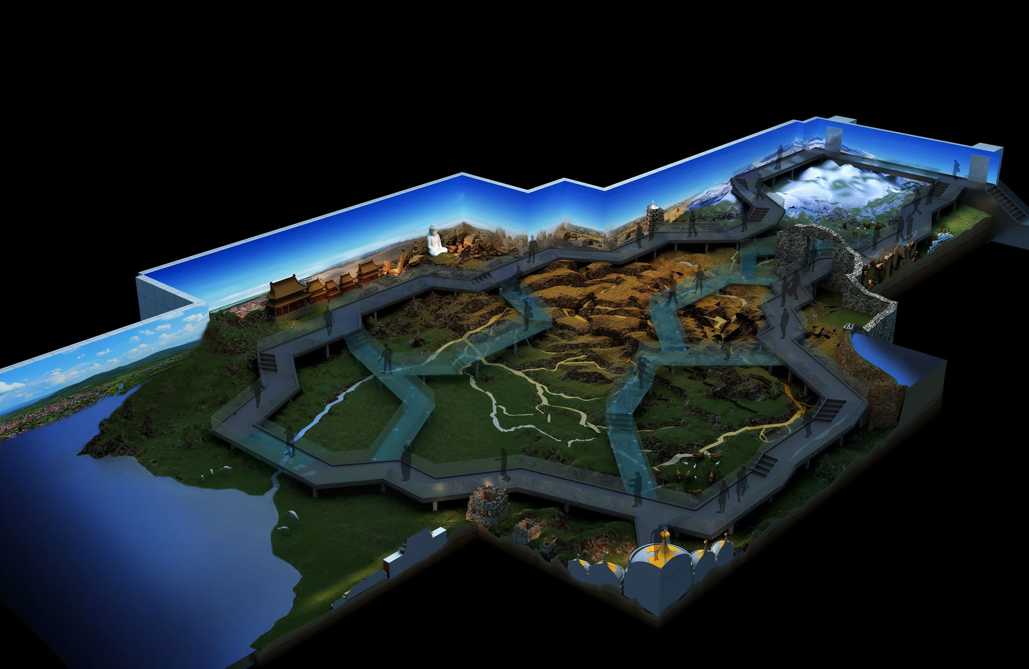 本案的设计主体是以黄河文化——世界上最古老的人类文明为主题的公益性博物馆。设计者喻浓情于其中,努力探求和思考将宏大而深远的黄河主题更完美地呈现。该方案运用赋予思想性艺术性的设计手法,将融合众多展品的八大主题展馆融入有限的展陈空间中,同时也要满足观展交通流线、商业休闲等公共空间的功能布局。使观展者通过浏览展示内容和体验展陈空间后,对黄河有更深层次的认识和感知,从而引发思考,体味黄河之魂与艺术相结合所散发的强大感召力,激发人们内心深处浓浓的黄河情。