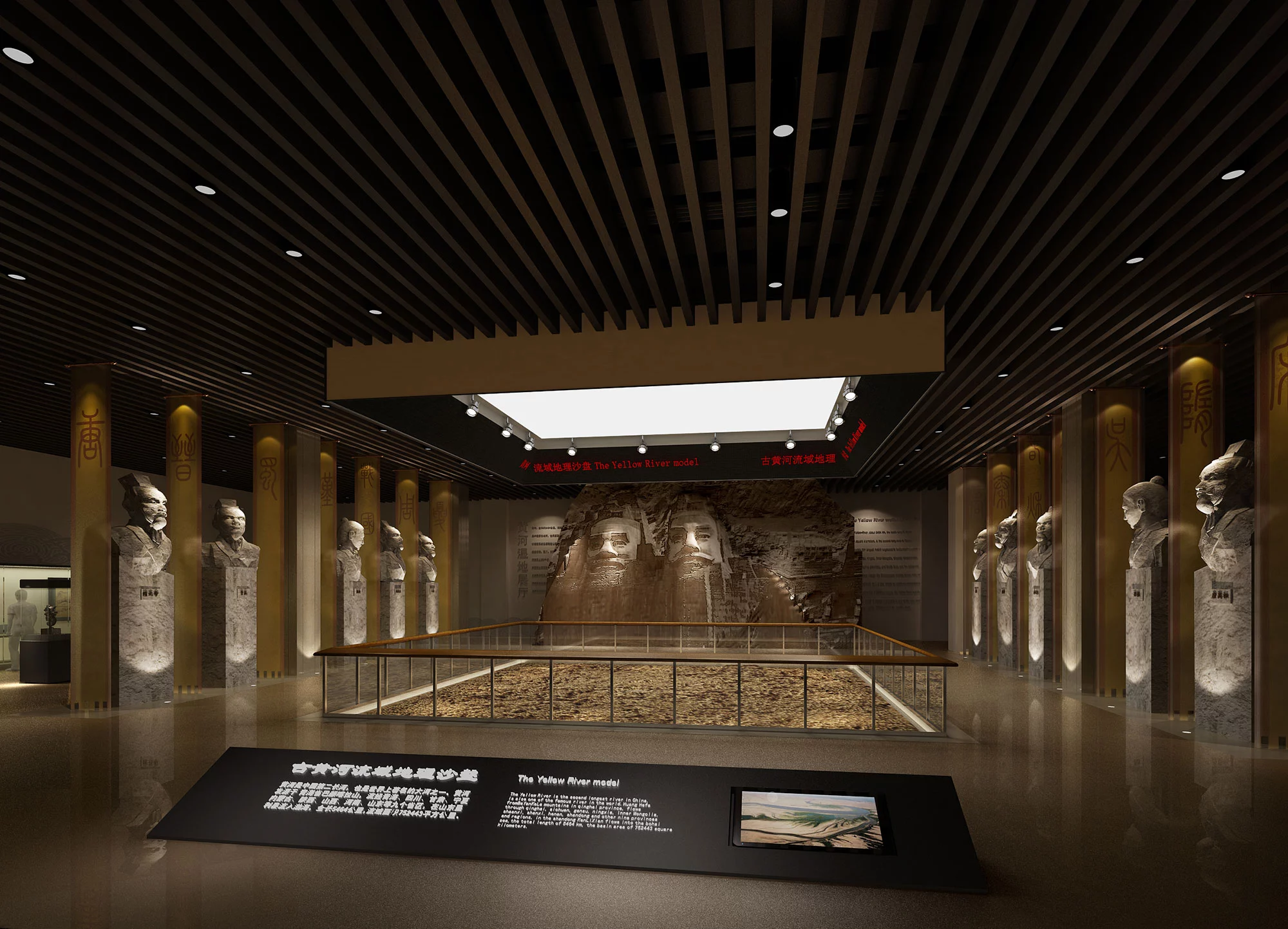 展陈空间营造手法融入“无为而无所不为”的哲学思想,在空间中传递着以黄河为主轴的中原文化精神,体现出当代的价值观及中华民族的博大情怀。用现代的设计语言和文化观,诠释来自遥远黄河流域历经千百年前所未有、连绵不绝、不屈不挠、拼搏奋进的中华精神。