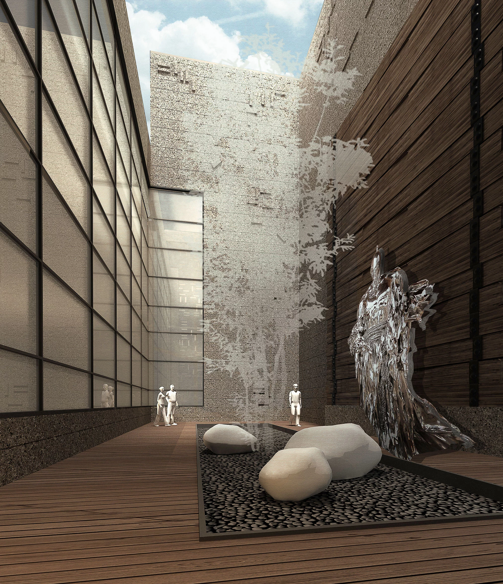 呼吸是生命的象征与不可或缺的条件.这里所指”呼吸”有两层含义:一是指建筑的可透光性和空气的可流通,这也是正常建筑必备的基本条件;另一层意思是指文化的传承。怎样使建筑再生并一直延续其生命力?本方案的外墙材料选用废旧拆迁楼房的砖瓦,有些其实比较完好,且带有岁月和历史的痕迹,将这些旧物收集利用,节能环保,在视觉上产生通透的肌理效果,仿佛具有极强的可呼吸能力,并且这是建筑历史文化传承的一种表现和愿望,传承与创新,建筑的生命力才会更加旺盛与鲜活。