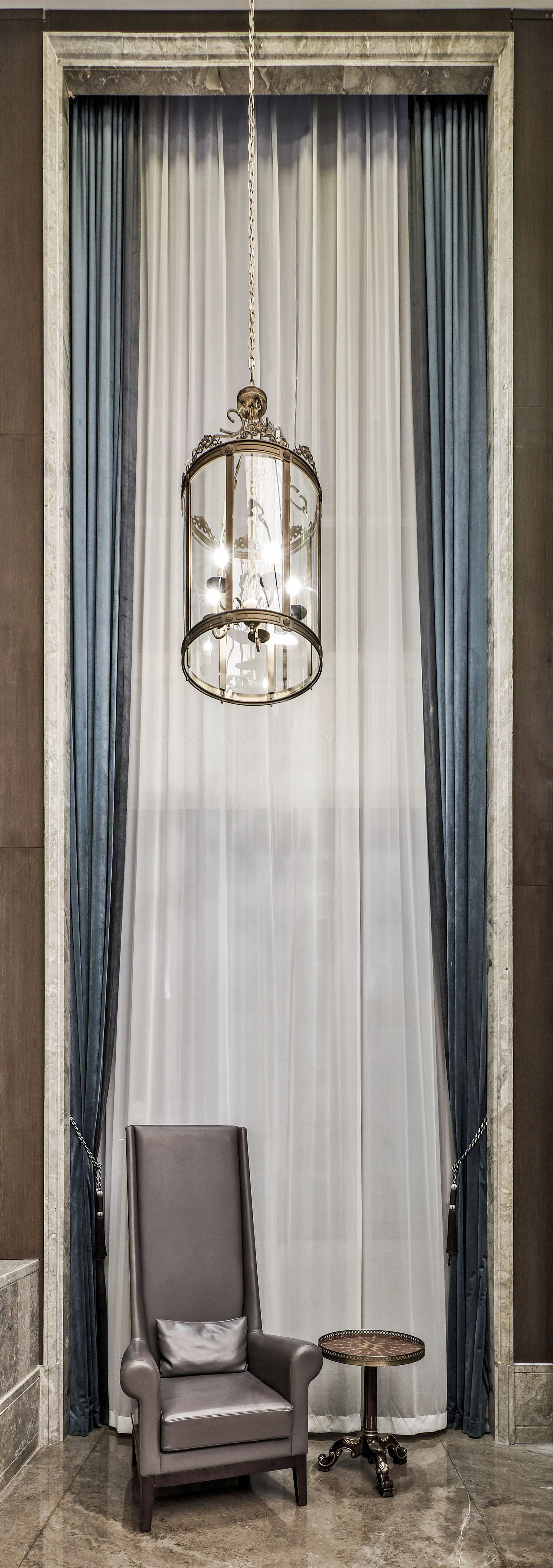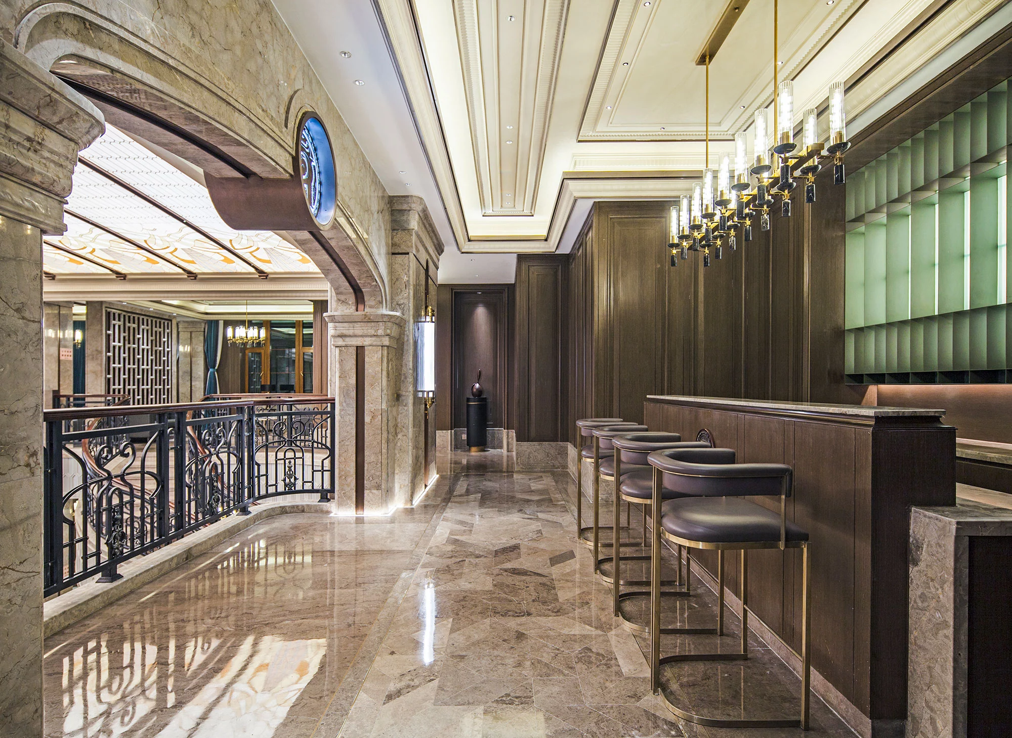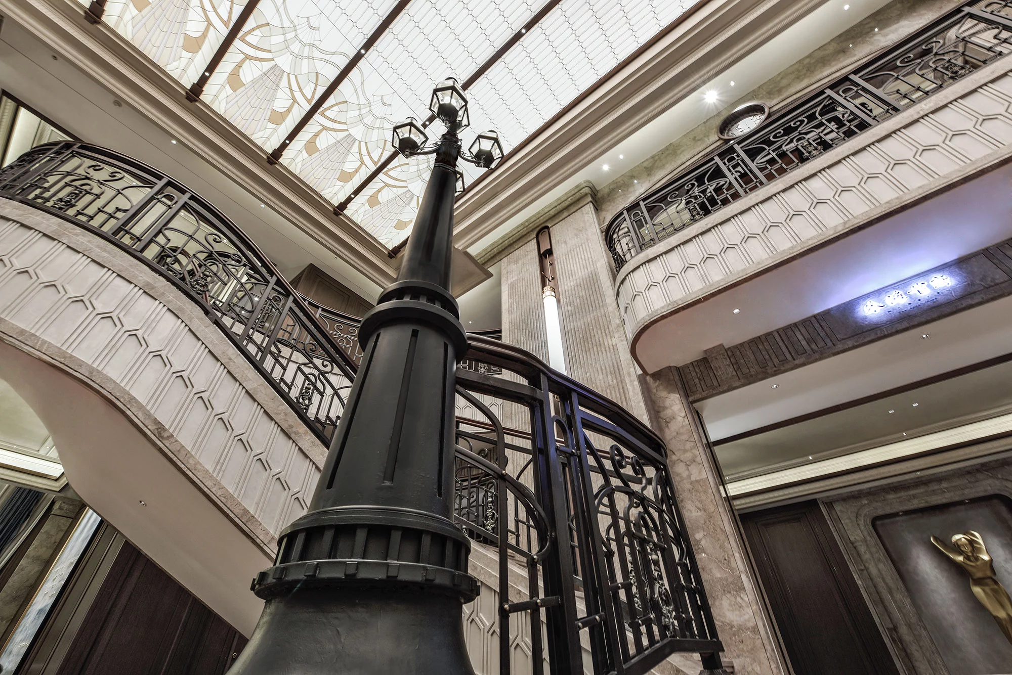 进入大堂,两侧的对称式楼梯,于无形之中增加仪式感,对空间进行更准确的表达,演绎空间独有的尊贵情感。弧形的天花造型,通过模拟自然光线的效果,让空间充满活力,从视觉上带来多层次的开阔感,具有新艺术运动风格的精美图案,更是设计师对空间的情感表达。