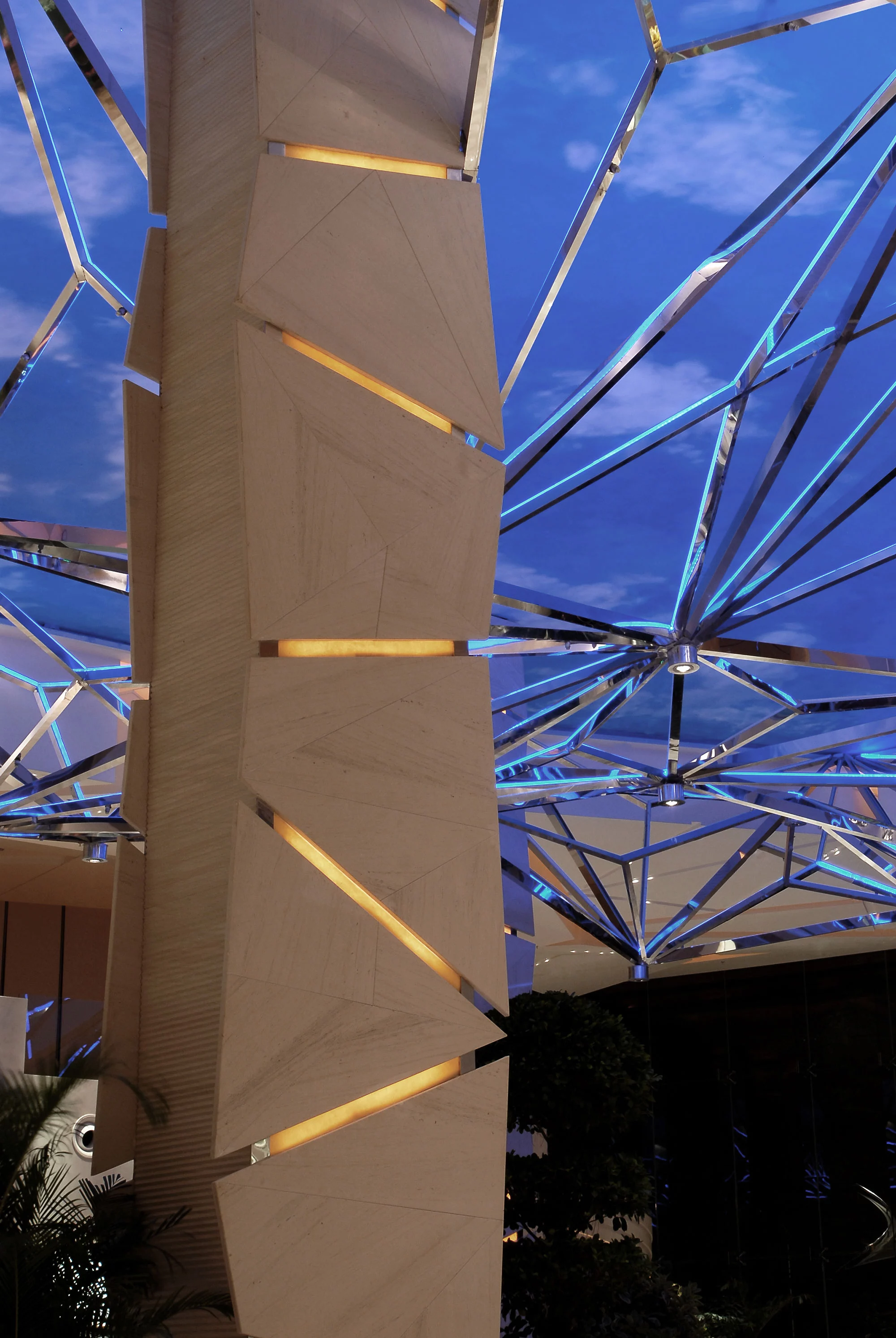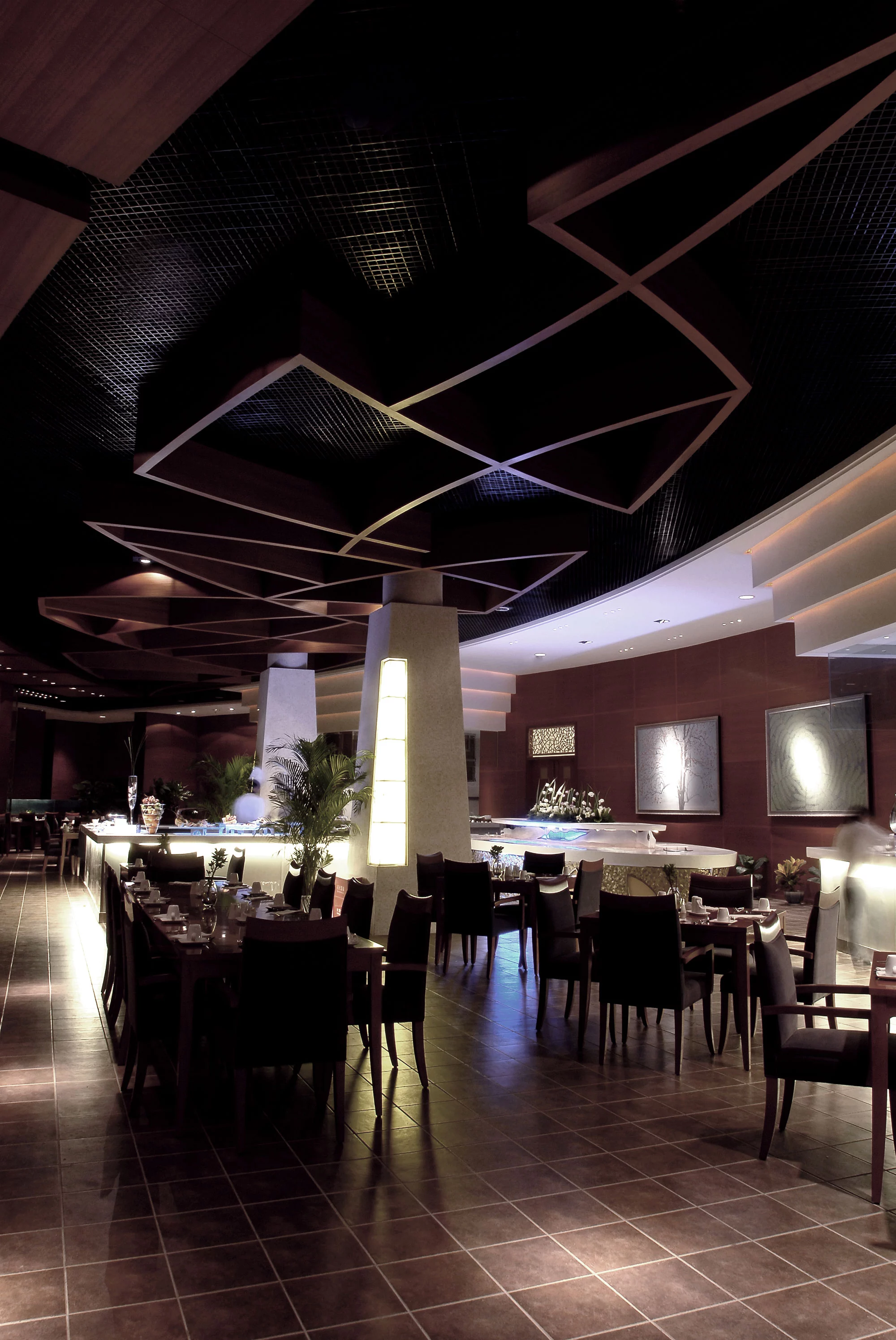 现代立体构成能充分的体现出空间的建筑美感,这正是我们想要的感觉。我们将那样已经深入人心的“自然”材料、颜色,用现代的手法表现,达到一种新的视觉感受。这些现代抽象形式的出现,也是我们从另外一些“自然”中提炼出来的,如大堂空间的造型是从玻璃落地后自然破裂形成的纹理中提炼的;餐厅空间天棚的造型是从大自然中一片落叶的叶脉纹理中提炼的。