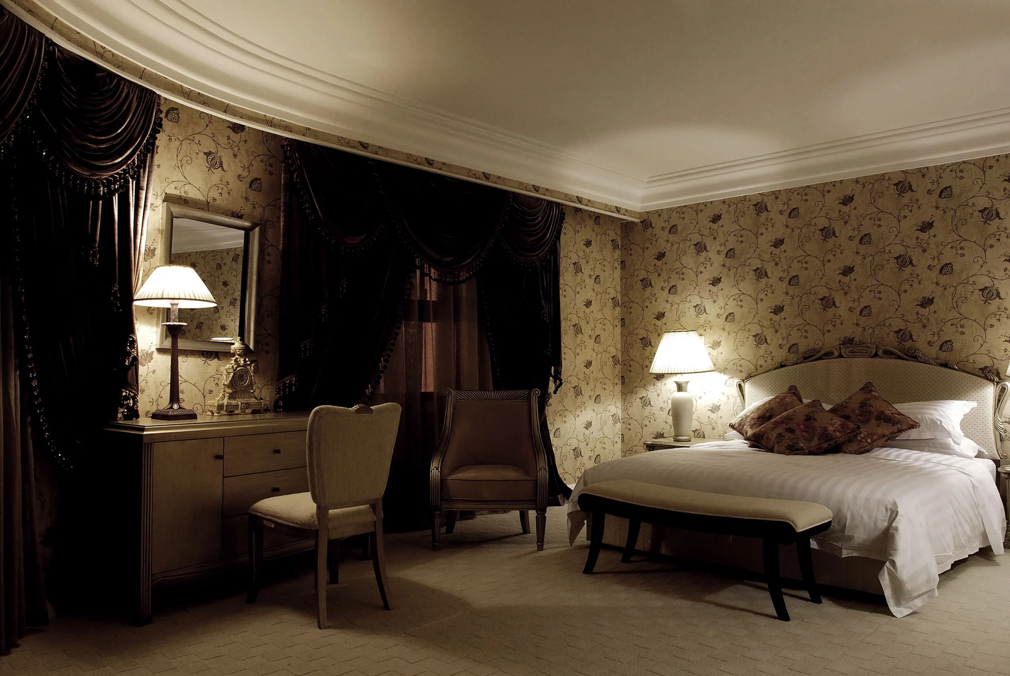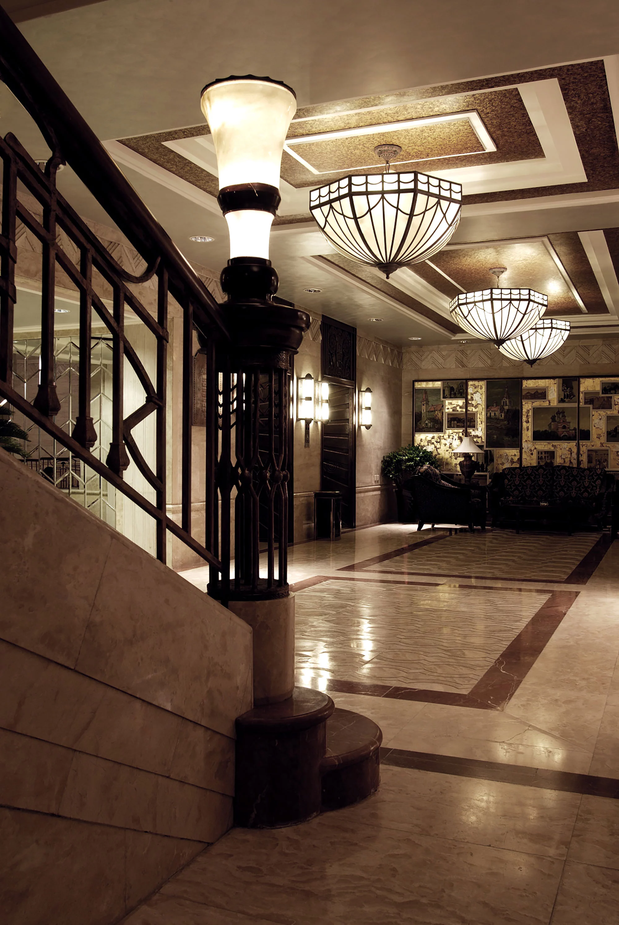 面对这样一座有着辉煌历史的建筑,我们以“复古怀旧、修复如初”为设计原则在古老中追求新意,从外建筑中提取新艺术运动的建筑符号,以老工艺为主要手段,创造现代新视觉。铜锈五金件、彩色玻璃镶嵌天花、复古傢私,每一处细部上都流淌着历史情节。