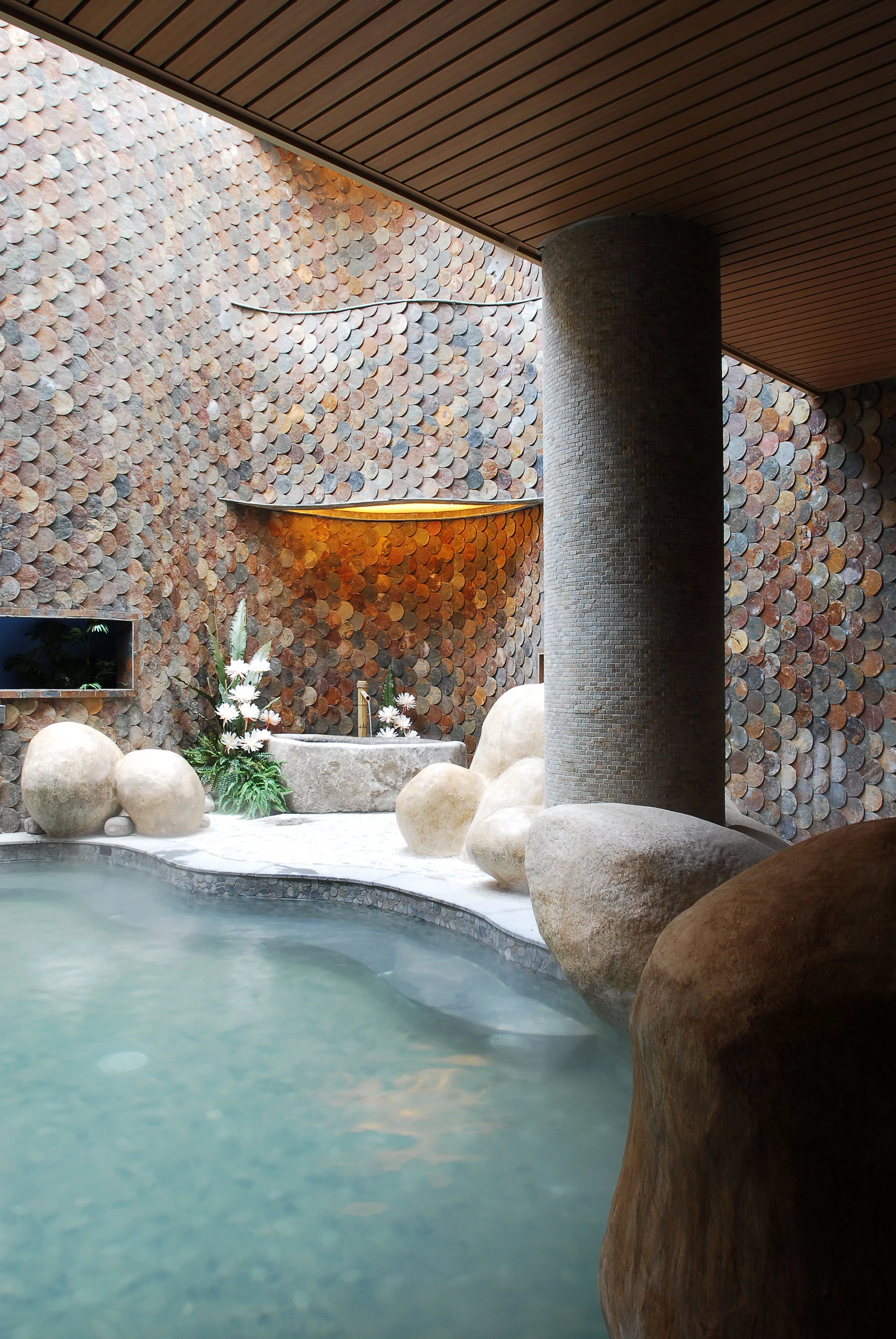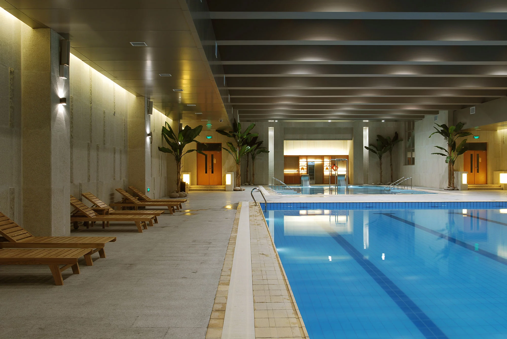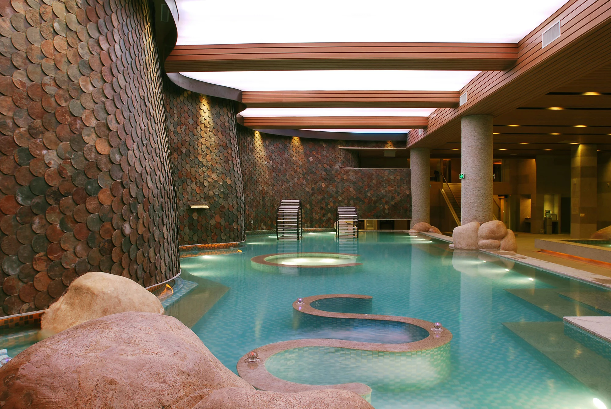 大型的游泳池和网球场的用地给平面布局带来了很多处理难点,经过多次推敲,最终的解决办法是把两个面积较大的空间叠在一起放置建筑中间,这样形成了一个回字形的平面布局,利用回形的交通路线串起各个服务空间。通过两端共享的空间,把自然光分享到地下游泳池两侧——这样使男女浴区的地下区域都有自然光线,而室外温泉则仰望着蓝天白云,相对合理的平面布局也解决了业主担心在将来经营中会面临人流量大的问题。