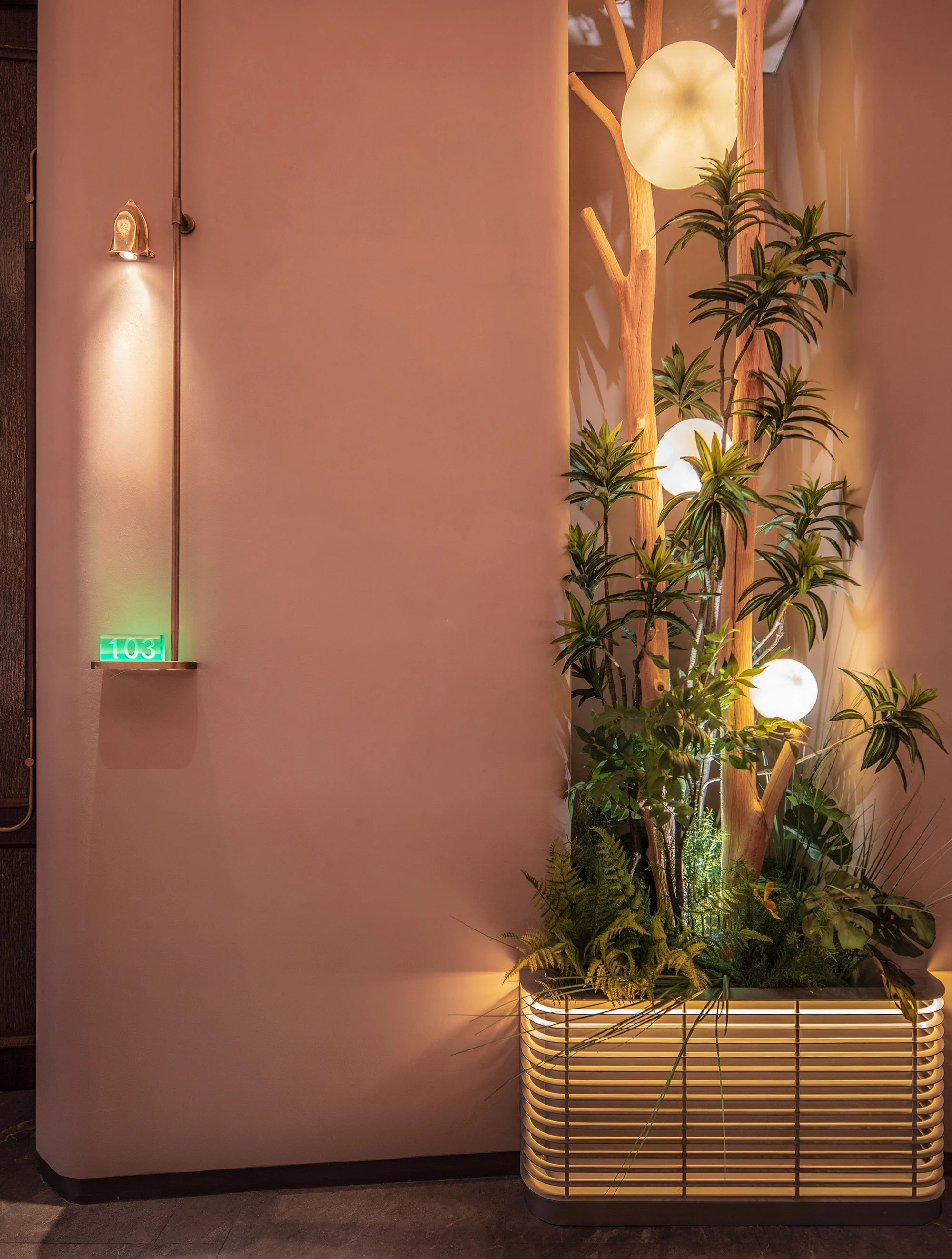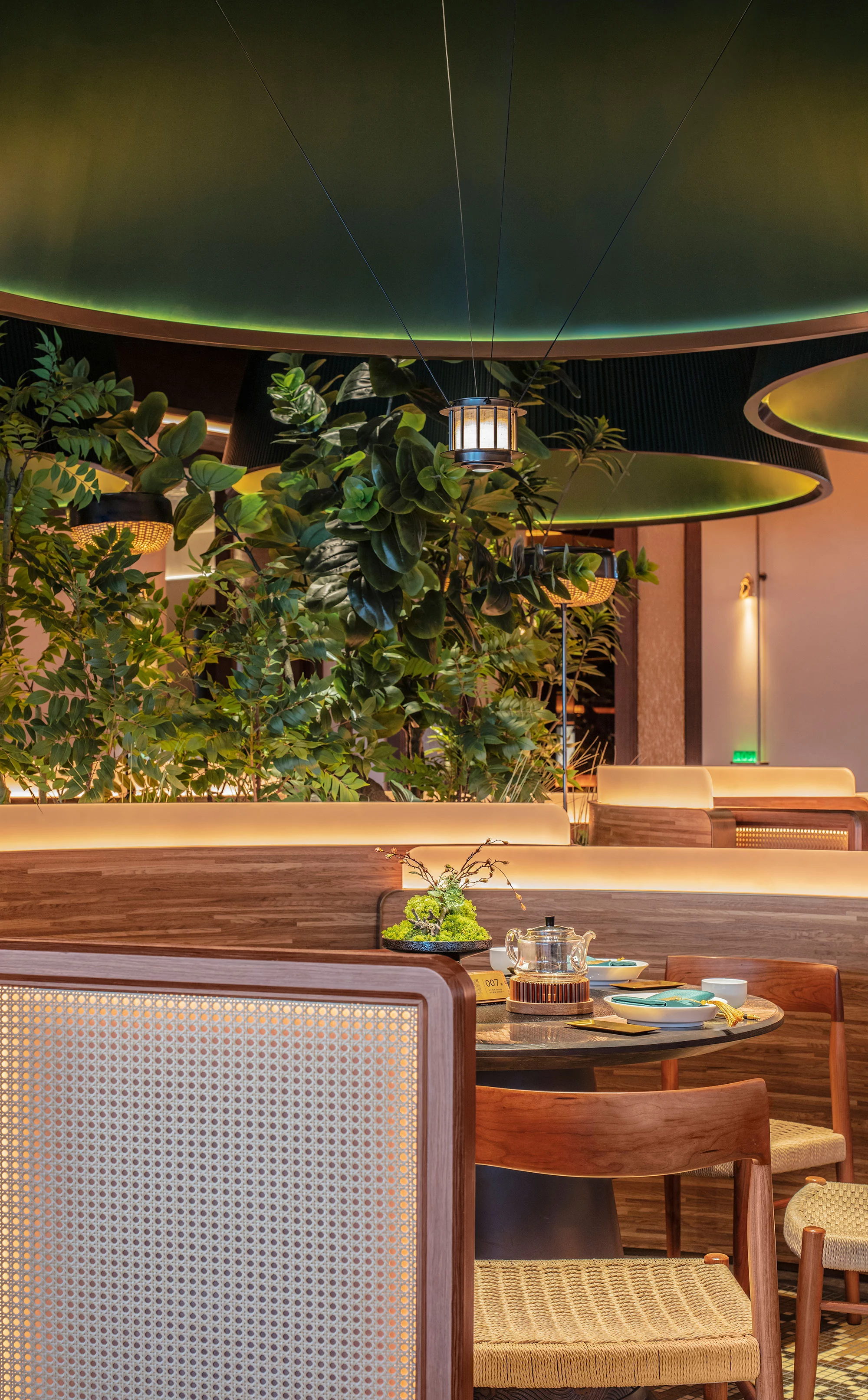 一进入餐厅,首先映入眼帘的是一片绿意盎然的花园,各种绿植和树木簇拥在一起,形成了一个美丽的景观。阳光透过树叶洒在地面上,形成斑驳的光影, 给人一种宁静的感觉。