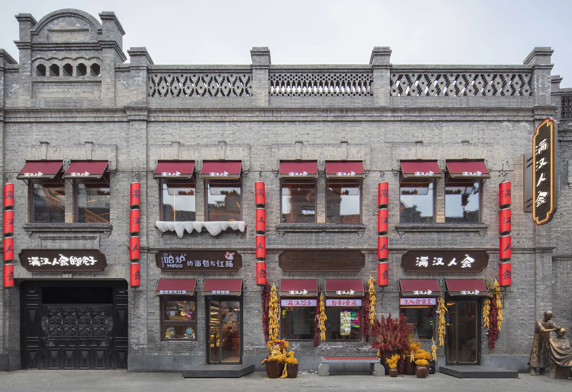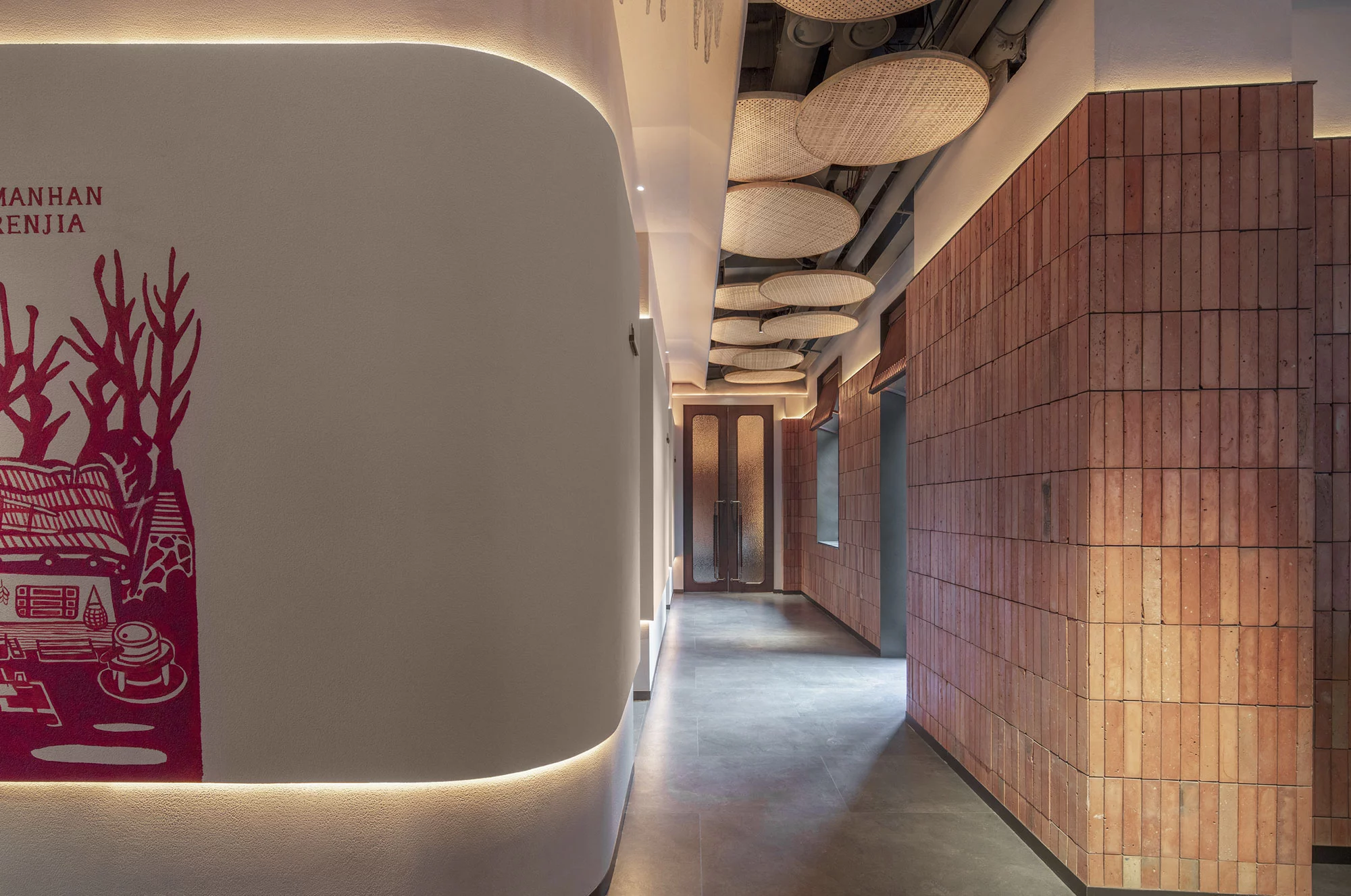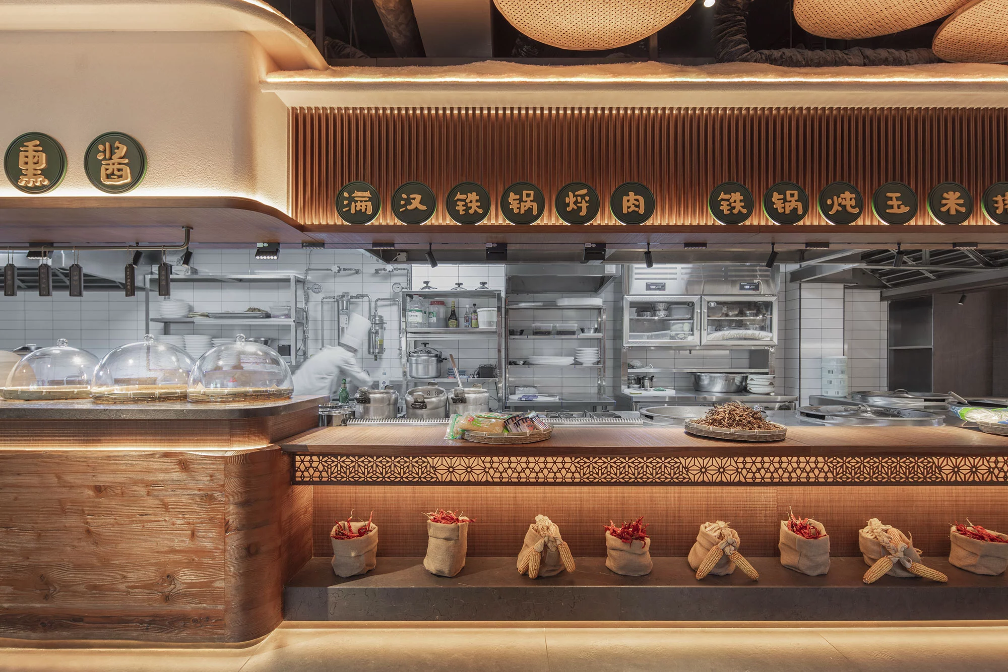 徜徉在老街,触摸时间的留痕,远离城市的喧嚣,便且暂归乡野,拥抱北方春的希望与冬的凛冽,走进新农村的烟火,品味一场舌尖上的盛宴,让味蕾与乡情,碰撞出人生至味。满汉人家注重打造独特且充满新农风尚的用餐空间,门面以青砖为背景,采用灯笼元素,承袭了老街的故事感,玉米、红辣椒、高粱等乡村符号充斥整个装饰空间,体现了北方农村的豁达与热情,与农家味道、回归自然的品牌属性相得益彰。