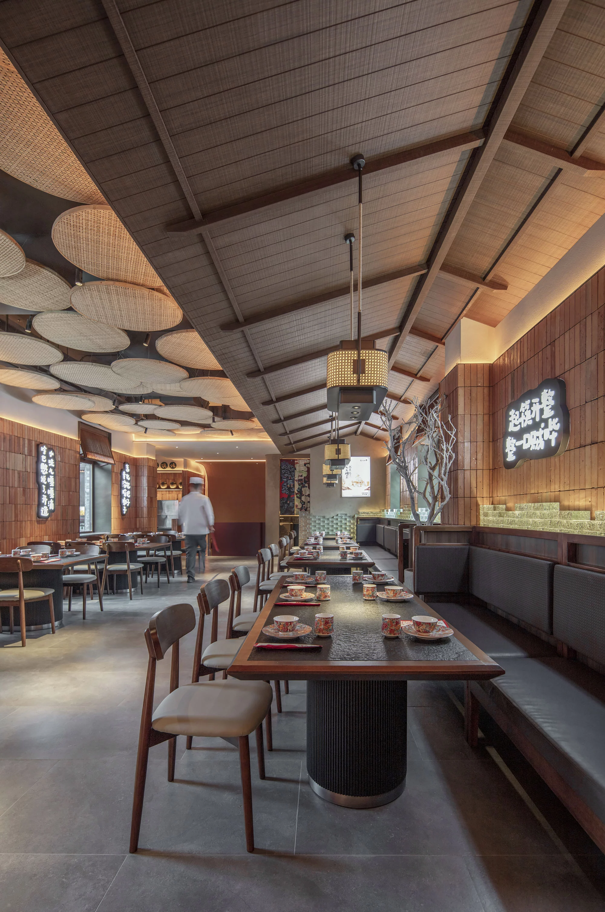 千里冰封、万里雪飘是独属于北方的浪漫,枕月眠风、袅袅炊烟则是社会主义新农村绘就关于“诗和远方”的生态画廊。空间整体采用大面积红砖的铺陈搭配冰砖的点缀,在展现北方新农村风貌的同时,呈现出冰雪元素。木质及麻质的温润特质又中和了红砖与冰砖带来的凌厉感,营造出了质感且温暖的餐饮环境。