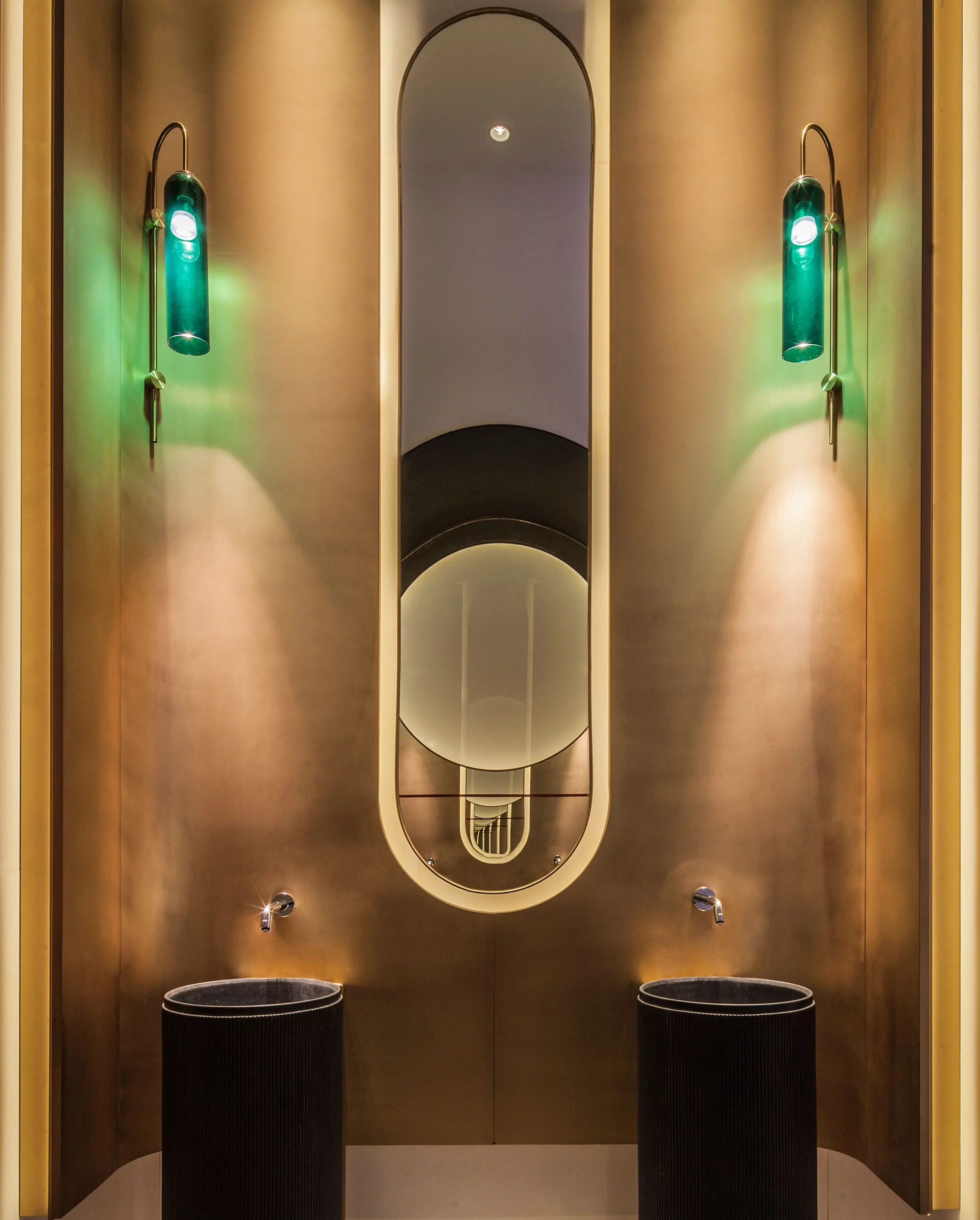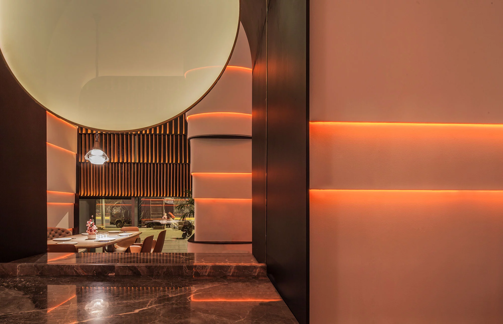 空间借材质与光影产生轴线,让空间韵律改变,光线在反射的墙壁之间穿梭。石材地面与墙体相互协调,空间的建筑感和可被感知的基础得到进一步加强。材质与弧线的一致,让人们的思想与场景进而达成一致与融合。