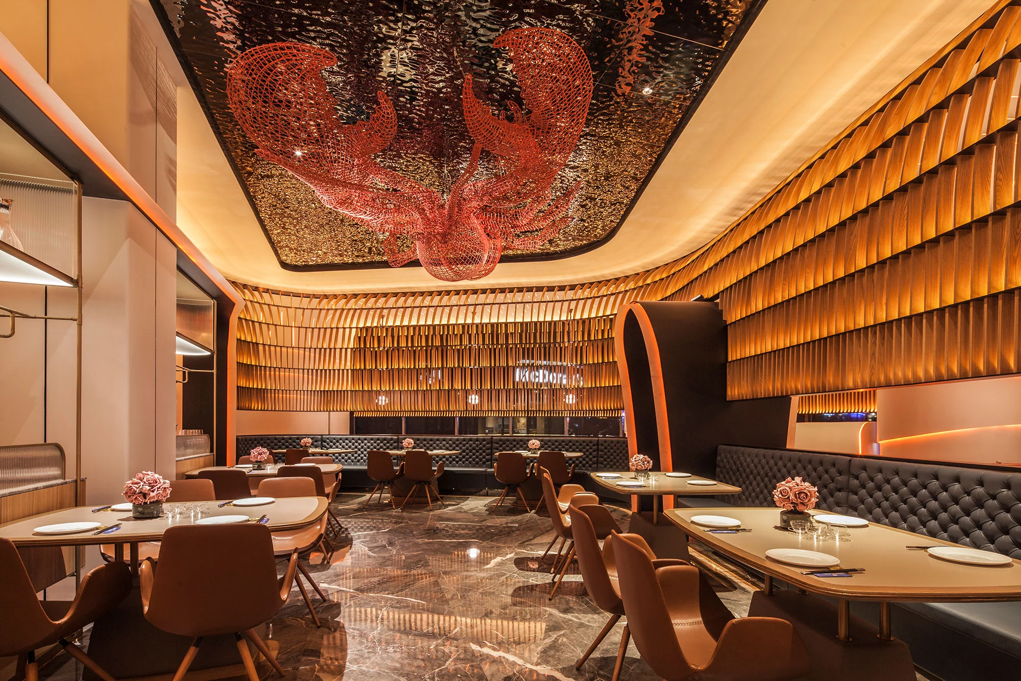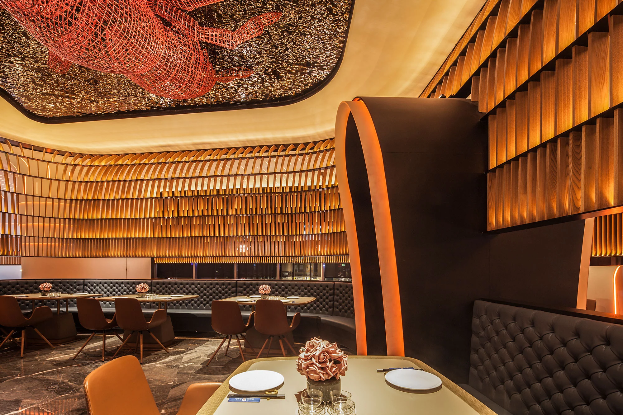 红色能恰到好处的出现在该出现的位置,整个空间便活了,而在每一个空间都能表达想要传达的信息,或热烈,或妩媚,或浓烈。尤其是在天花顶部的表现,起到了点睛之笔作用,不仅可以作为视觉焦点,还可以传达光与食物的重叠,空间缭绕的众味喧哗;调动食客身上的每个细胞,回归食物和色彩的本质,吃个爽快,既能让食客专注享用美食,又能在食客抬眼的瞬间感受艺术的魅力。