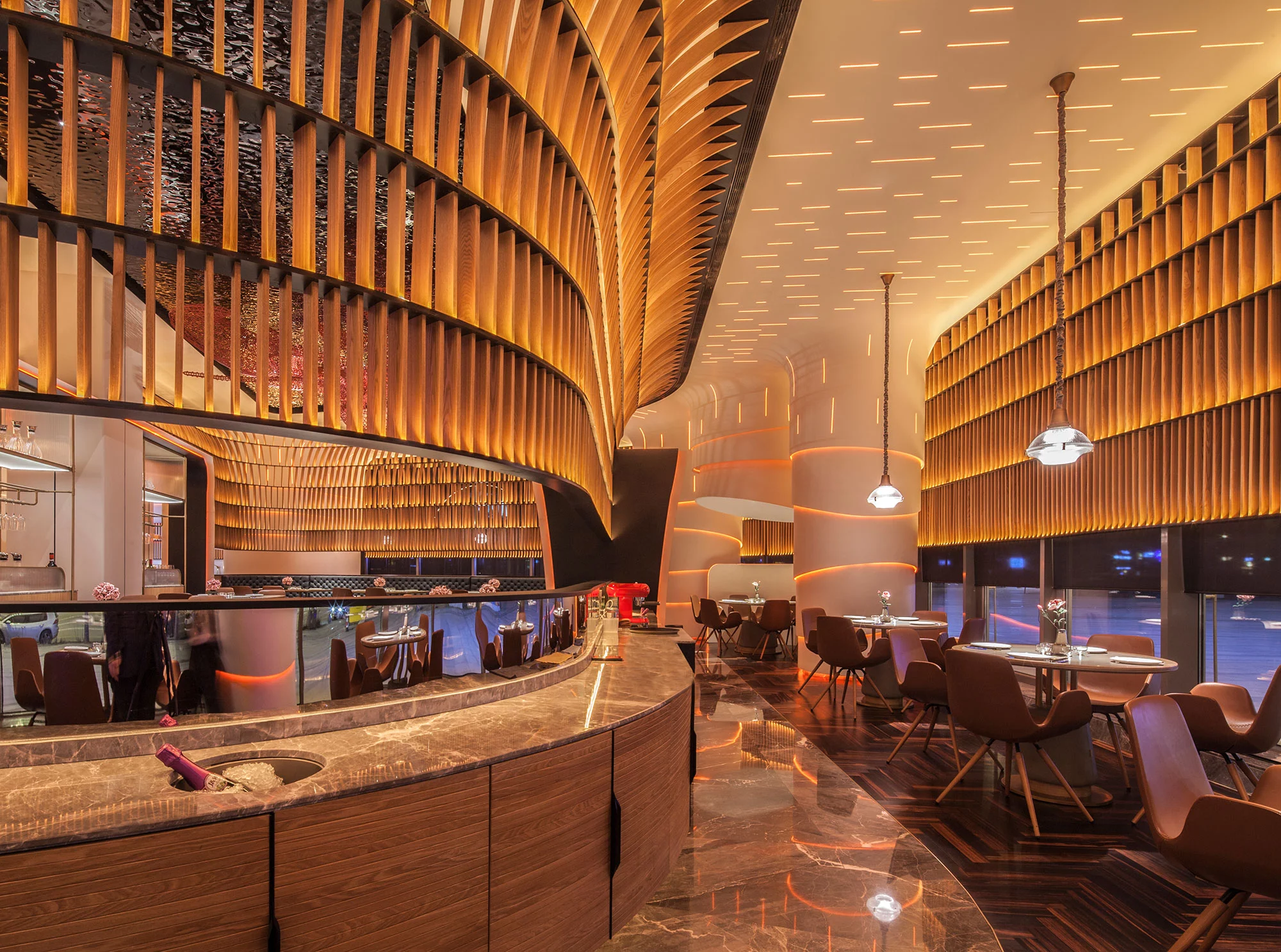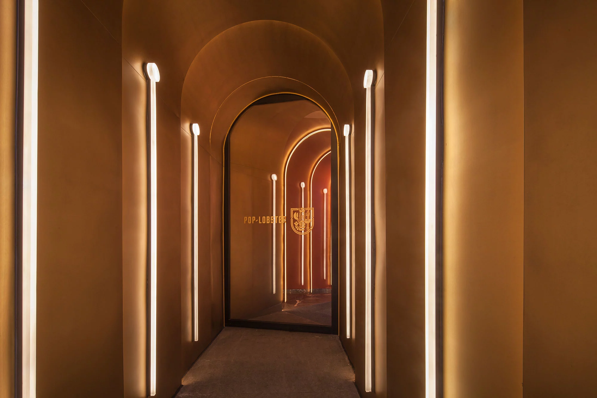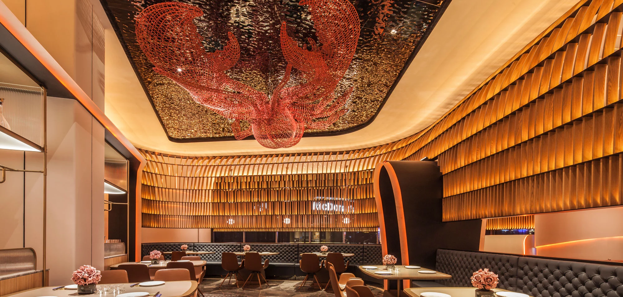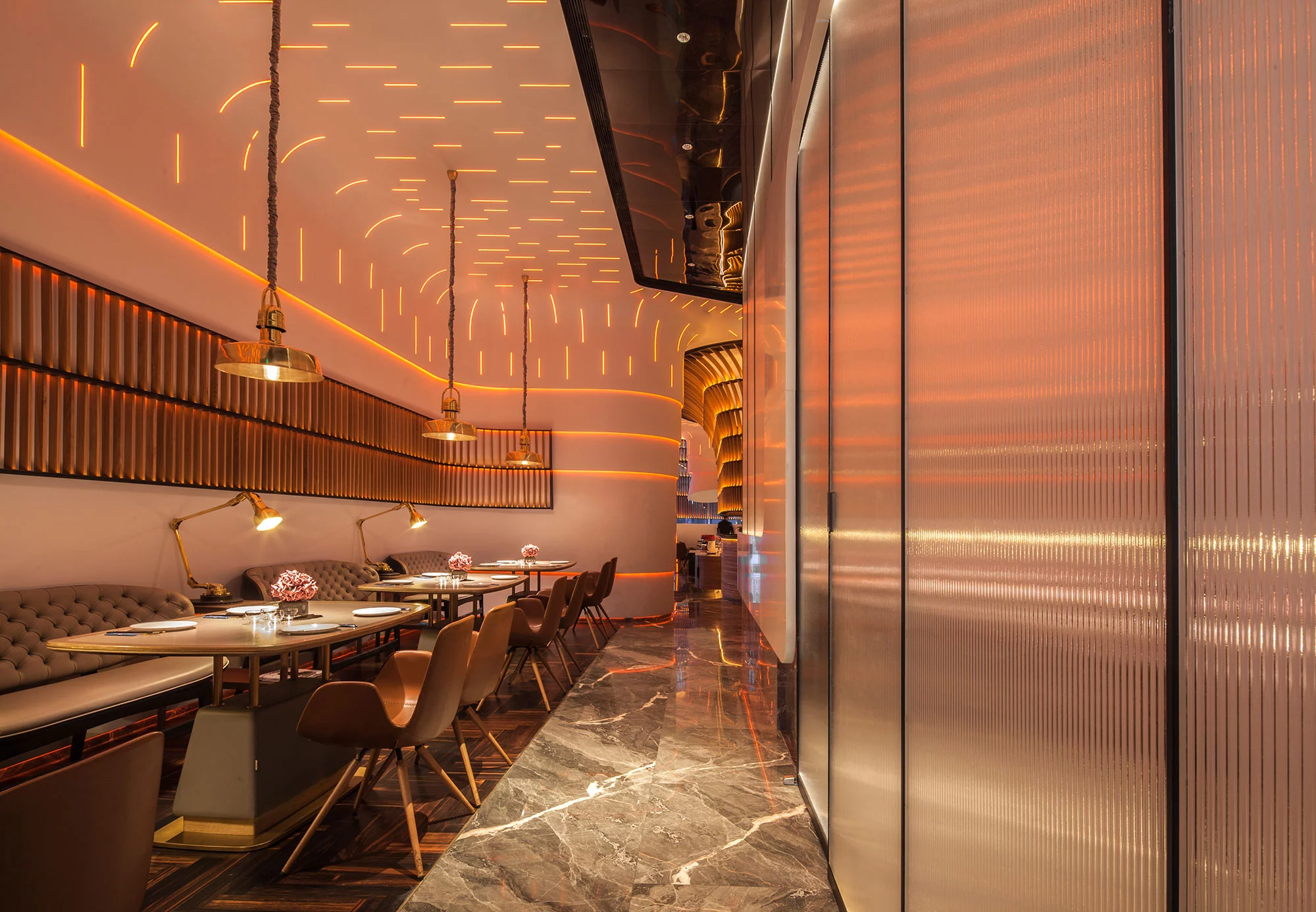 围绕龙虾元素,在棚上镶嵌装饰设计,突出餐厅主题特色。整体墙面造型以龙虾背为参照,层层叠加。龙虾背的曲线形状和墙面造型相吻合,空间层次变得丰富。随着行走的位移和变化,弧线引导人们逐渐探索,因为不同的区域设置了不同的功能,丰富了空间的层次和流线。另一方面,这种抽象的形式建构了和谐美、宁静美、生命力美和刚性美,释放了人们在自己的生活剧中所经历的情感冲击,也将空间展现的淋漓尽致。